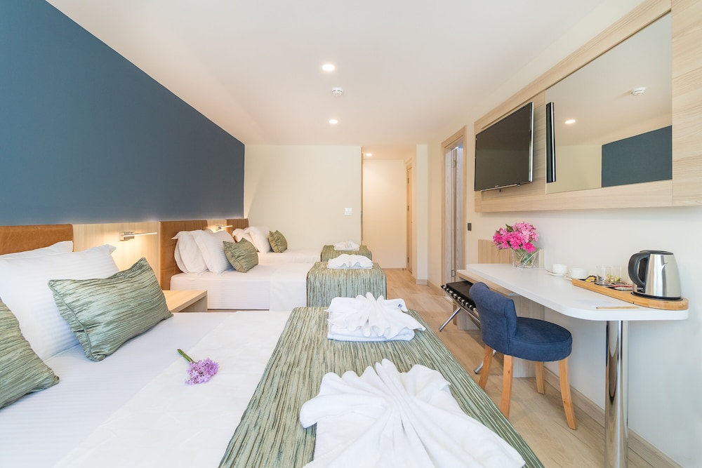Odalar gayet temiz kullanılan malzemeler kaliteli yemek takımlarından tutun banyo giderlerine kadar gayet özenilerek hazırlanmış bir otel. Yemekler bana göre çok lezzetli ve yemek fiyatları gayet makul,porsyonlar doyurucu,çeşit olarak kapasitesine uygun düzeyde yeterli,kahvaltı açık büfe çeşit bol her gün yeni sıcaklar çıkıyor. Oturma ve yemek yeme alanlarınız gayet sakin ve nezih kafa dinlemeye birebir.Denize yakın yürüyerek iki dakika merkeze aynı şekilde iki dakika. Plaj sadece otel müşterilerine ait.suyu çok temiz ve berrak.çalışanlar güler yüzlü ve memnun olmanız için ellerinden geleni yapıyorlar.Bütün çalışan arkadaşlara çok teşekkür ederiz kesinlikle tavsiye edeiyoruz.