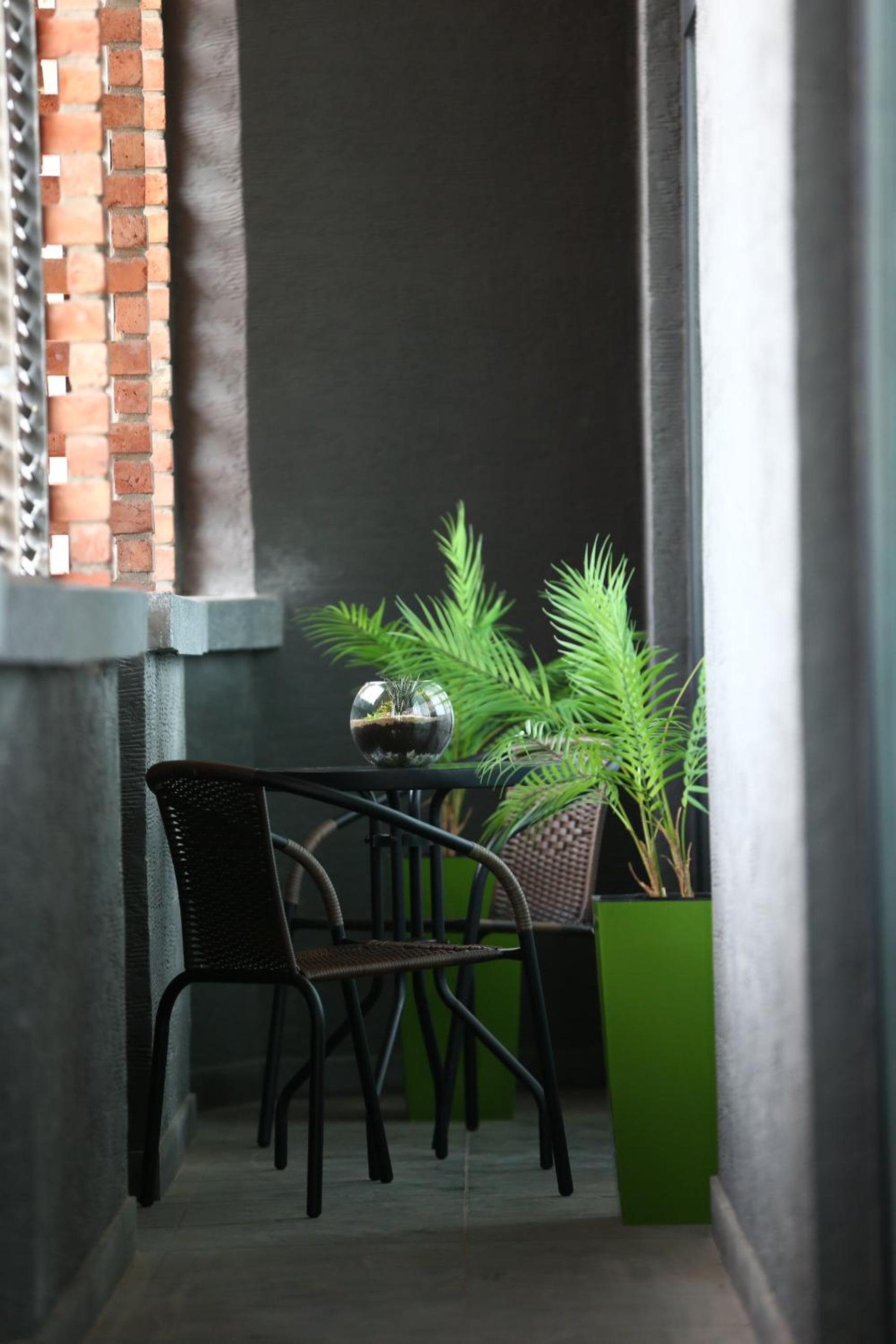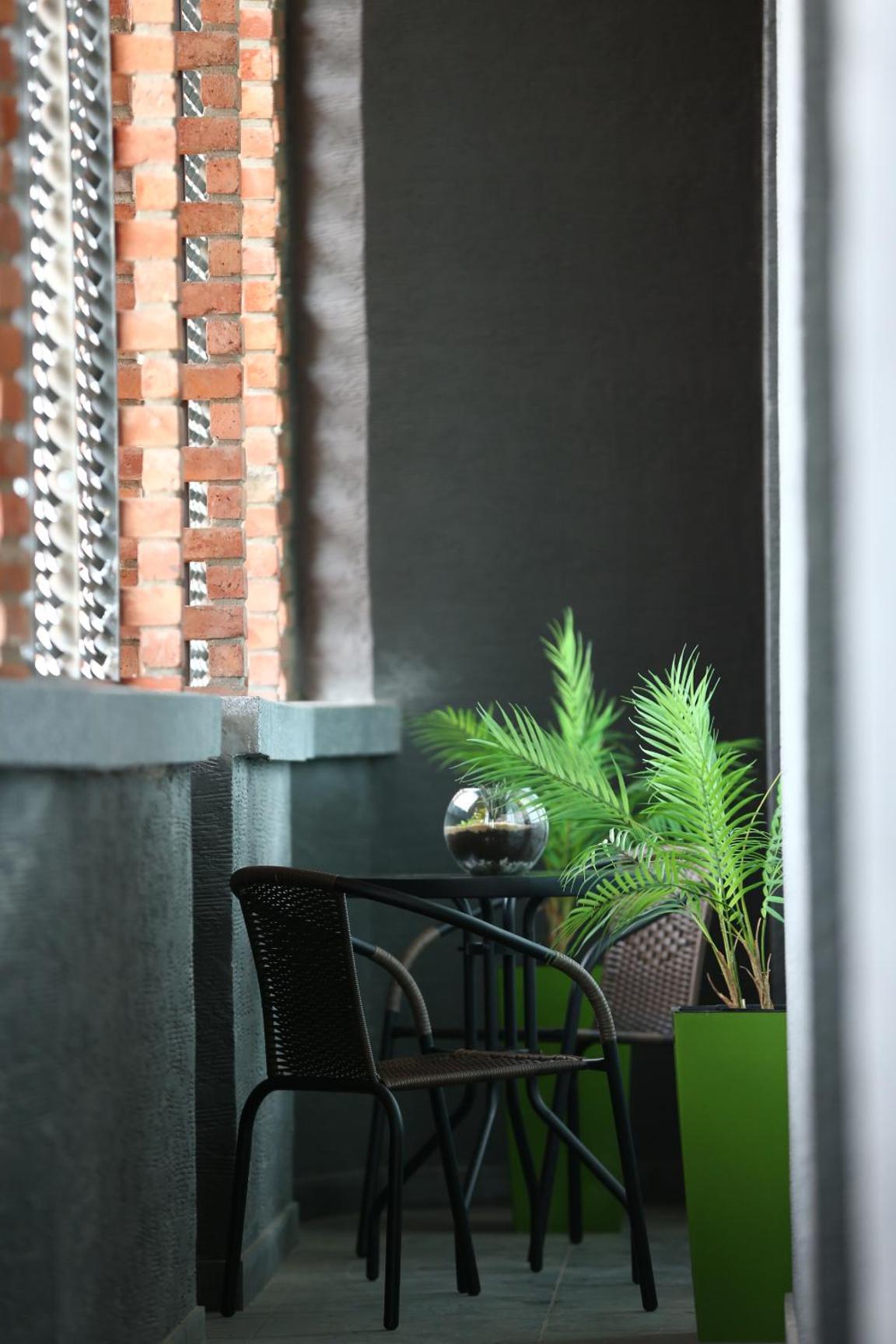В гостиной есть диван, стол для работы, чайник с чаем и кофе, а также холодильник. Для расслабления есть большой балкон с двумя стульями и столиком — в теплое время года это просто идеальное место для вечерних посиделок с бокалом вина.