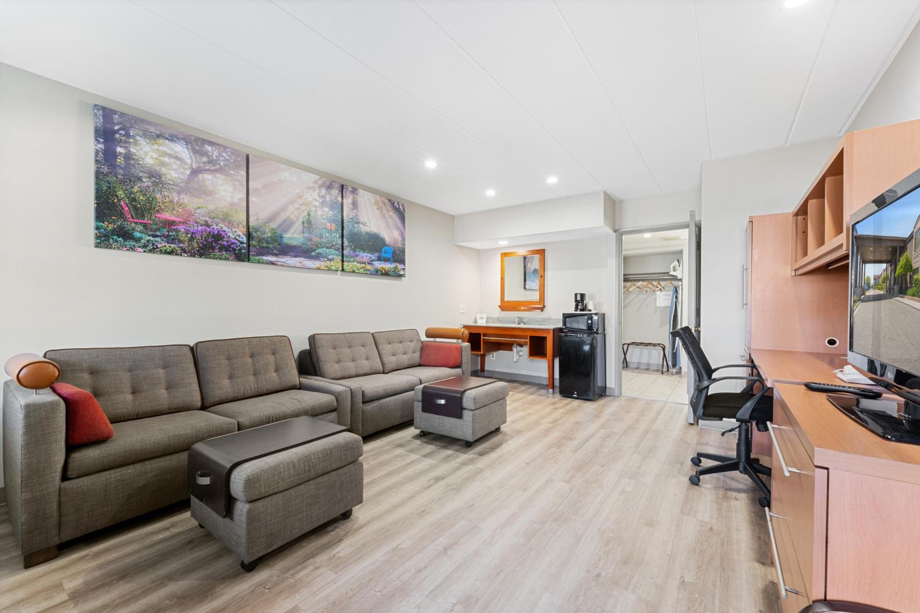 Each guest room at the Georgian Inn is equipped with cable TV, a refrigerator, a coffee maker, and a work desk, ensuring a cozy stay for all visitors.