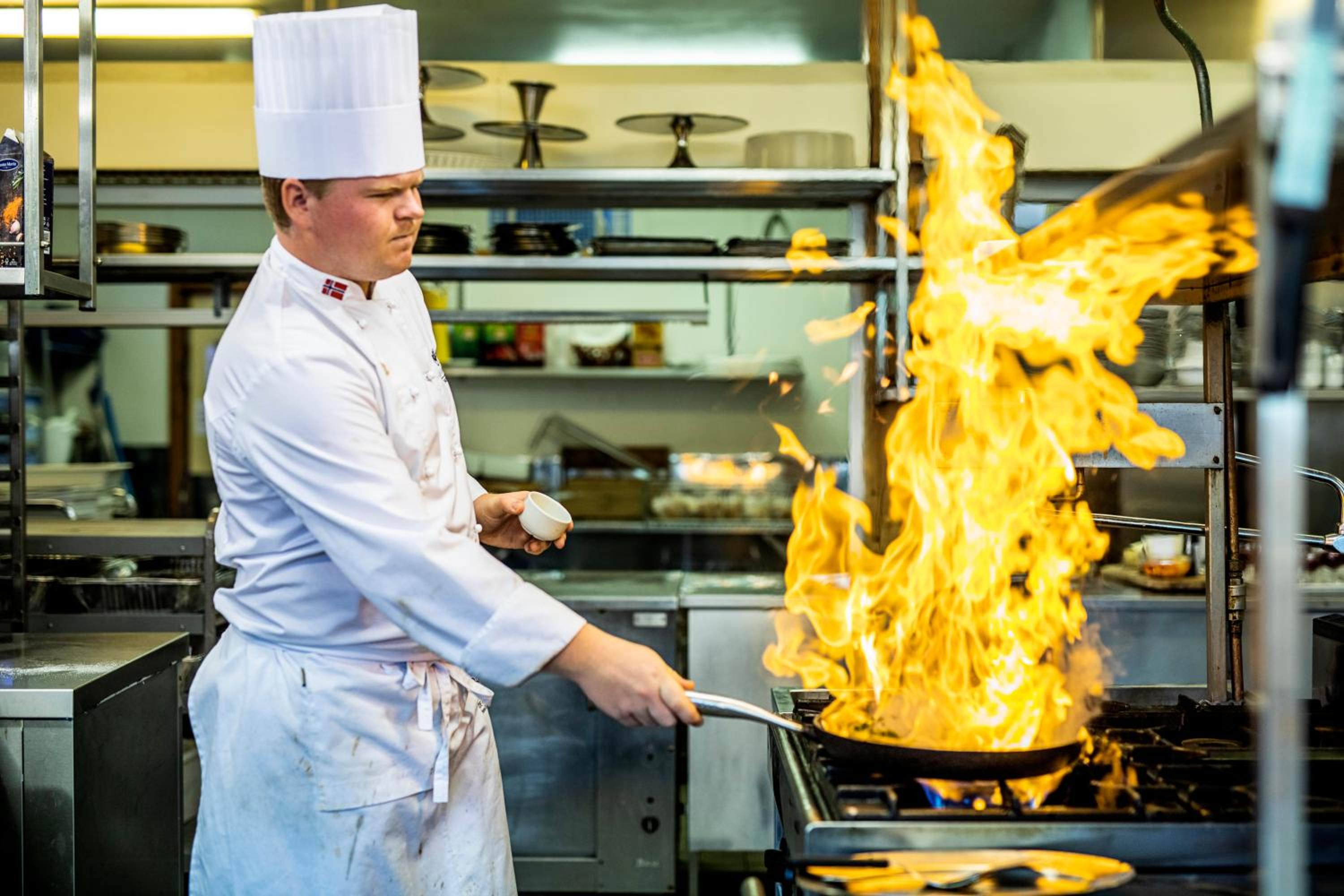 Vi spiste en nydelig 3 retter ved peisen i pianobaren pga få gjester. Veldig hyggelig opplevelse!
