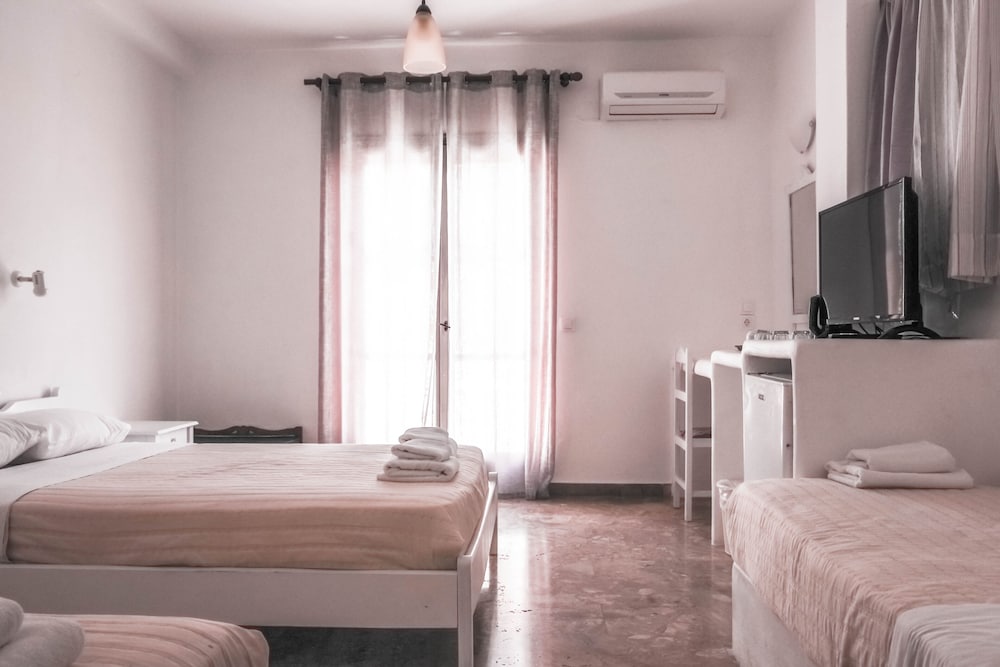 The hotel is about a 5 min walk from the bus stop which is very easy to use and about a 7 min walk to the closest supermarket. The staff are very helpful and are honest on the best places around. Gave us tips on the cheapest supermarket and the best food in kamari! The beach is close by around a 15 min walk with a variety of restaurants.