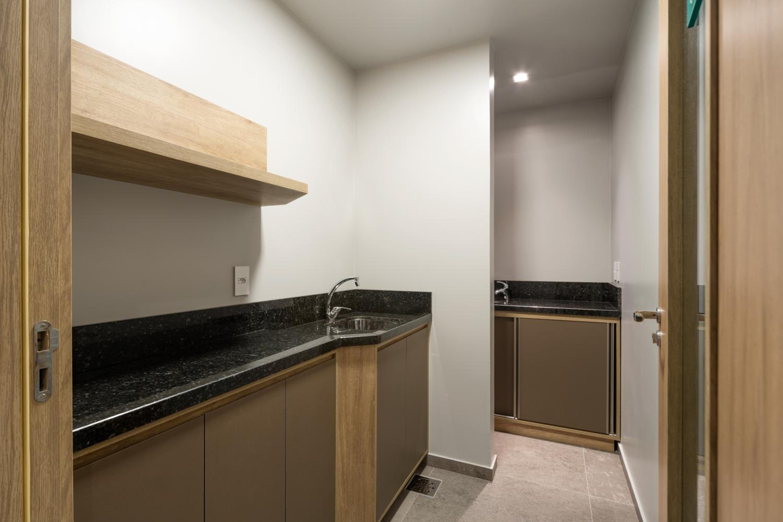 Espaço do quarto pequeno para mobilidade e também escuro, com apenas lâmpadas de cabeceira e lâmpada na entrada.