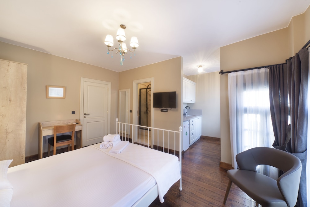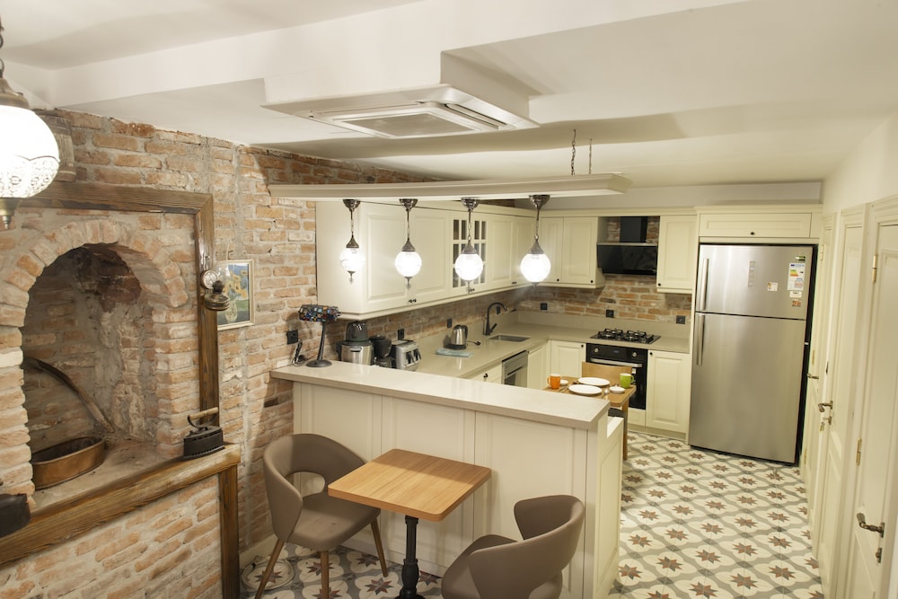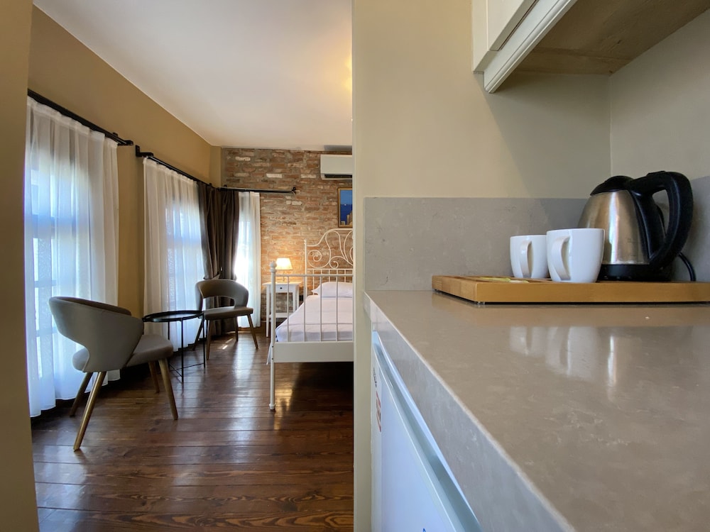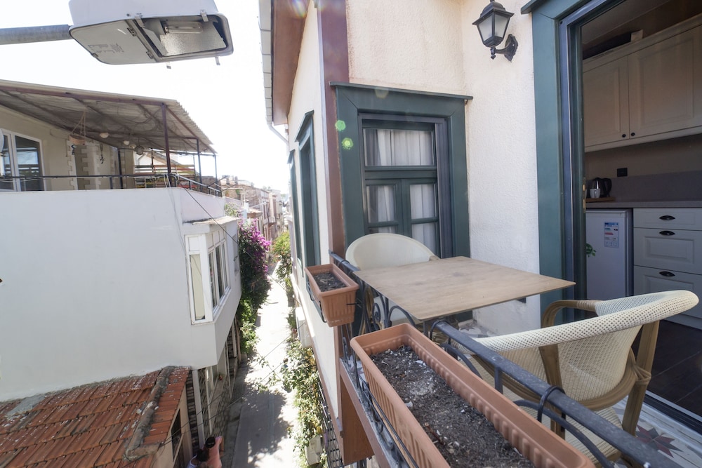 3 kişilik aile olarak seyehat ettik, merkezde olması bizim açımızdan iyiydi. Premier-suit-küçük mutfaklı odada kaldık, oda, yataklar, çarşaflar,havlular çok temizdi. Mutfak çok temiz, yeterli büyüklükte, pişirme imkanı yok ama salata,kahvaltı için yeterli. Balkon gündüzleri güneşli ama akşamları oturması keyifli. Çamaşır asacak yer olsa daha iyi olurdu. Oda yüksek tavanlı, perdeler ile karanlık oluyor, uyku için çok rahattı. Taş-ahşap karışımı olduğundan ferah ve konforlu. Balkon ve camlarda tel var, yani sineksiz uyunuyor. Klima yeri yatağın üstünde, ama kısa sürede odayı soğtup, kapatıp,rahatça uyuduk, gece hiç bunalmadık. Aylin hanım varış saatimiz geciktiği halde, bizi karşıladı. Çok ilgili, olması gereken mesafede, çok nazik biriydi. Tüm konaklamamız boyunca,ihtiyacımız olup olmadığını sordu ve hemen destek oldu. Sokak olarak mahalle arası hissi veriyor ama bu durum bizim hoşumuza gitti, sokakta insanlar oturuyor,çocuklar oynuyor geç saatlere kadar ancak nezih, hoş insanlar, dolayısıyla güvenli hissettik. Biz genel olarak çok memnun kaldık.