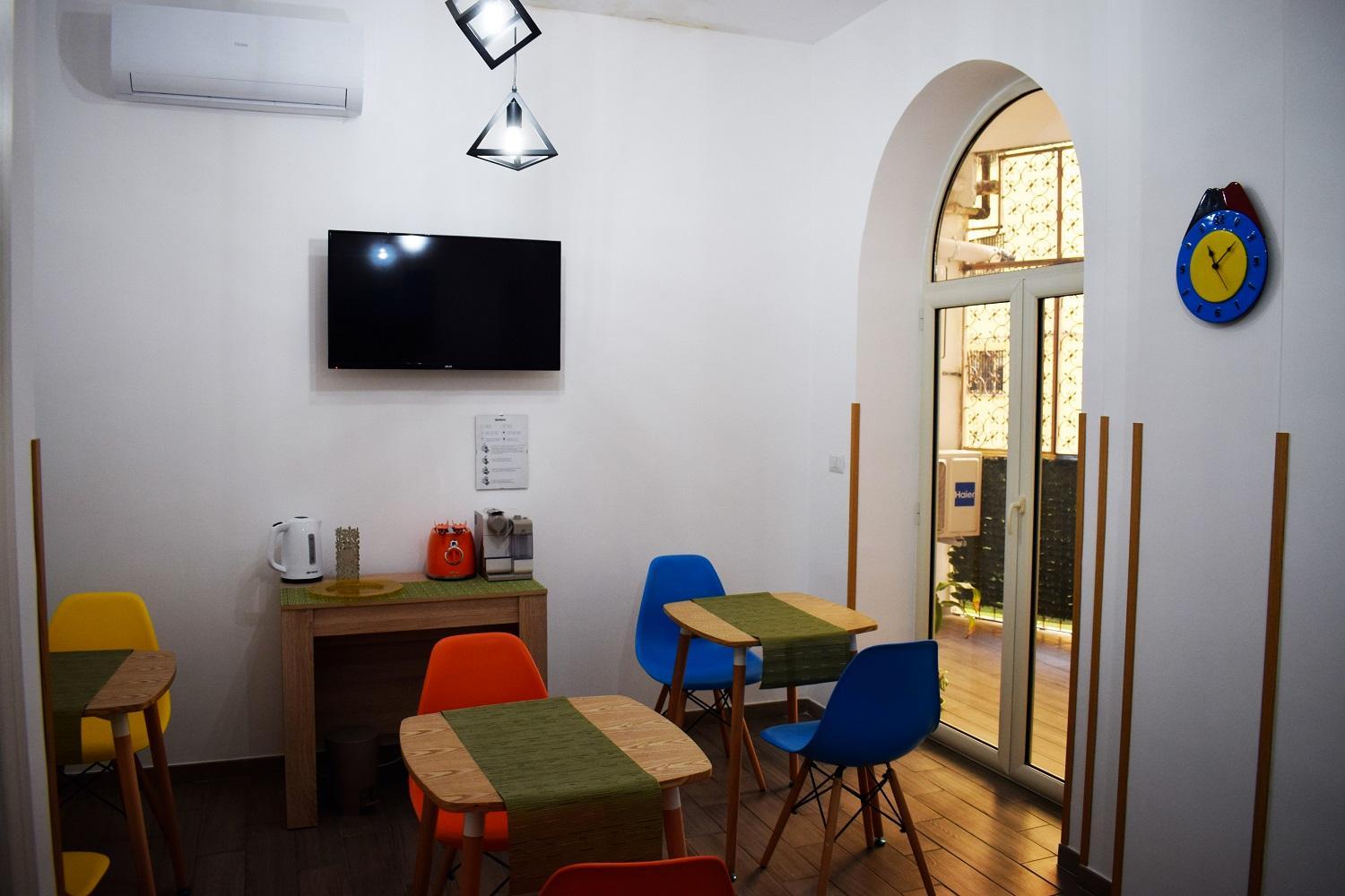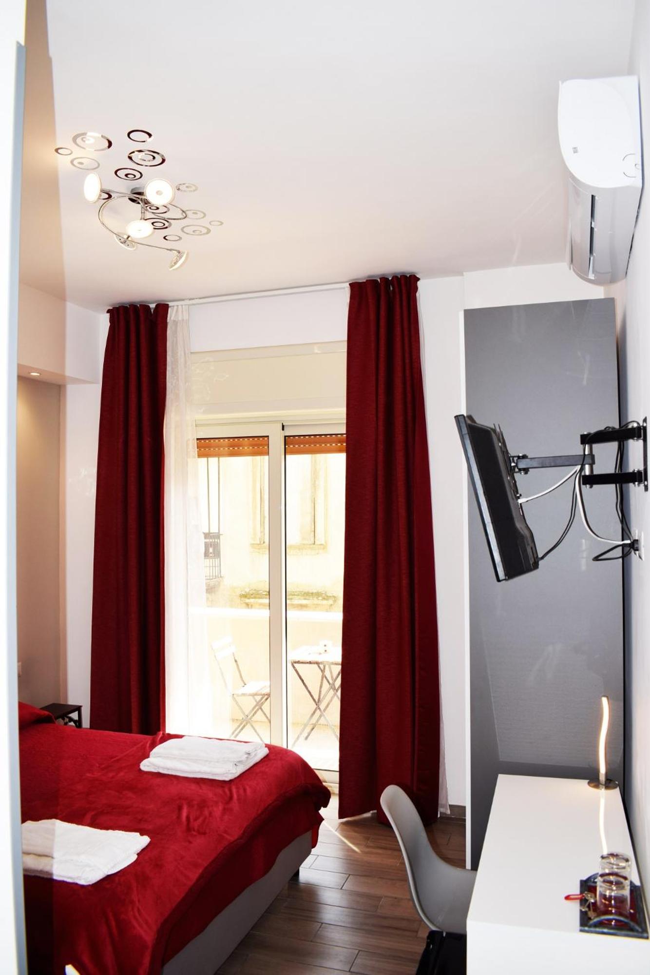 The units at Neapolis Pie are designed for comfort, featuring amenities like air conditioning, flat-screen TVs, and private bathrooms with a bidet and hairdryer. The added touch of a balcony provides a perfect spot to enjoy the cityscape.