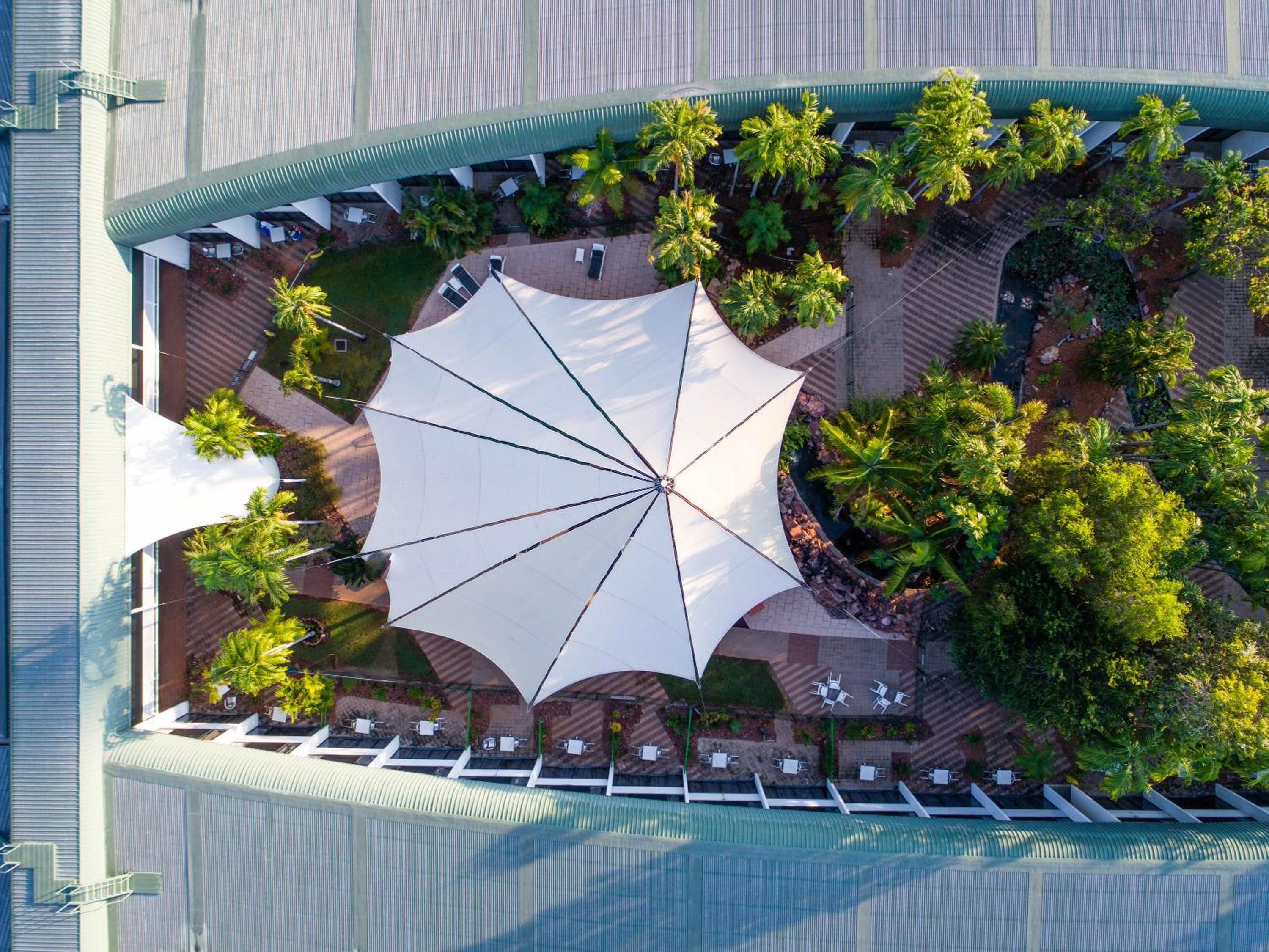 From the marble foyer to its uniquely shaped exterior, Mercure Kakadu Crocodile is a luxurious retreat in the wilderness of Kakadu National Park. The hotel features a central outdoor pool, surrounded by a landscaped courtyard, offering a serene and relaxing atmosphere for guests.