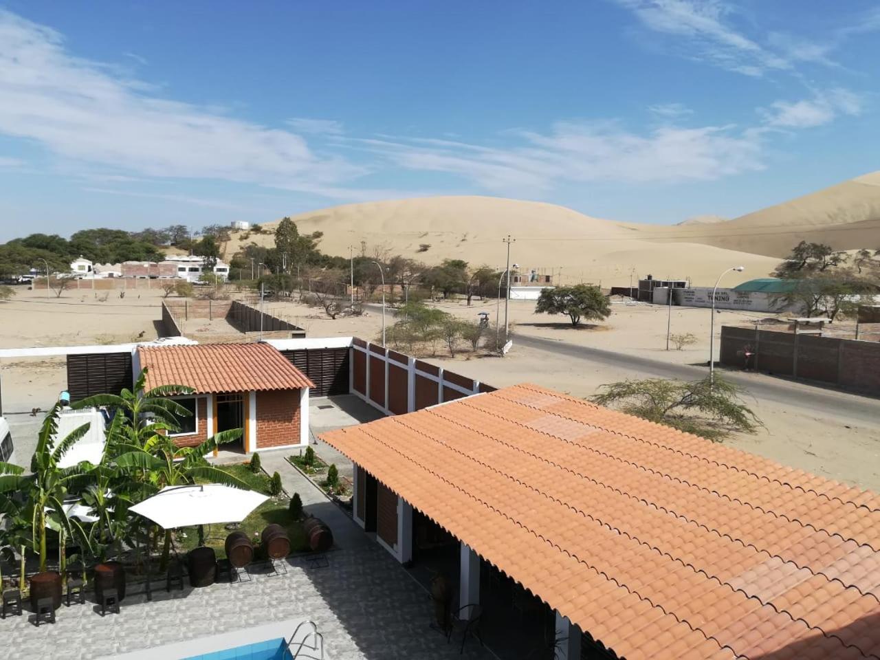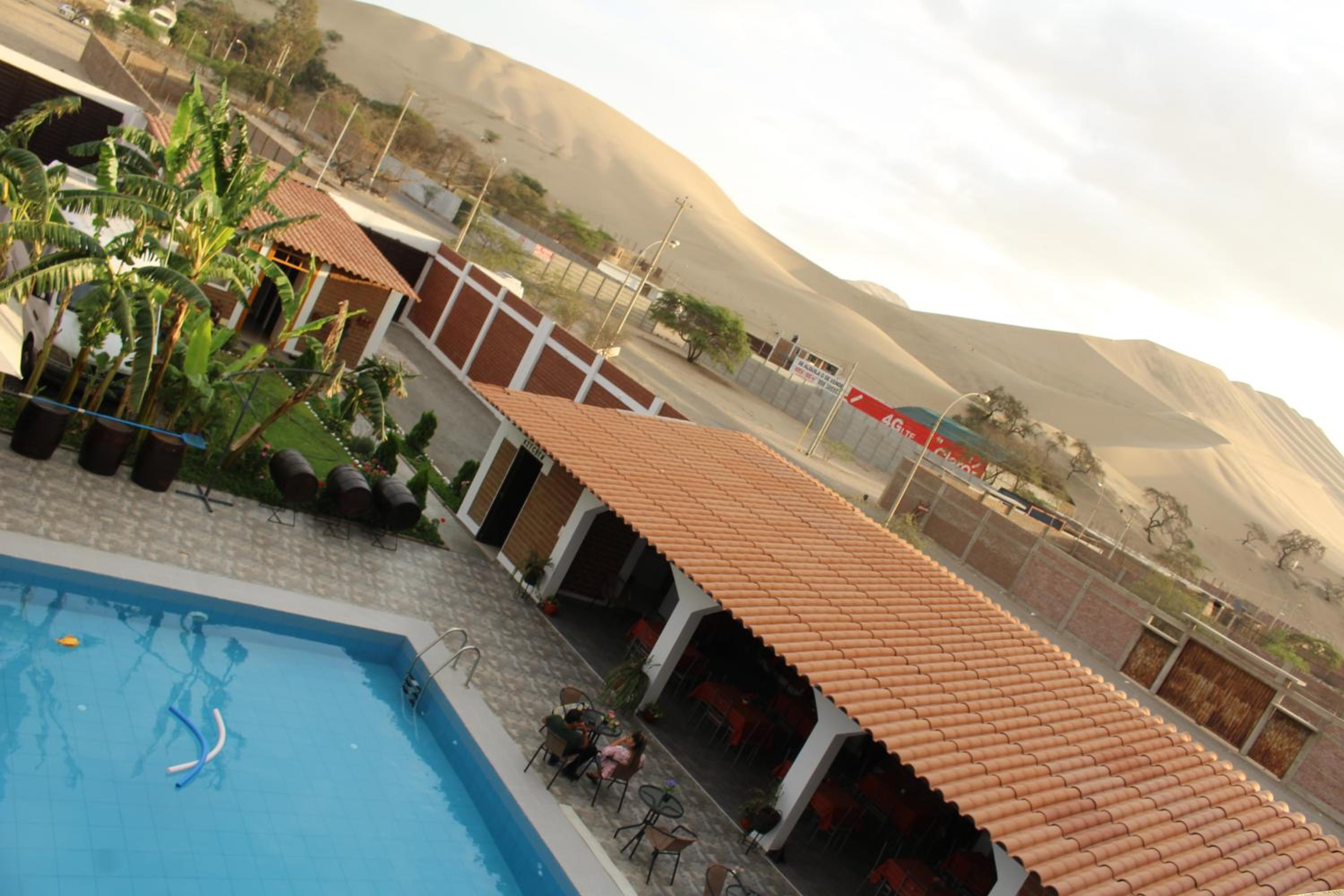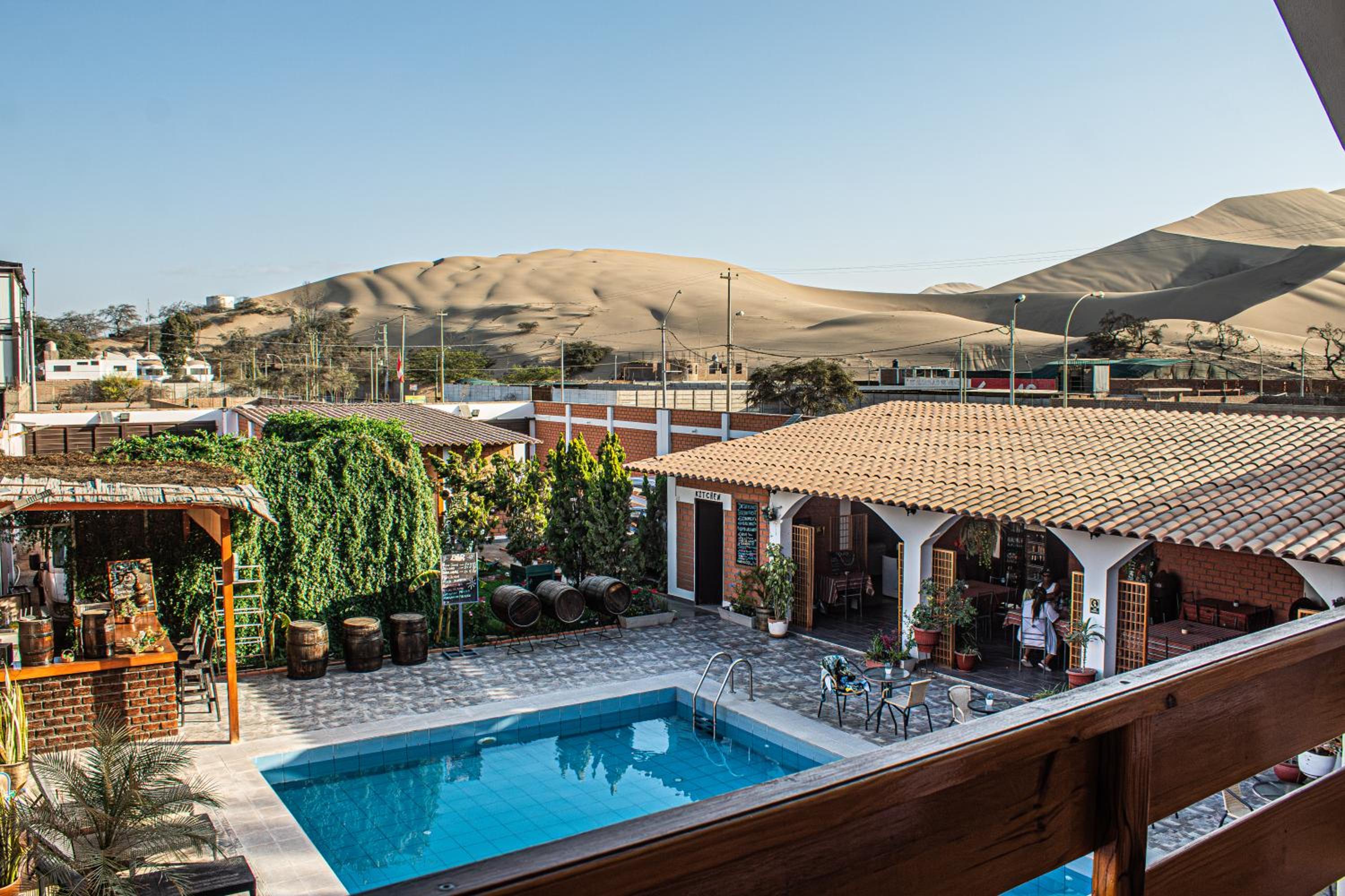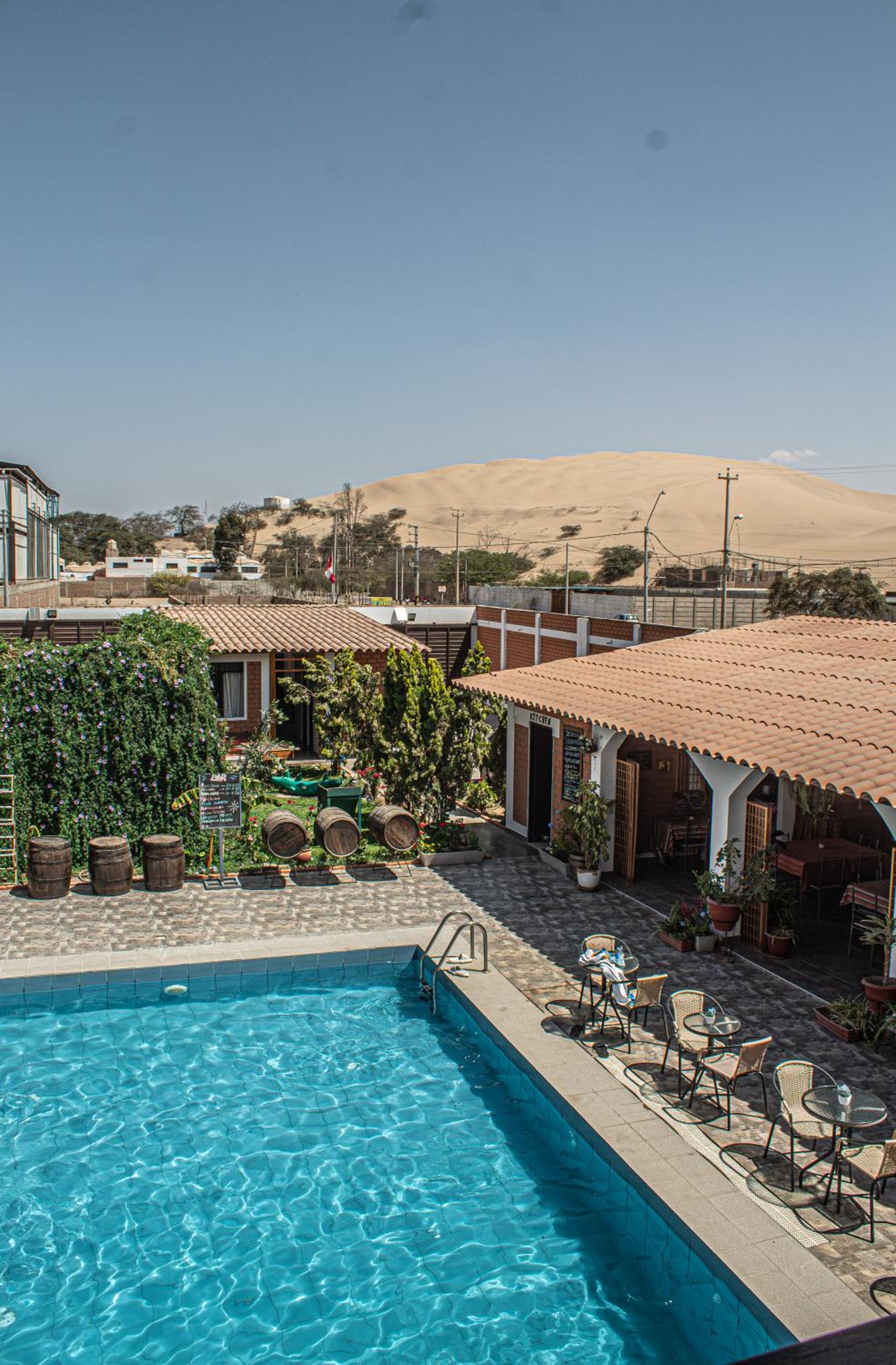 Piscine et espace extérieur très agréable avec vue sur les dunes sans être dans le frénésie de huacachina.