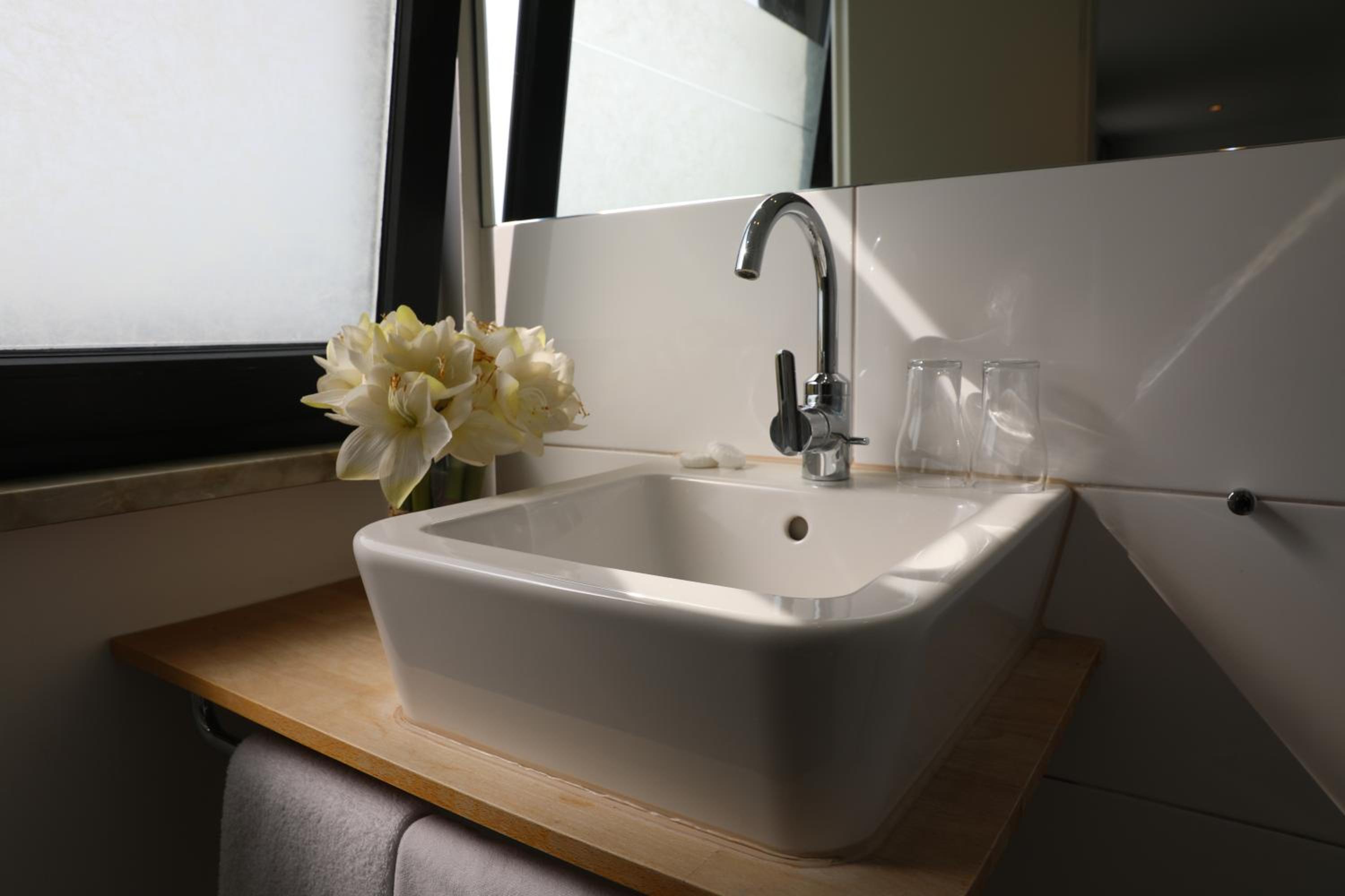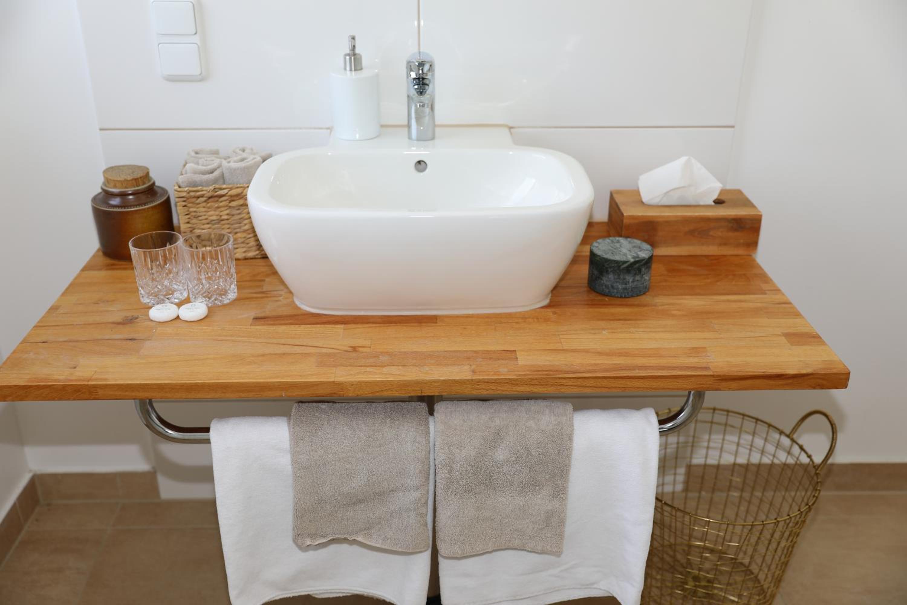 Das Badezimmer war modern eingerichtet, allerdings mit einer Glas-Schiebetür. Daher war es nicht möglich, nachts das Licht im Badezimmer anzuschalten ohne das komplette Zimmer zu beleuchten.