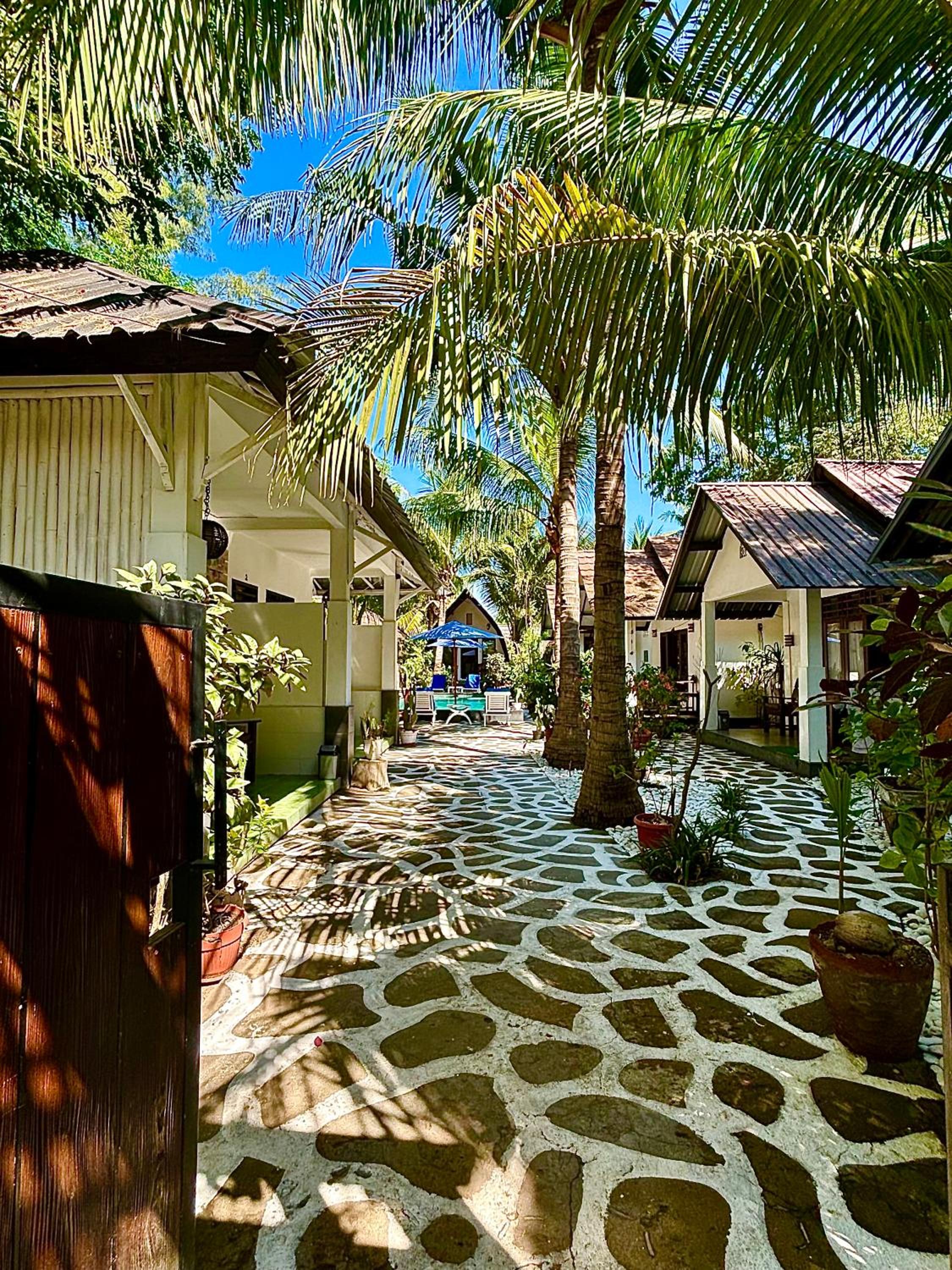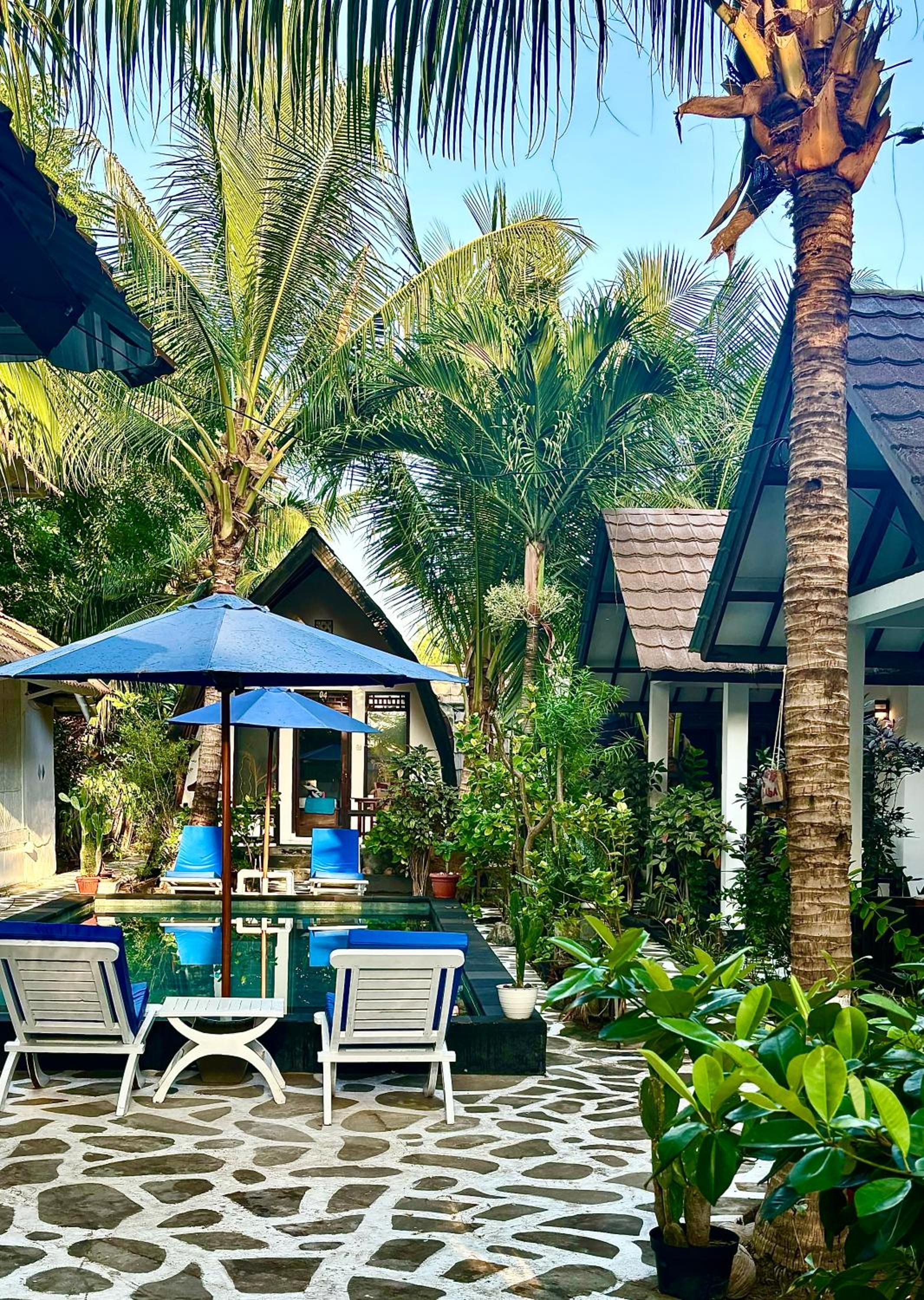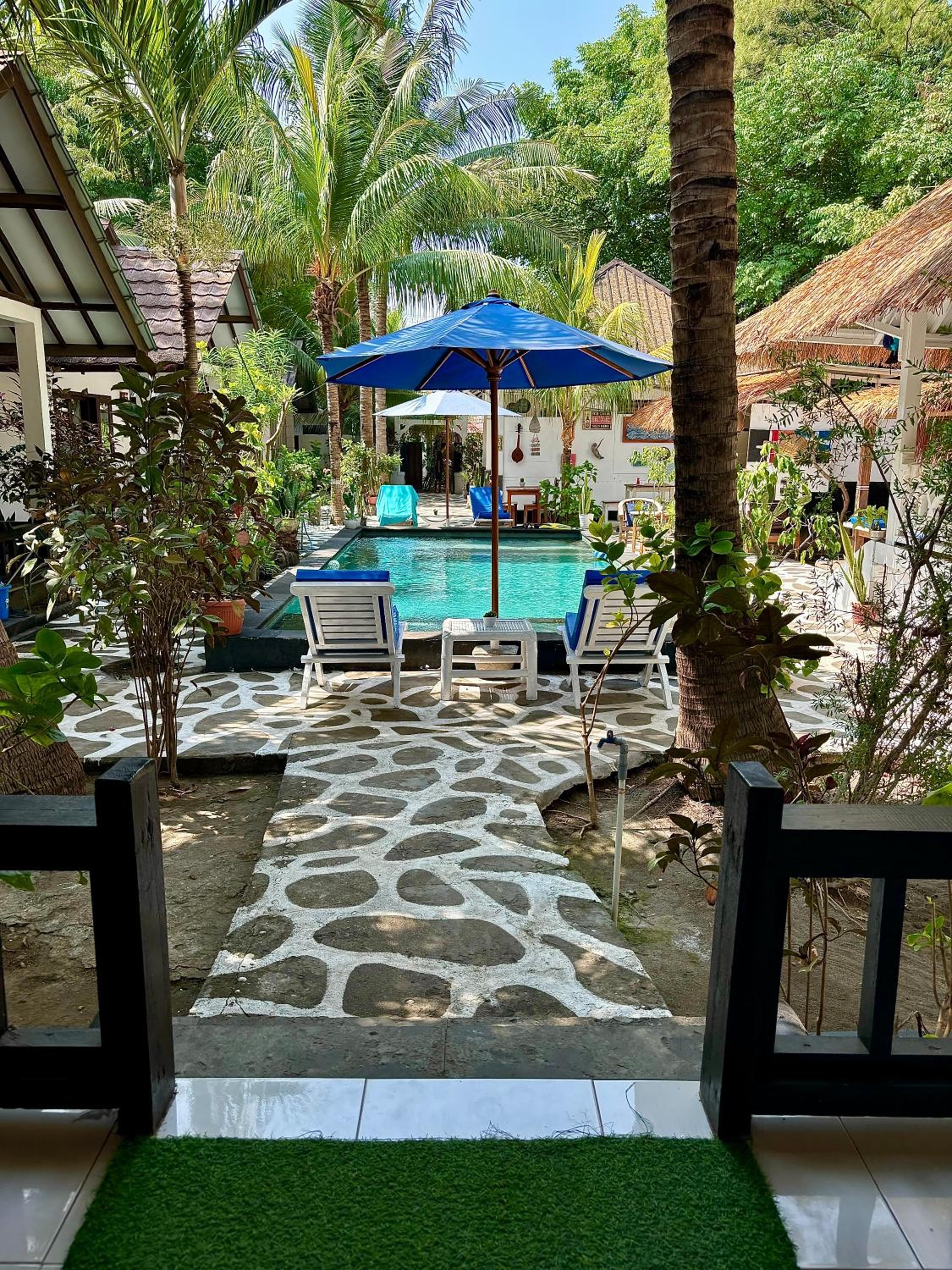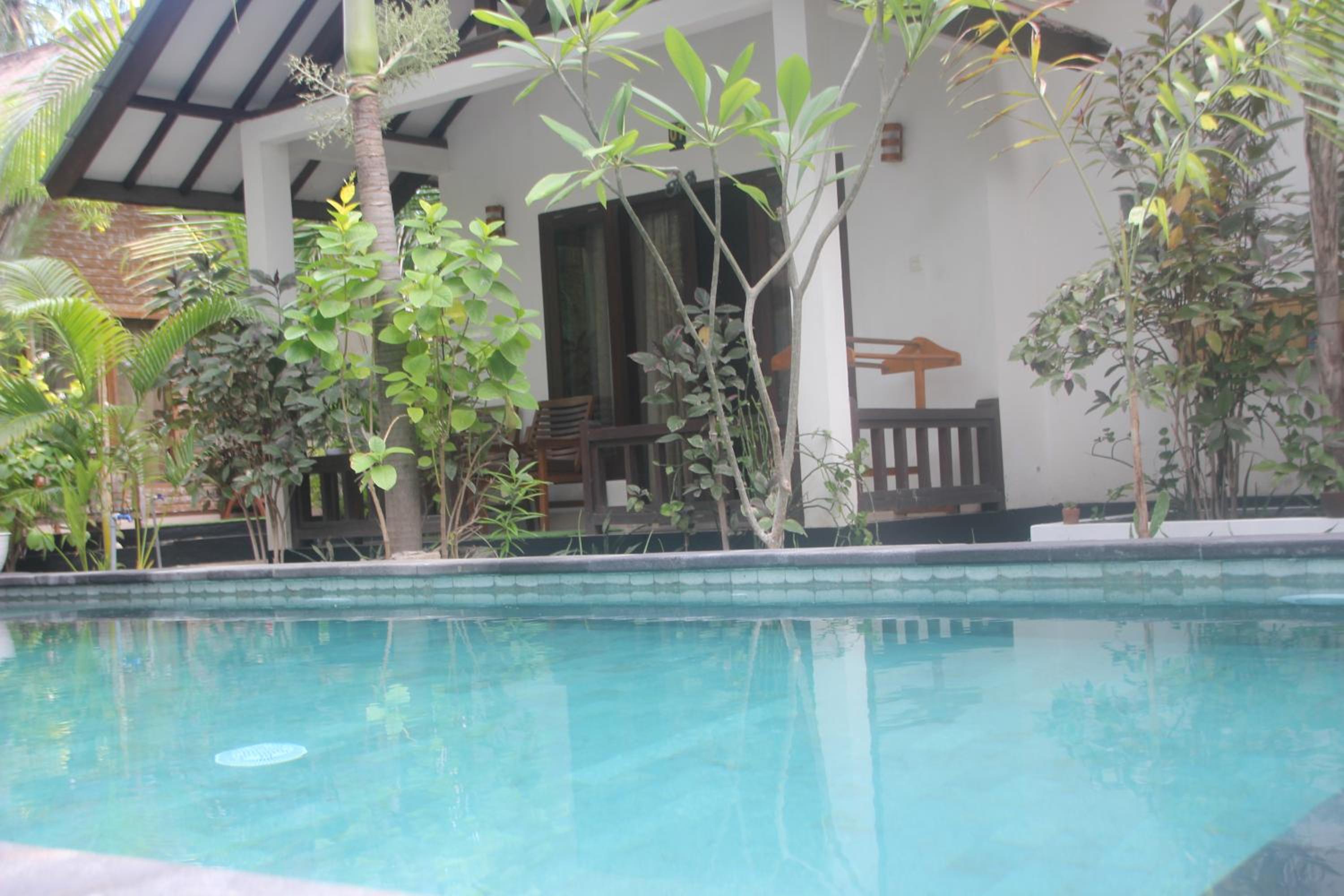 Great location right across from the beach but away from the harbour. Comfortable poolside bungalow that was cleaned every morning. Great cafe with a good breakfast. Mini fridge and lots of water. Hot water in the shower. Frendly family of cats