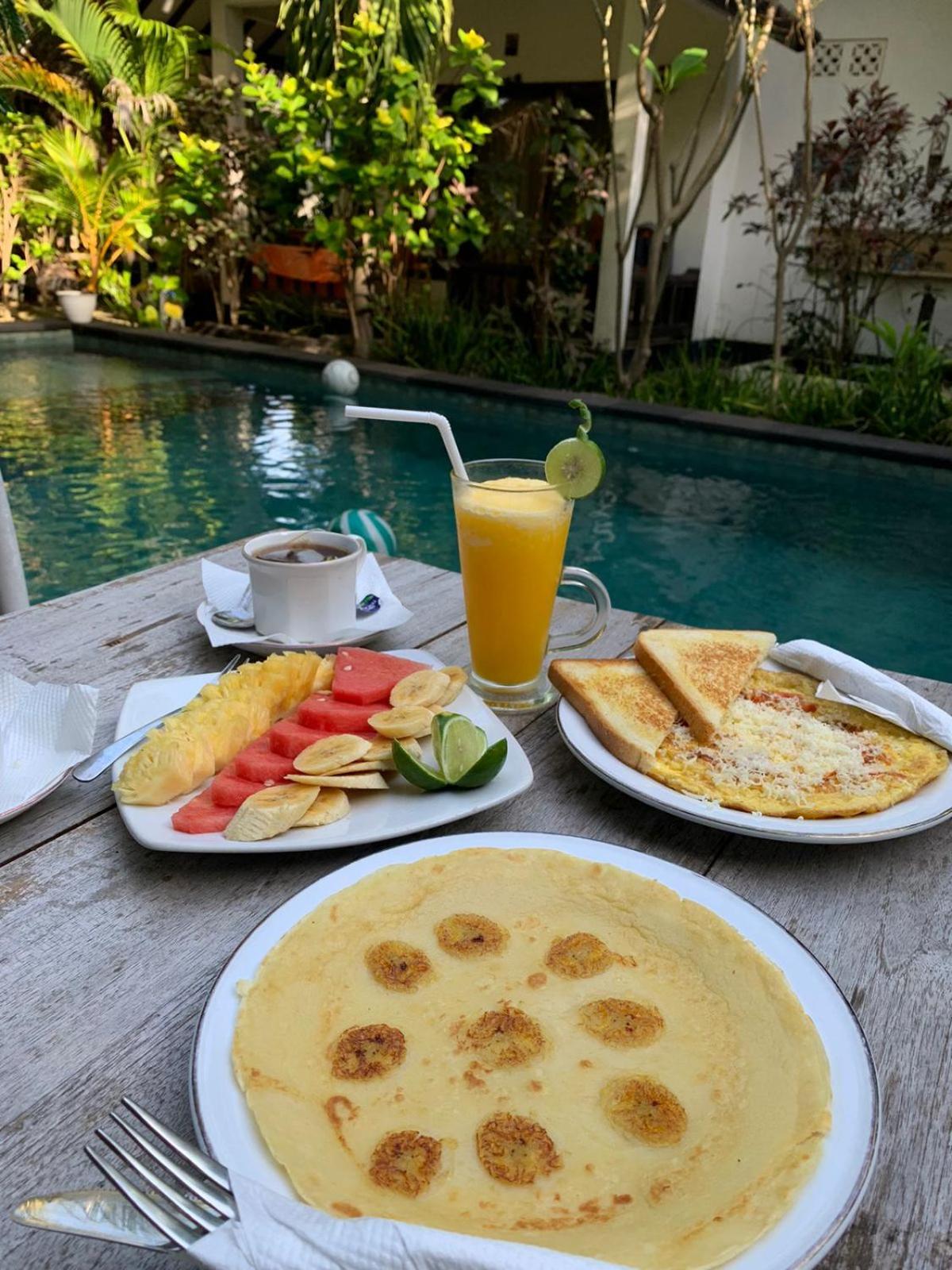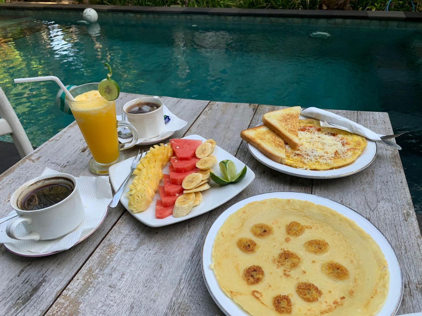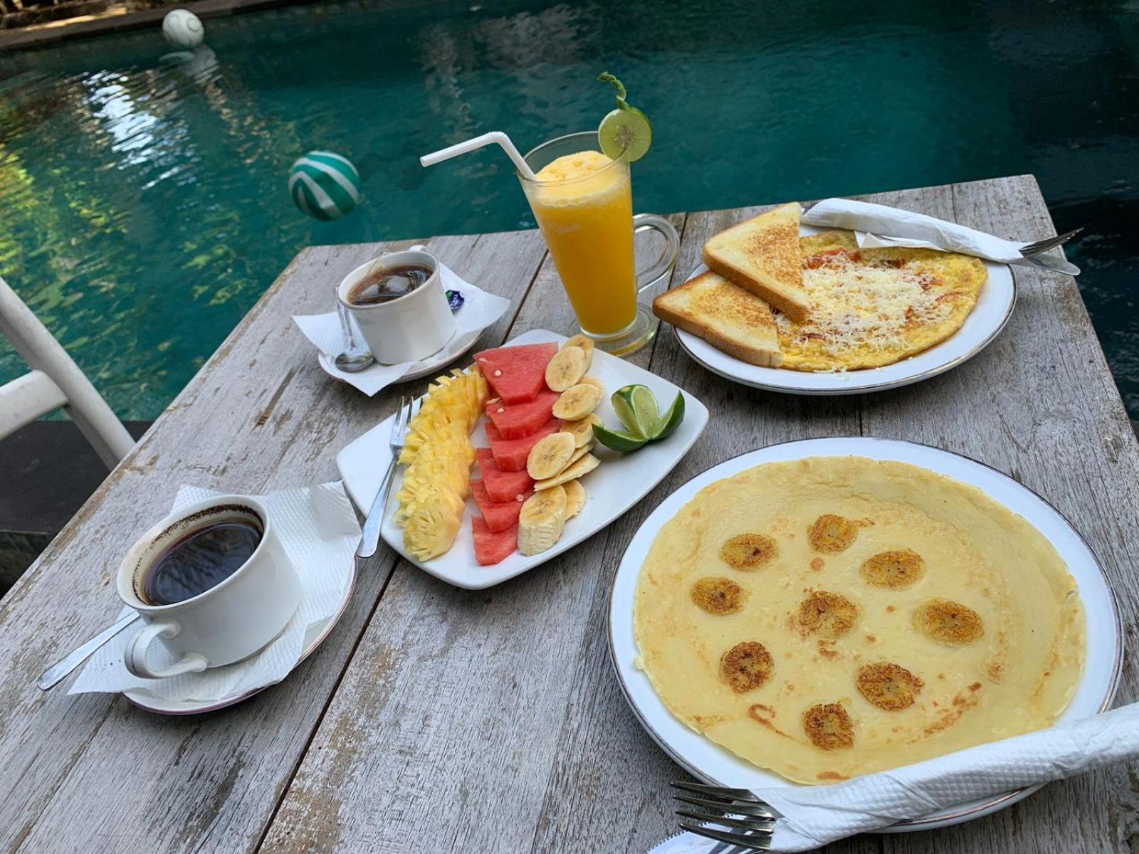 The location is on the beach, with breakfast included. The accommodations were basic, with everything we needed. The pool was down the path, and a very enjoyable, lovely setting with many shady trees around the complex, making it a very comfortable place to relax.