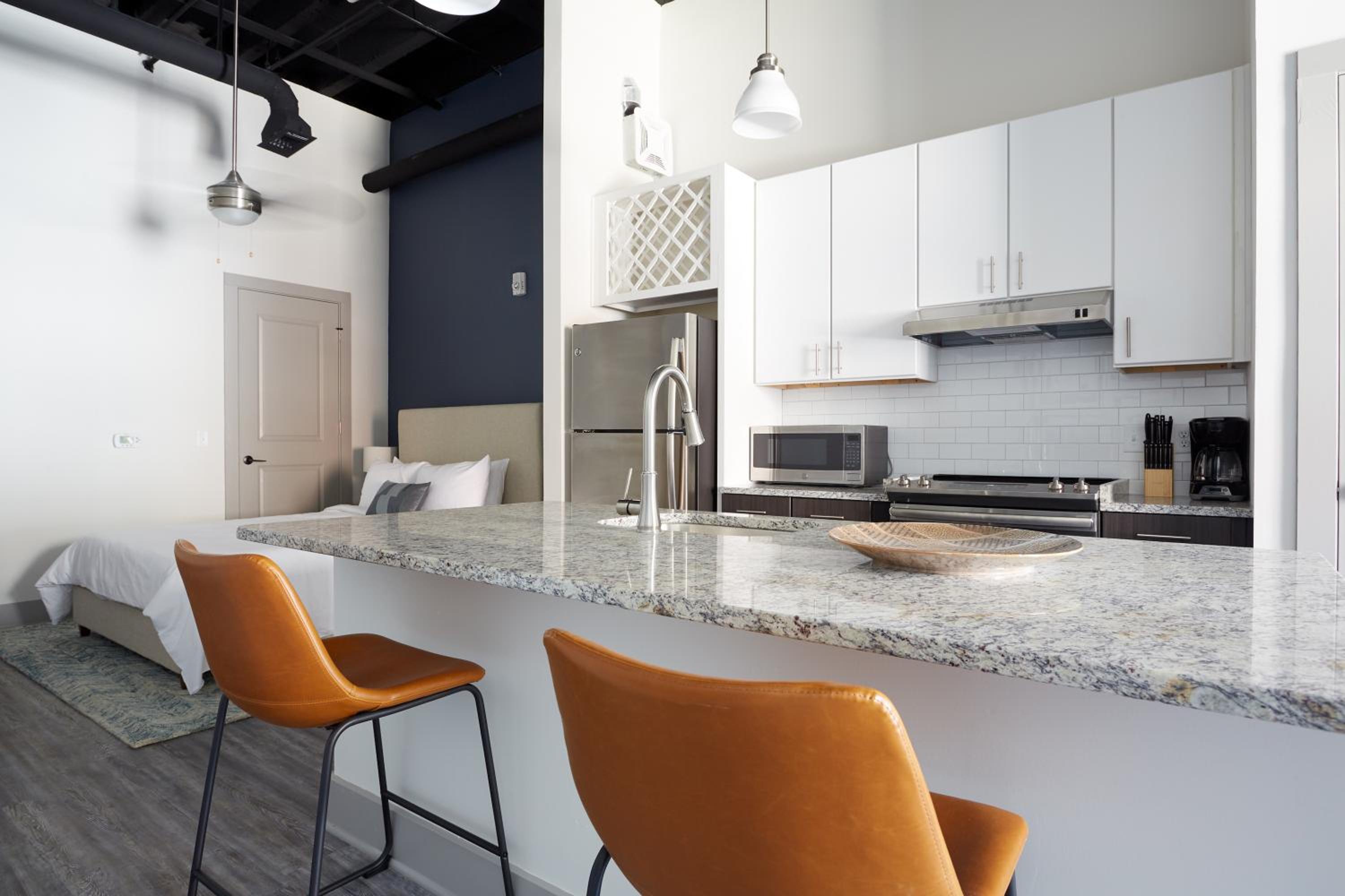 Home Away from Home: With thoughtful additions like a toaster, fridge, stovetop, coffee machine, and kettle, guests can relax and unwind in a comfortable setting. Book your stay at Sonder The Altmayer for a memorable Savannah experience.