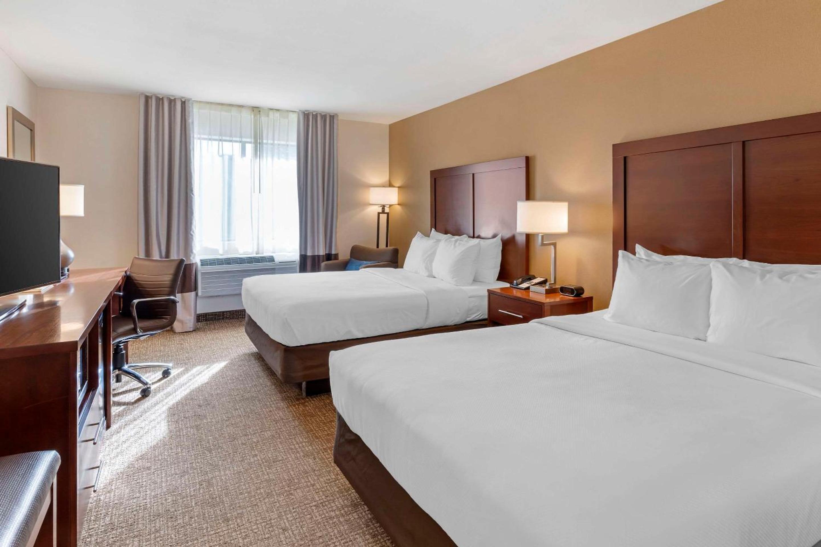 Guests can enjoy a range of amenities including flat-screen TVs, a fitness center, sauna, and a Grab 'n Go breakfast featuring a variety of delicious options to kickstart your day.