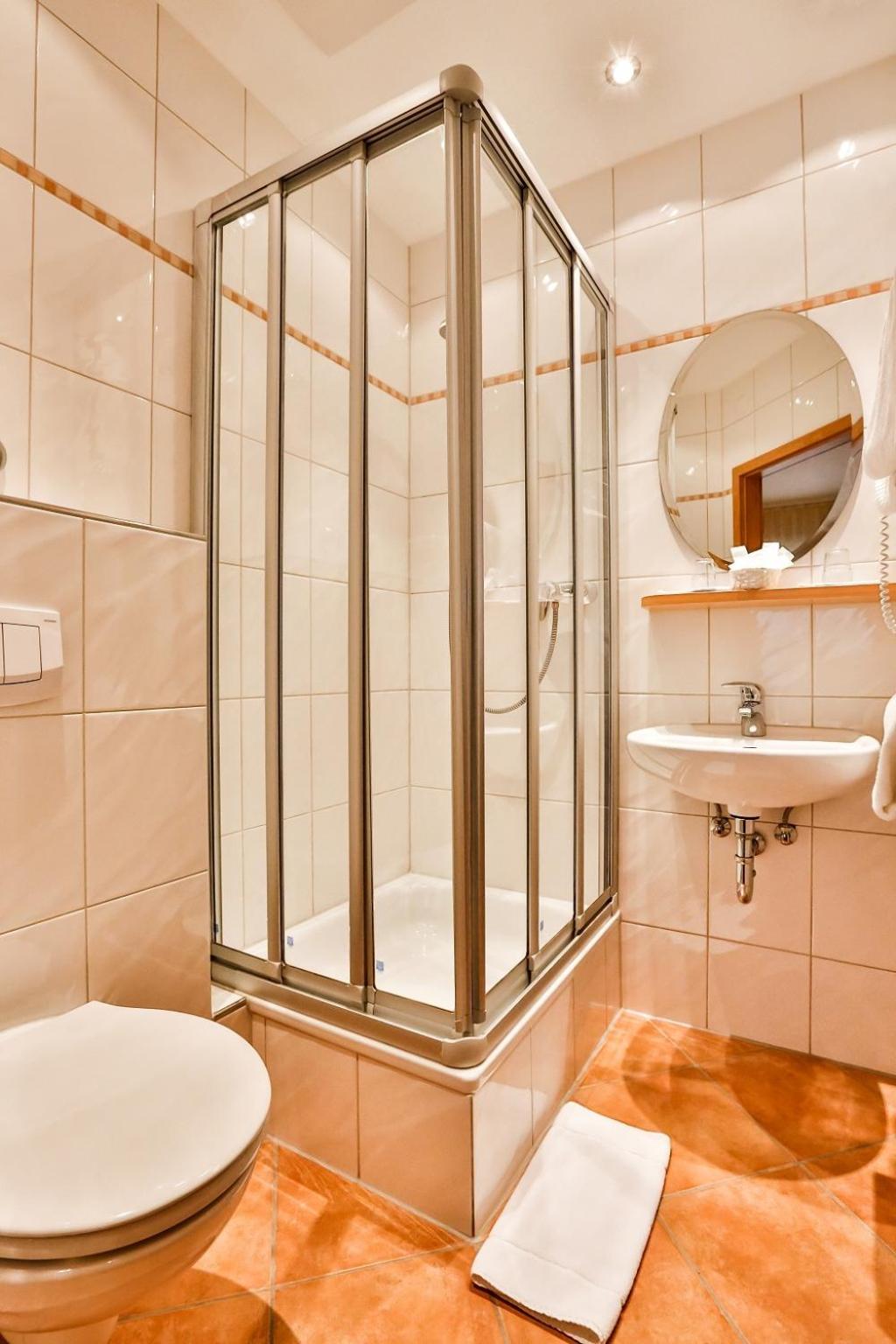 Die Tür der Duschkabine könnte ein bisschen besser eingestellt sein. Entweder sie wölbt sich in geschlossenem Zustand nach innen oder nach außen - beides nicht ideal.