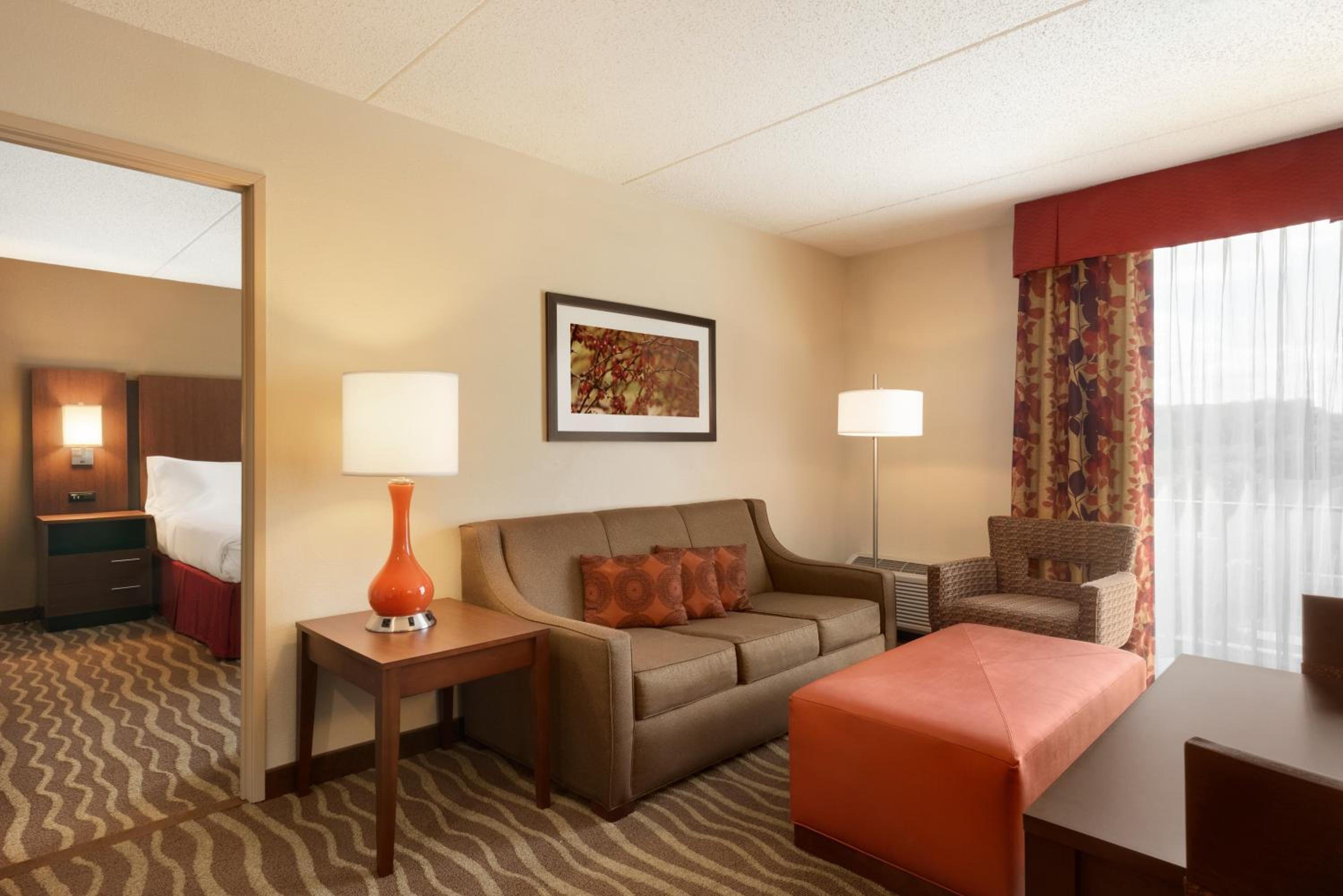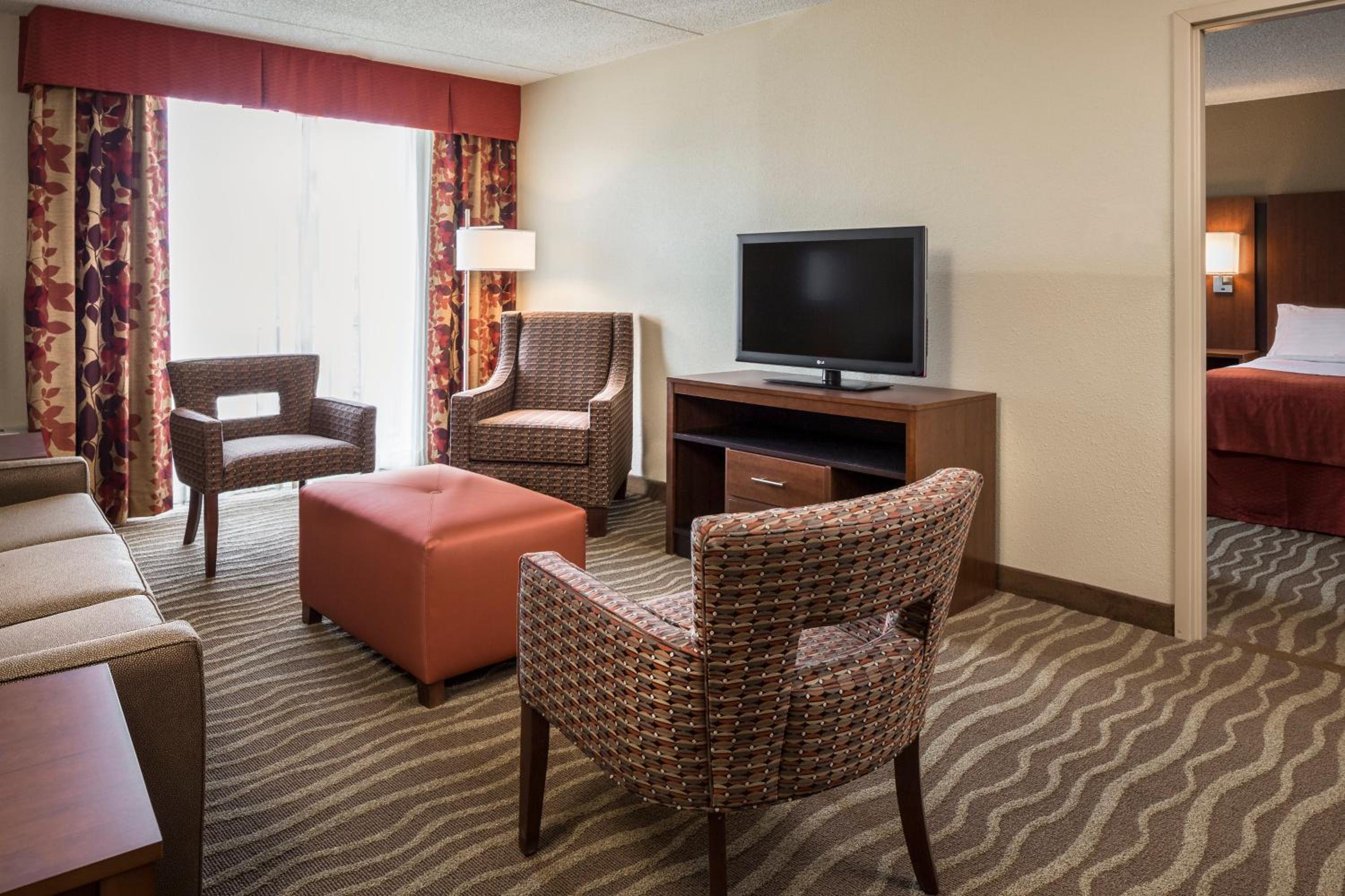Each room is equipped with a 37-inch flat-screen TV, coffee maker, and work desk for your convenience. Upgrade to a suite for additional space and amenities like a microwave and refrigerator.