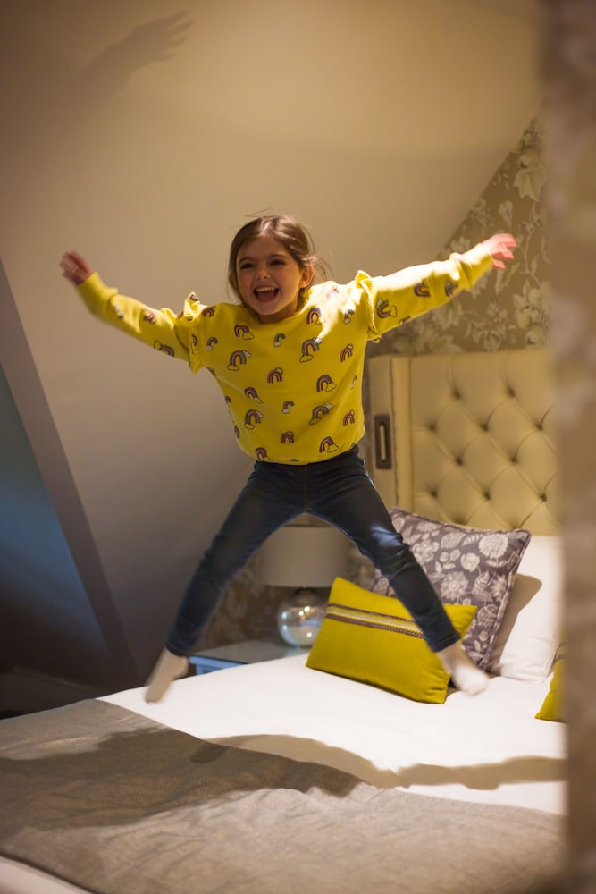 There was a large red & brown stain on the carpet of our room which looked suspiciously like blood; this was supposedly one of the newer refurbished rooms. There were also stains all over the walls and a white substance on the phone receiver. Really disgusting. No robes in the cupboards (available to rent for £7!), no fridge, no room service menu. No aircon and the rooms get extremely hot in the day as they have skylights; so if you want to keep it cool the room must be entirely blacked out. Overall an unpleasant stay. The spa is just a tepid pool with dirty floors. Definitely not a 4* spa hotel as advertised. The standard of the bathrooms in particular is really poor - cleaner than the carpets; but equipment that looks about 20 years old. A dribbling shower and a bath with mdf peeling off the sides. If they upgraded the top floor rooms with aircon and refurbished the bathrooms this would be a much more pleasant experience - but it was overall unpleasant and oppressive. Small upside is that the family rooms are large - they would be ok in winter when you can keep the blinds open; but sitting in a blacked out hot dirty room is not our idea of a relaxing stay. We spent as much time as possible out of the hotel. We did complain about the disgusting carpets - no attempt was made to make it up or compensate us; although they did move us to a hotter room with a worse bathroom but newer carpet. All in all not recommended! The general vibe in the public areas was “Wetherspoons chic”