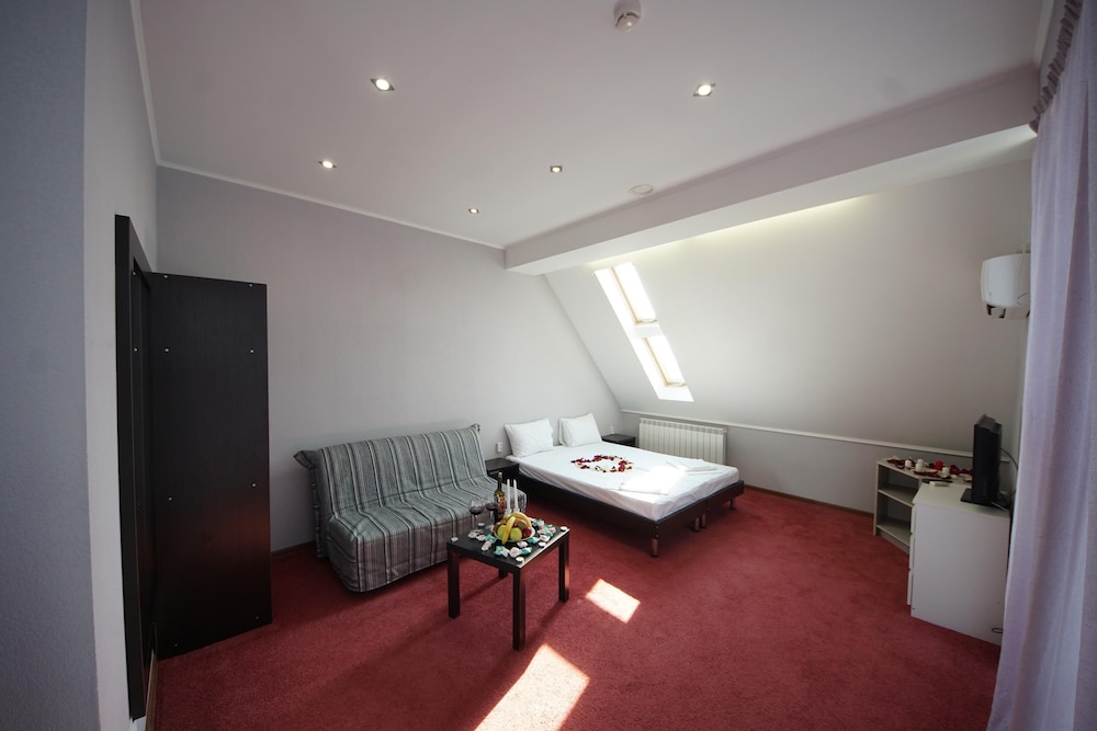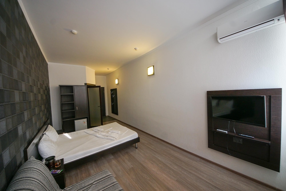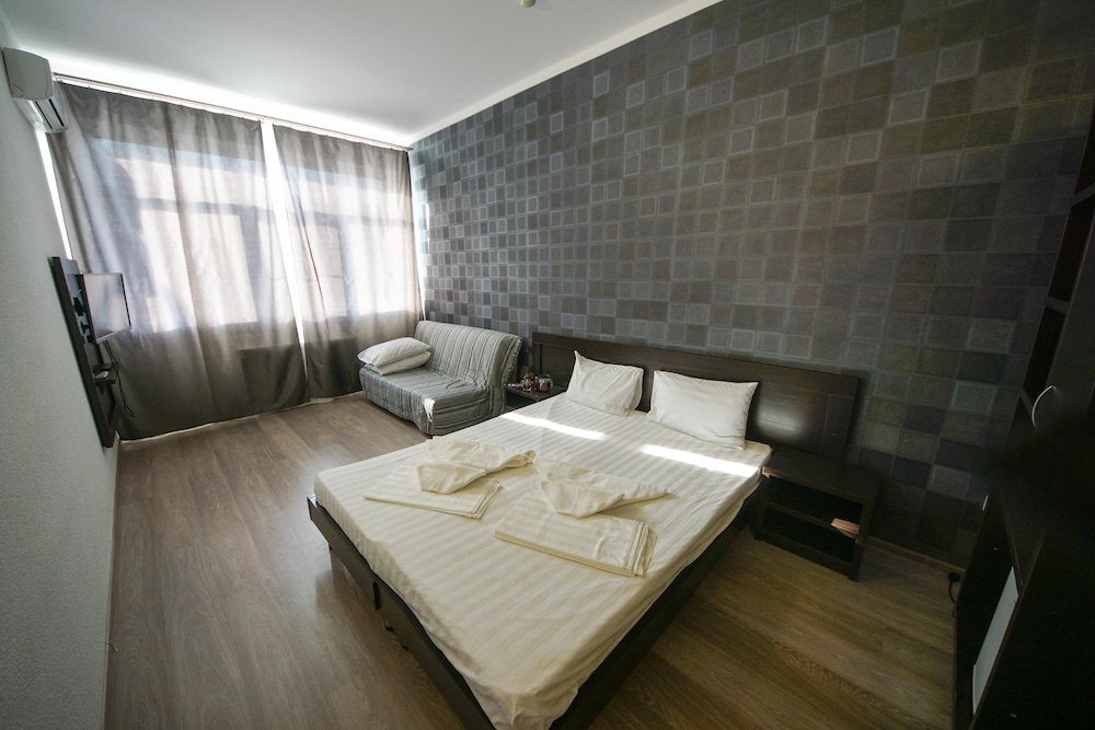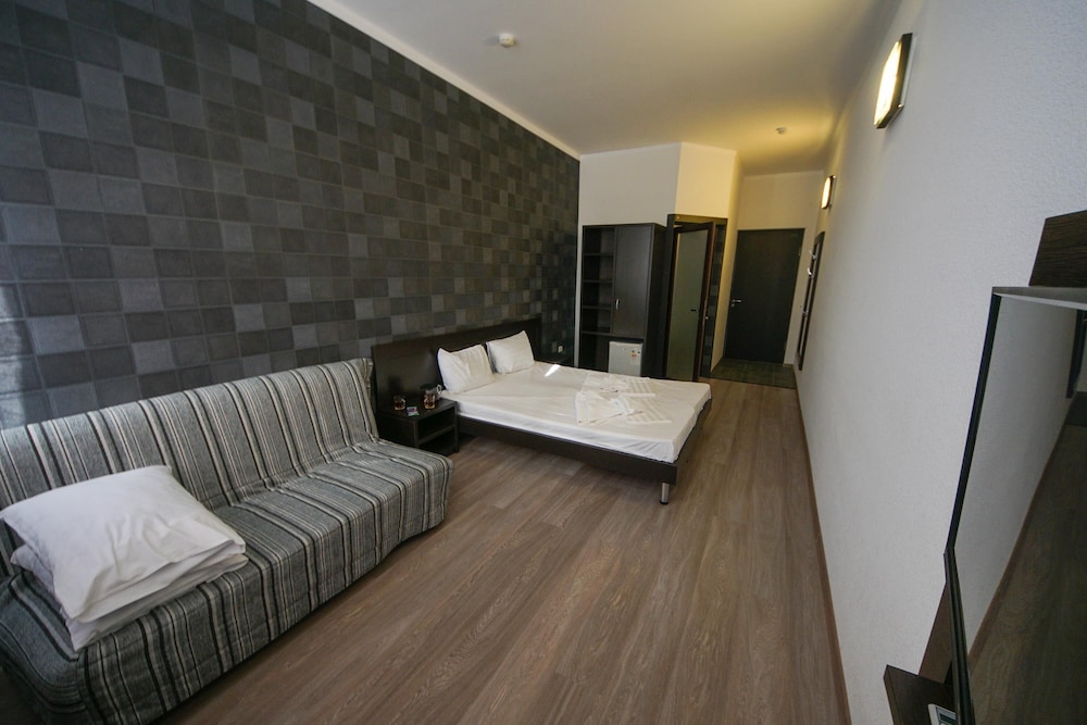 В номере чисто, Кровать с пружинным матрасом и жесткая, диван-кровать старые со старым матрасом подойдёт только для маленького ребёнка. Никакой посуды (даже чашек) и чайника в номере нет. Холодильник включили и тут же выключили - шумит. Завтрак простенький, но вкусный. До моря далеко и спуск к морю не удобный.