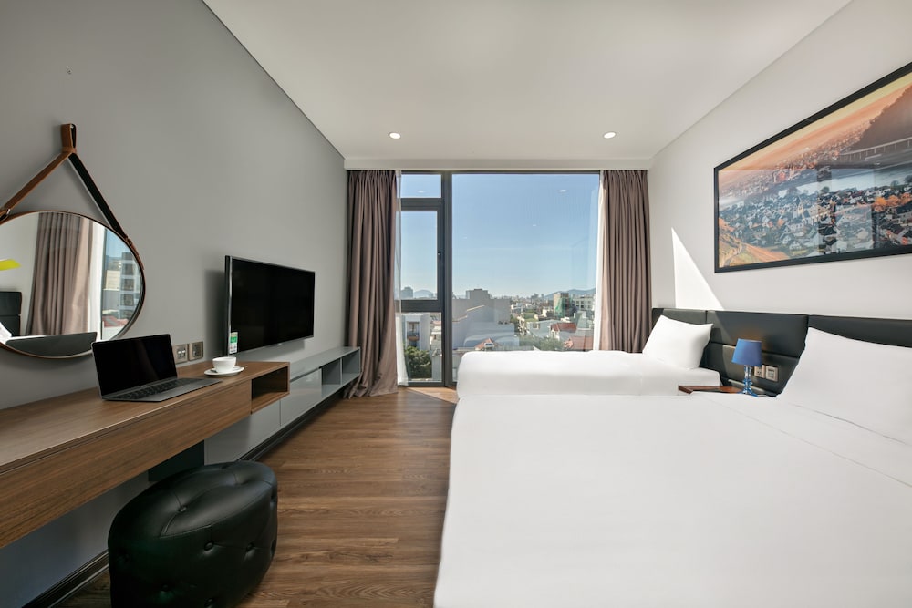 Lần đầu đến Đà Nẵng book trúng khách sạn siêu đẹp siêu sang, thích ơi là thích. Ấn tượng đầu tiên là sảnh lễ tân khá đẹp, phòng siêu rộng, mình nghĩ tầm 70,80m2 gì đó.Mỗi phòng ngủ đều có cửa kính lớn có thể nhìn khung cảnh bên ngoài khá đẹp., phòng sang, nội thất cao cấp, khá đầy đủ tiện nghi. Mình nghĩ giá như vậy cũng khá rẻ so với những khách sạn cùng sao mình đã từng ở. Khách sạn có cả phòng gym và hồ bơi trên tầng thượng. An sáng ngon.Nhân viên thân thiện, nhiệt tình.Mình chắc chắn quay lại nếu lại đến Đà Nẵng. mn tham khảo khách sạn này nhé. Mình nghĩ đây là sự lựa chọn không tồi!