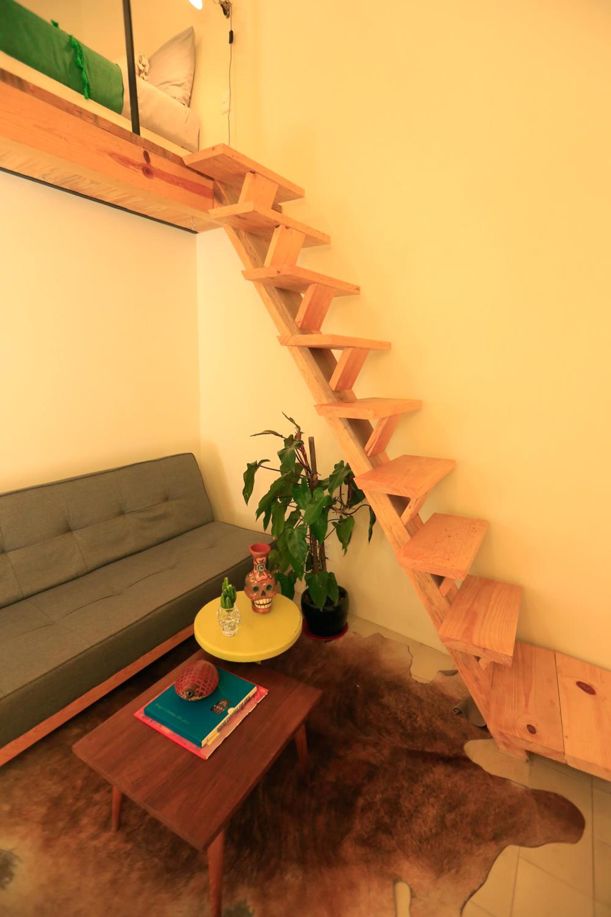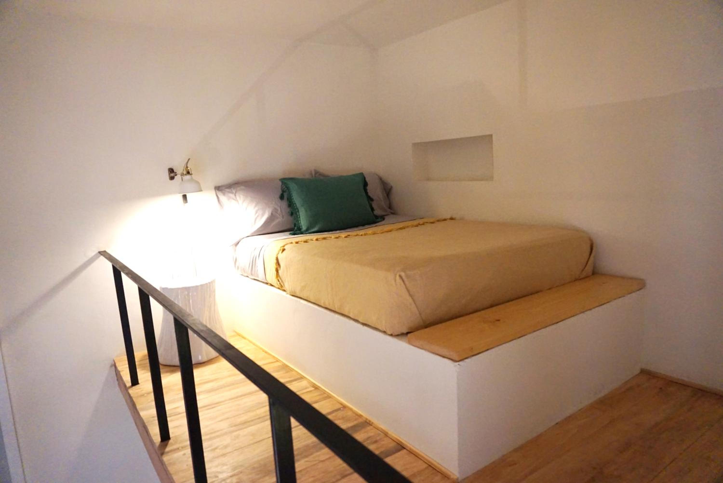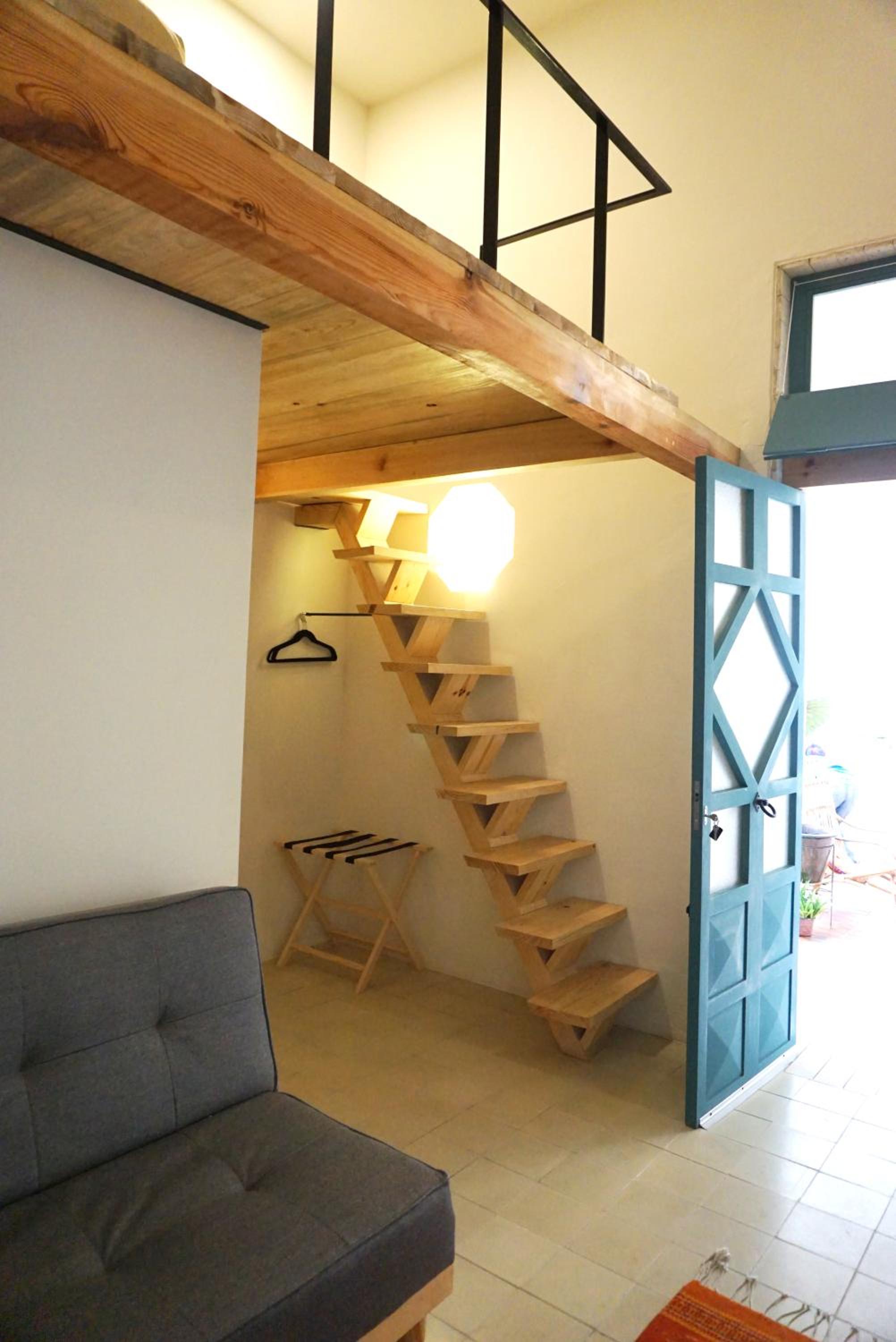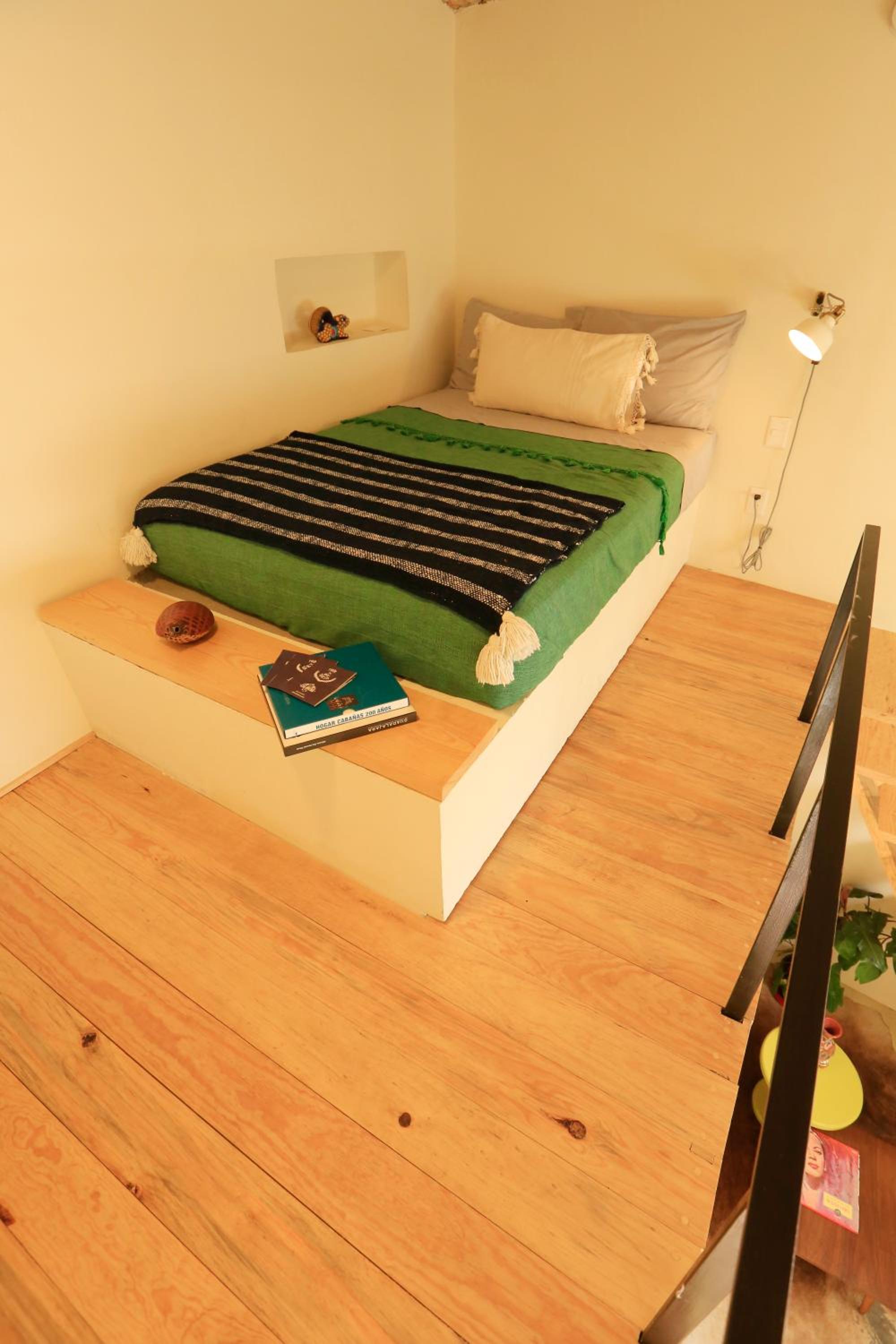 *HABITACIÓN 5: Una cama matrimonial en tapanco. Escritorio y baño en planta baja. Espacio reducido.