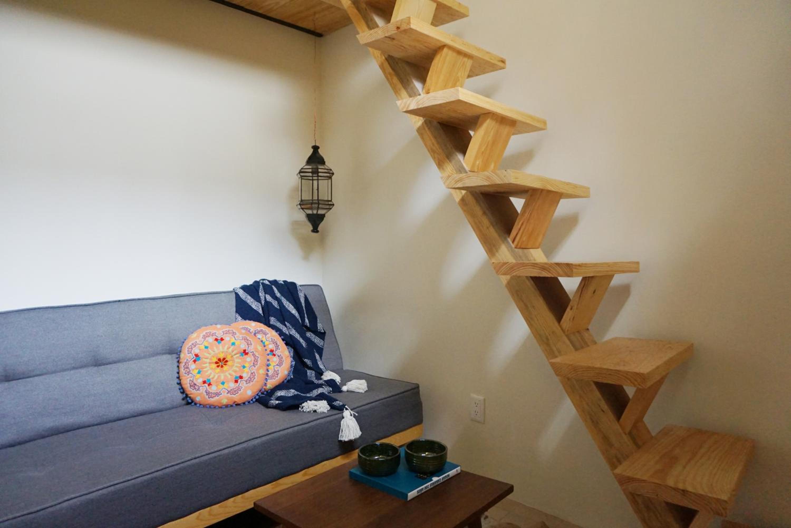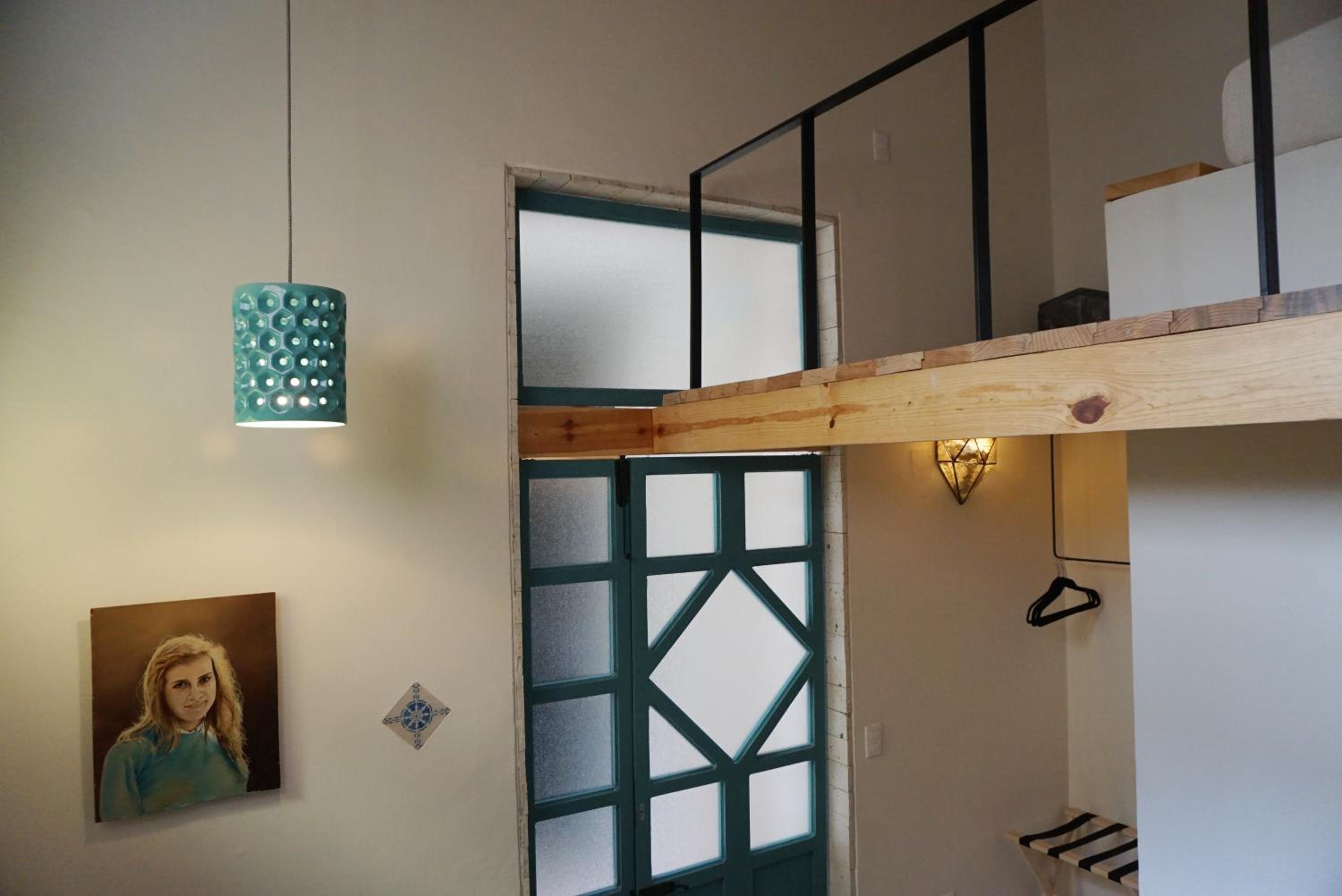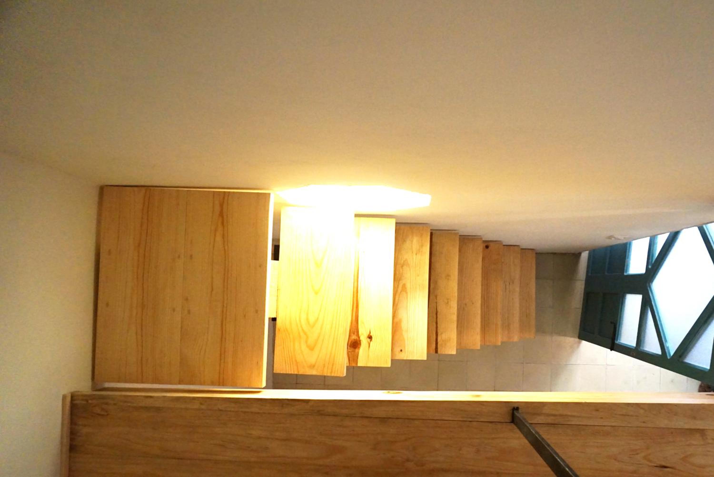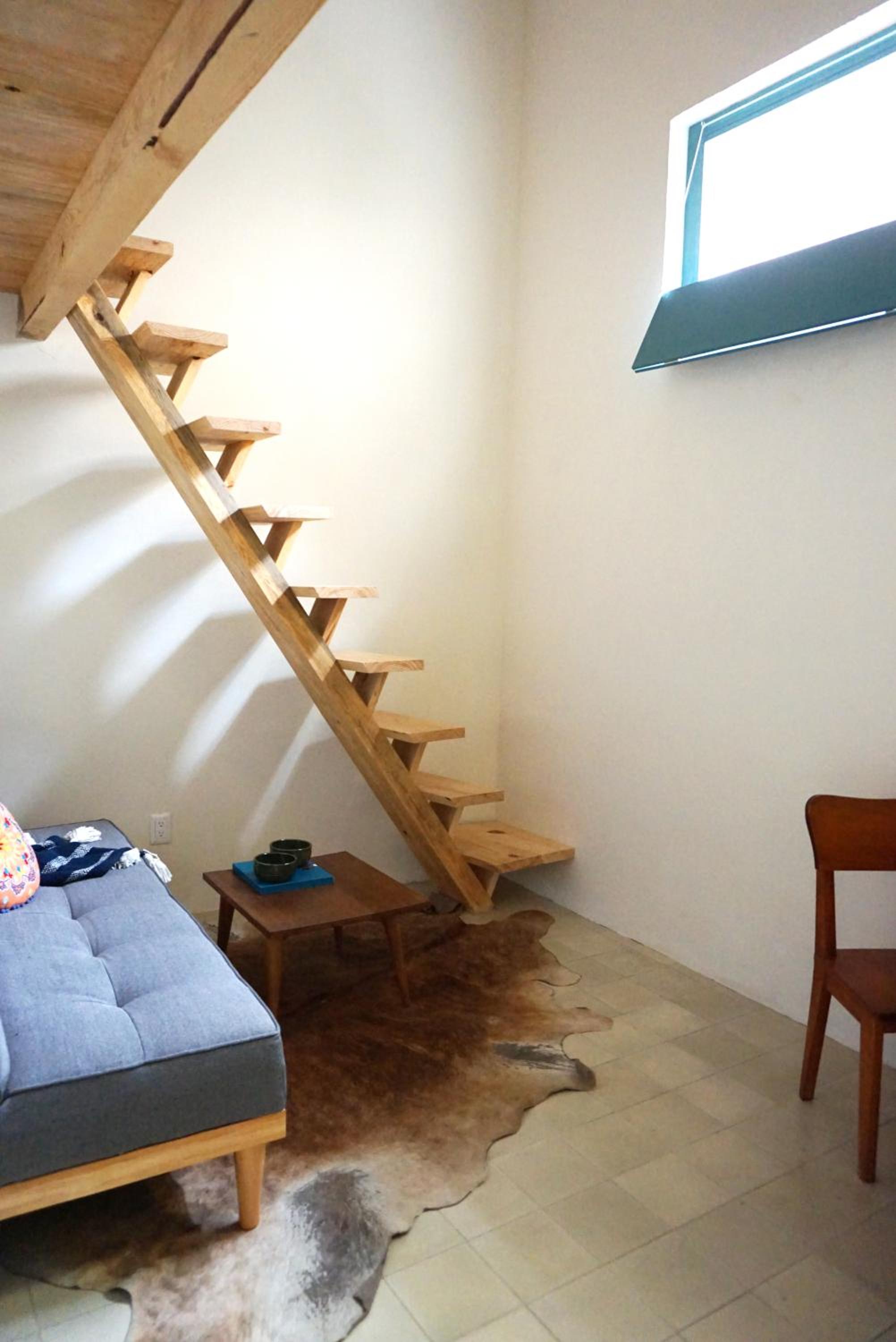 *HABITACIÓN 5: Una cama matrimonial en tapanco. Escritorio y baño en planta baja. Espacio reducido.