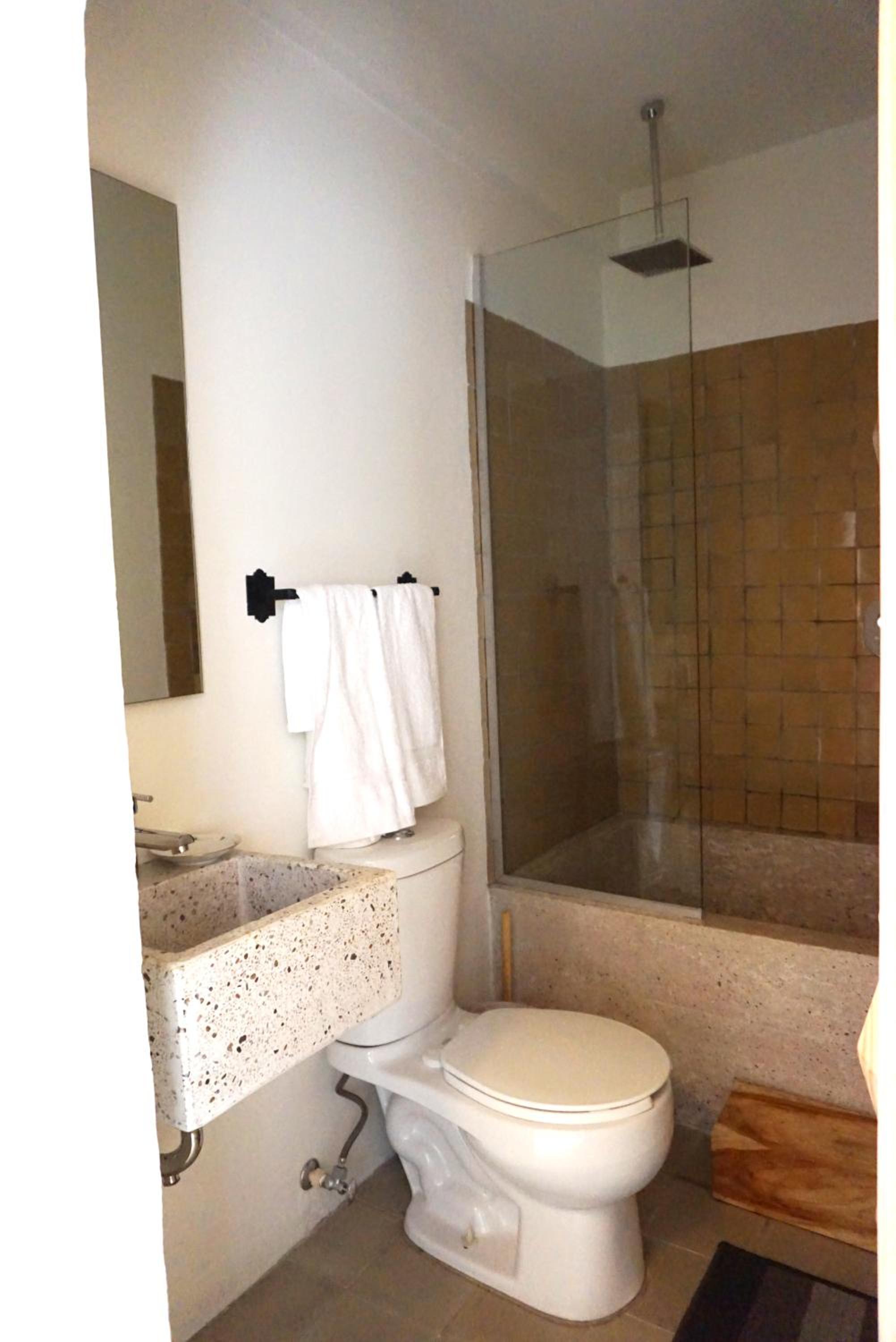 The guest rooms at Casa Morelos are thoughtfully equipped with modern amenities including a fridge, microwave, and coffee machine. The private bathrooms are stocked with complimentary toiletries and cozy bed linen, ensuring a comfortable stay for every guest.