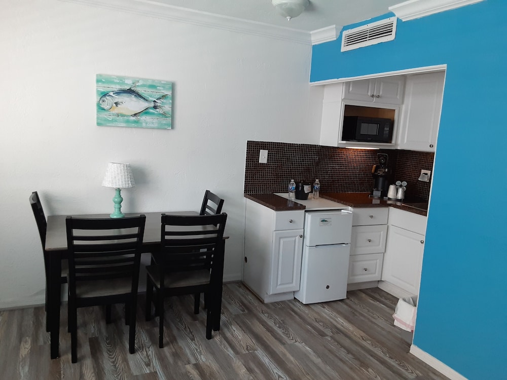 Great location, rooms very clean, convenient small kitchenette. It is dated but worth the price. Has a wonderful open covered area with sofas and chairs so you can be right there at the beach without being in the sand! We loved it.
