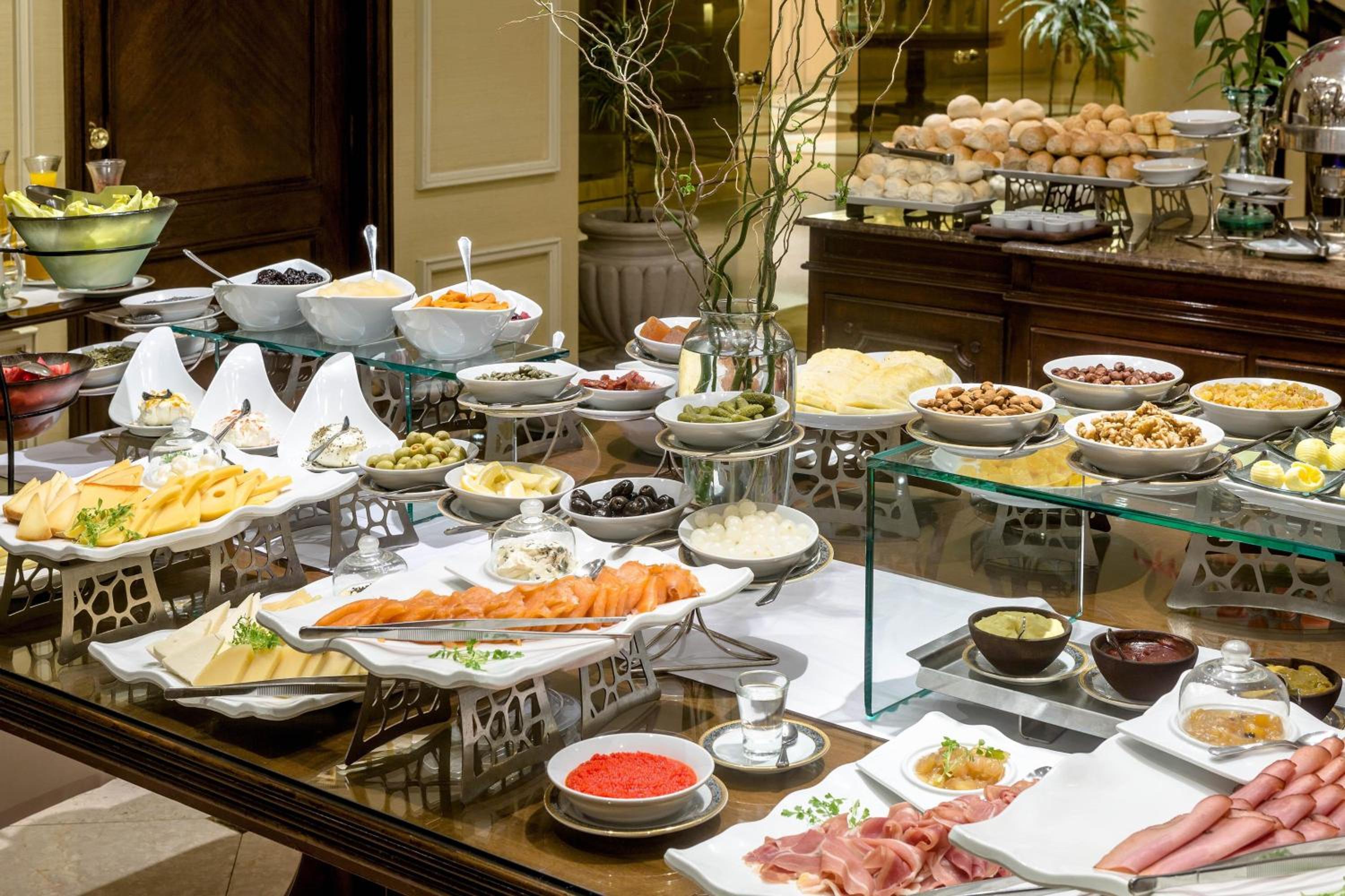 We ordered room service which came in about 30 minutes. The food was elaborately arranged on a trolley with a white tablecloth. The servings were generous and well prepared. Breakfast was delightful in the St Regis restaurant. There was a buffet with continental breakfast items as well as scrambled eggs and the like (see pictures). Breakfast includes ala carte items. I never saw a menu. I just told the waiter what I wanted and he brought it. I especially liked the wheat toast cut into circles. The breakfast wait staff were outstanding