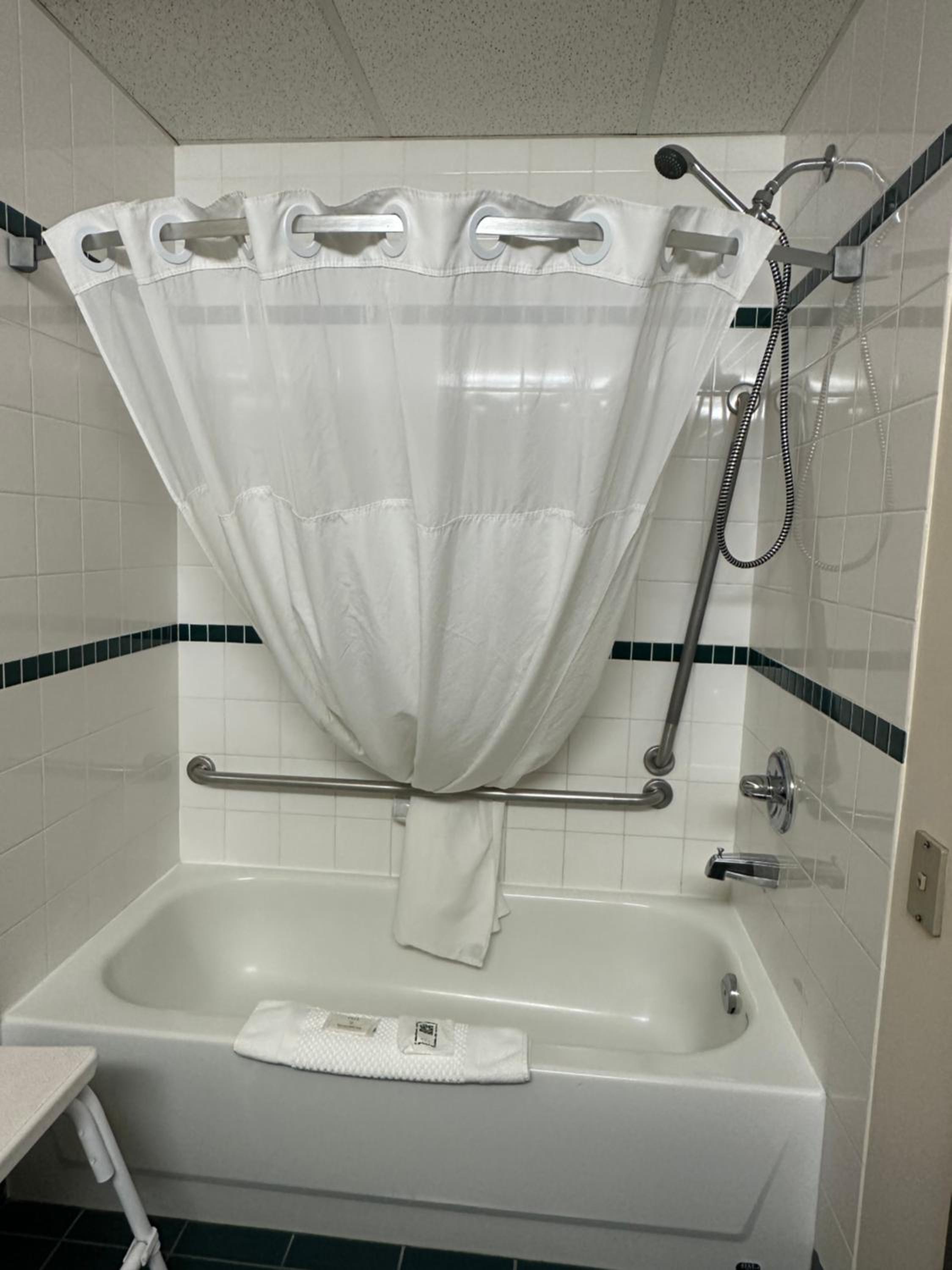 The bath in the room had a very strange incline, causing most of the water to spill outside.