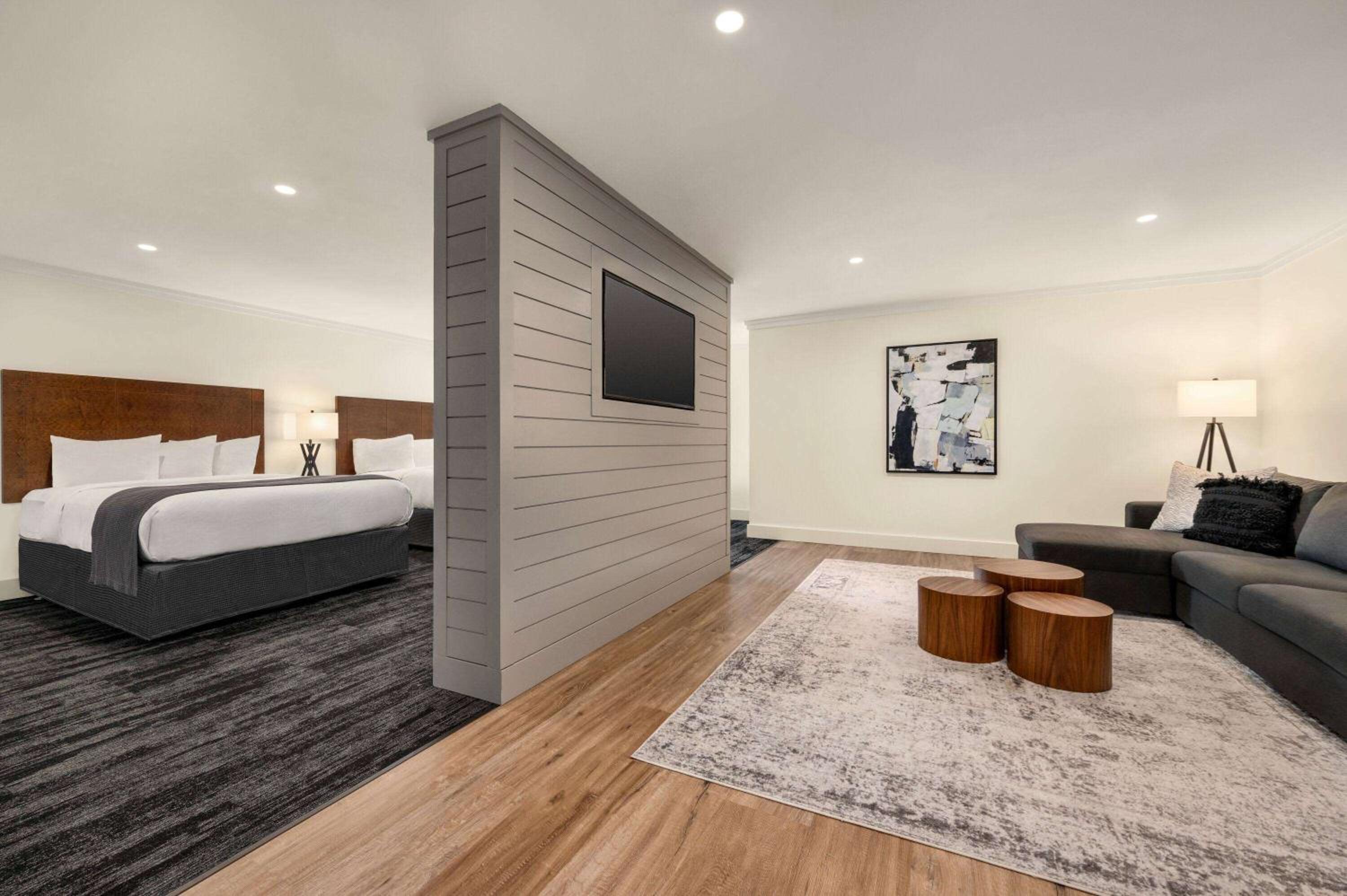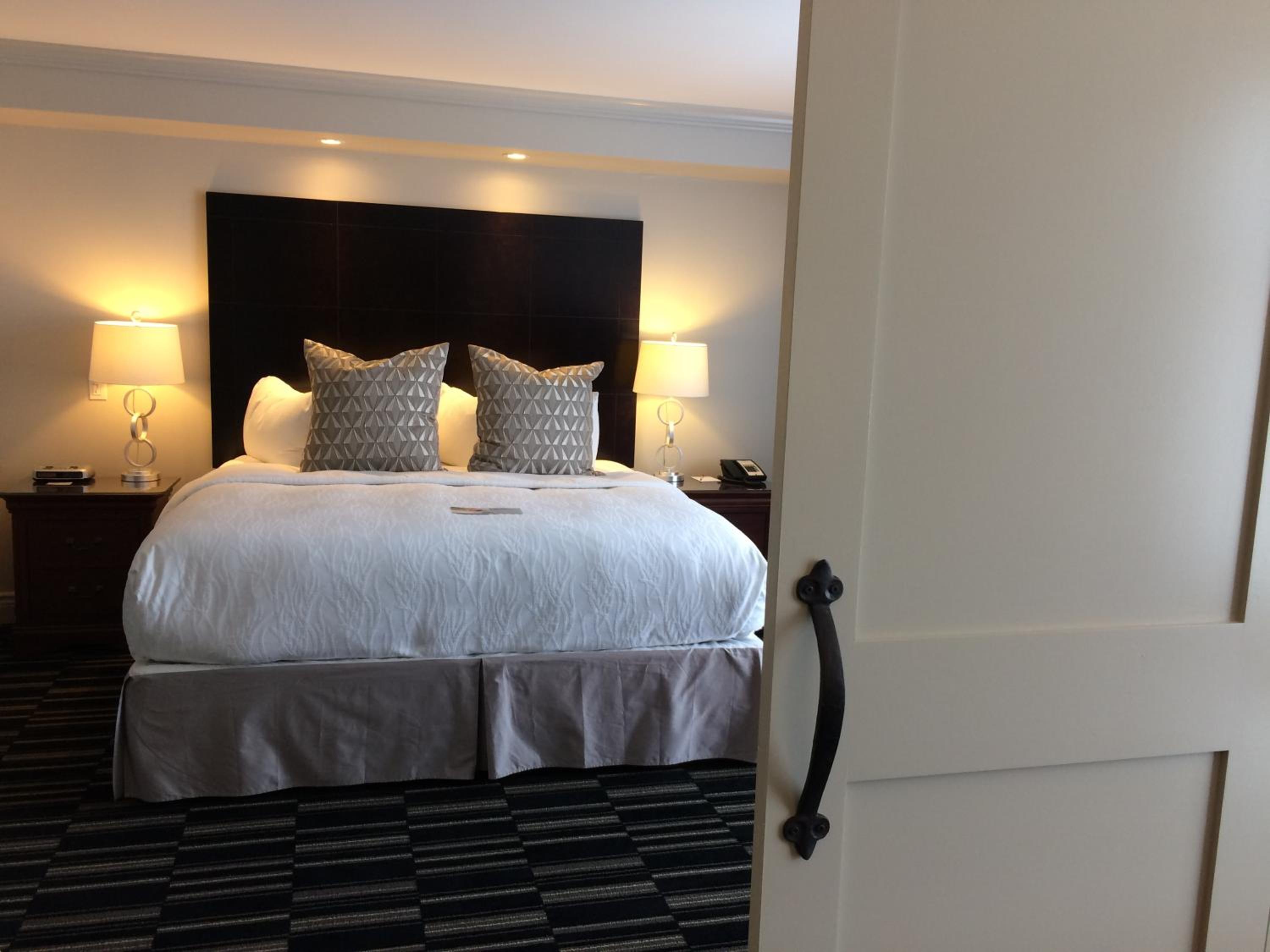 Our room was located a very long distance from reception, and we were surprised by how large and spread out the property is. Upon entering the room, it was uncomfortably cold, set to 66 degrees. The furnishings were very dated and showed significant wear—scratches, dents, and visible water damage. The crown moulding was poorly done, and throughout the hotel the stucco ceilings and walls felt outdated and unappealing. Air vents were visibly dirty, and the doors looked like they hadn’t been updated since the 1970s.