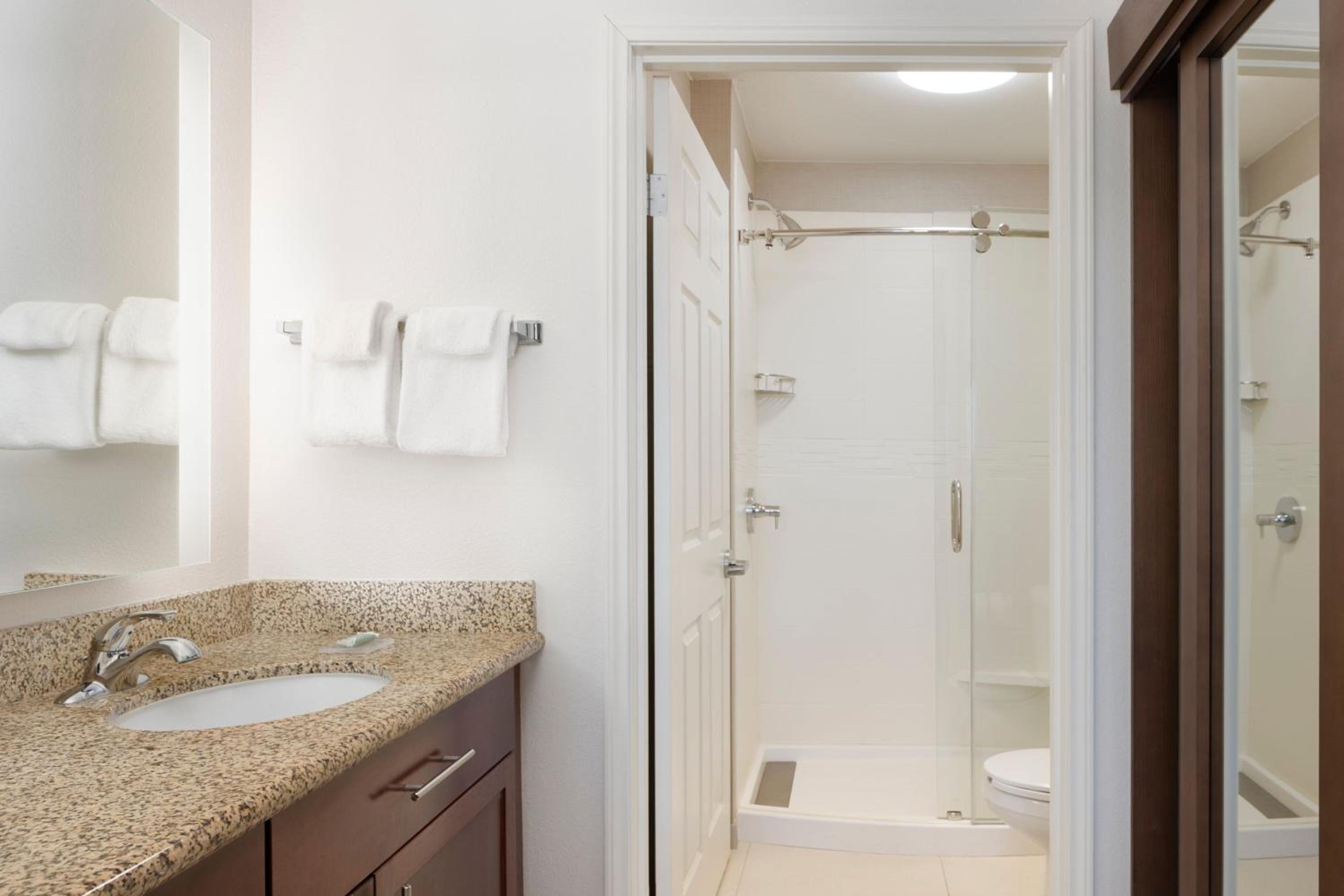 Location was near many good restaurants and stores walking distance to the hotel. The room choices are great with a 2 bedroom 2 bath with living room and kitchen and tv in each room. Breakfast was decent.