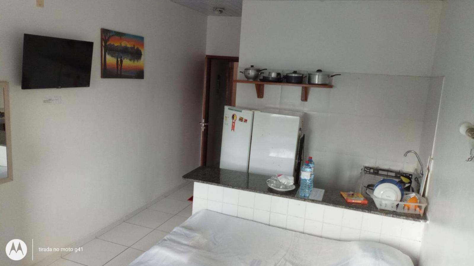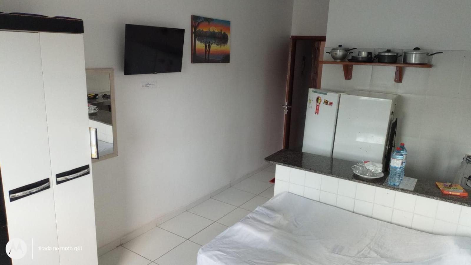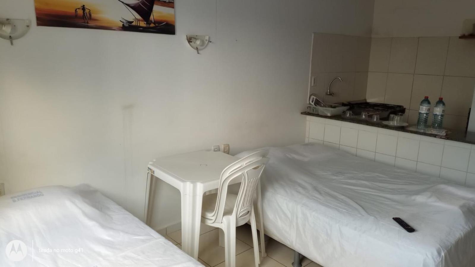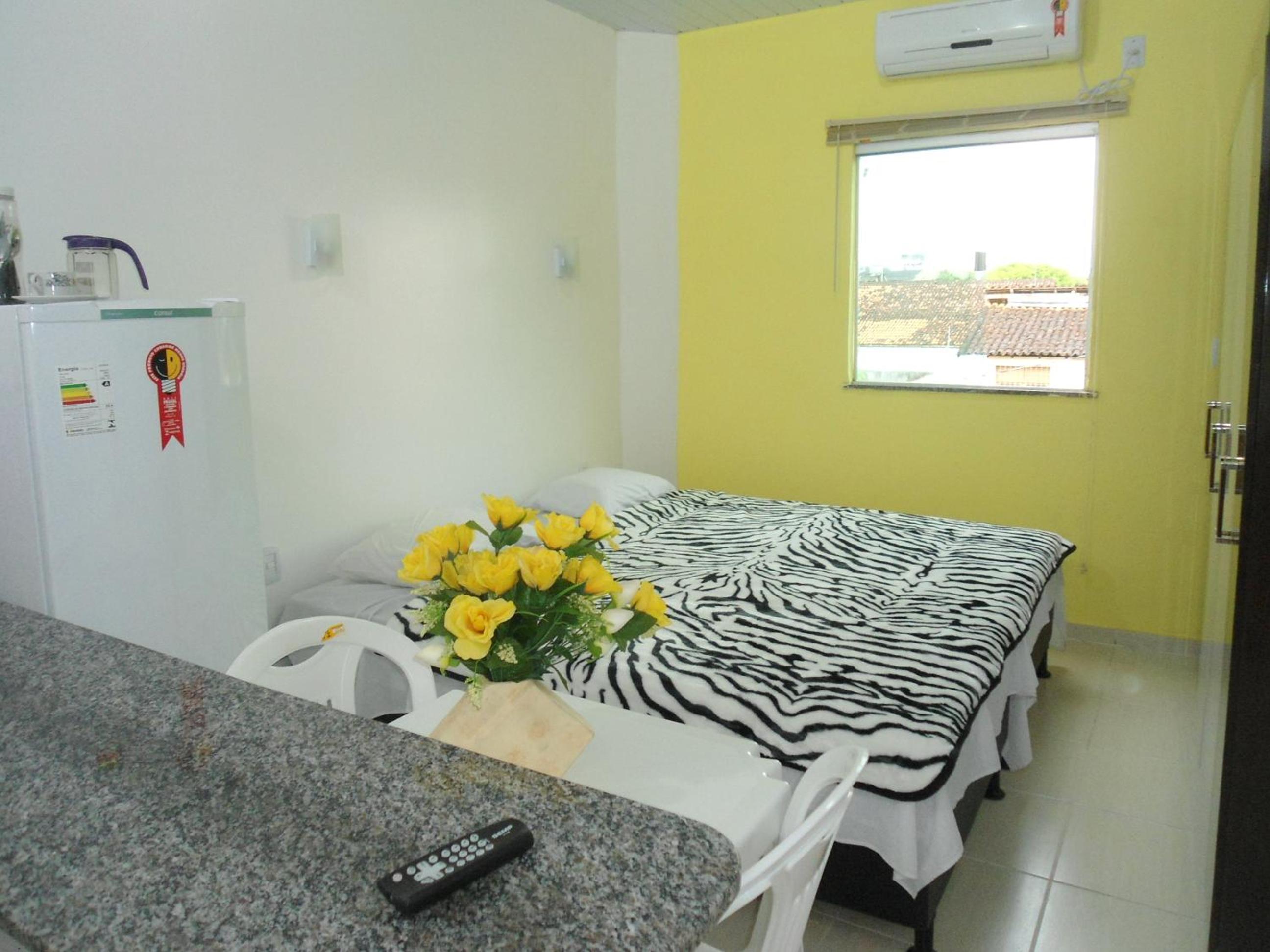 Convenient Amenities: The air-conditioned studios at Residencial Dom Fernando offer a comfortable stay with a TV, private bathroom, and a well-equipped kitchenette.