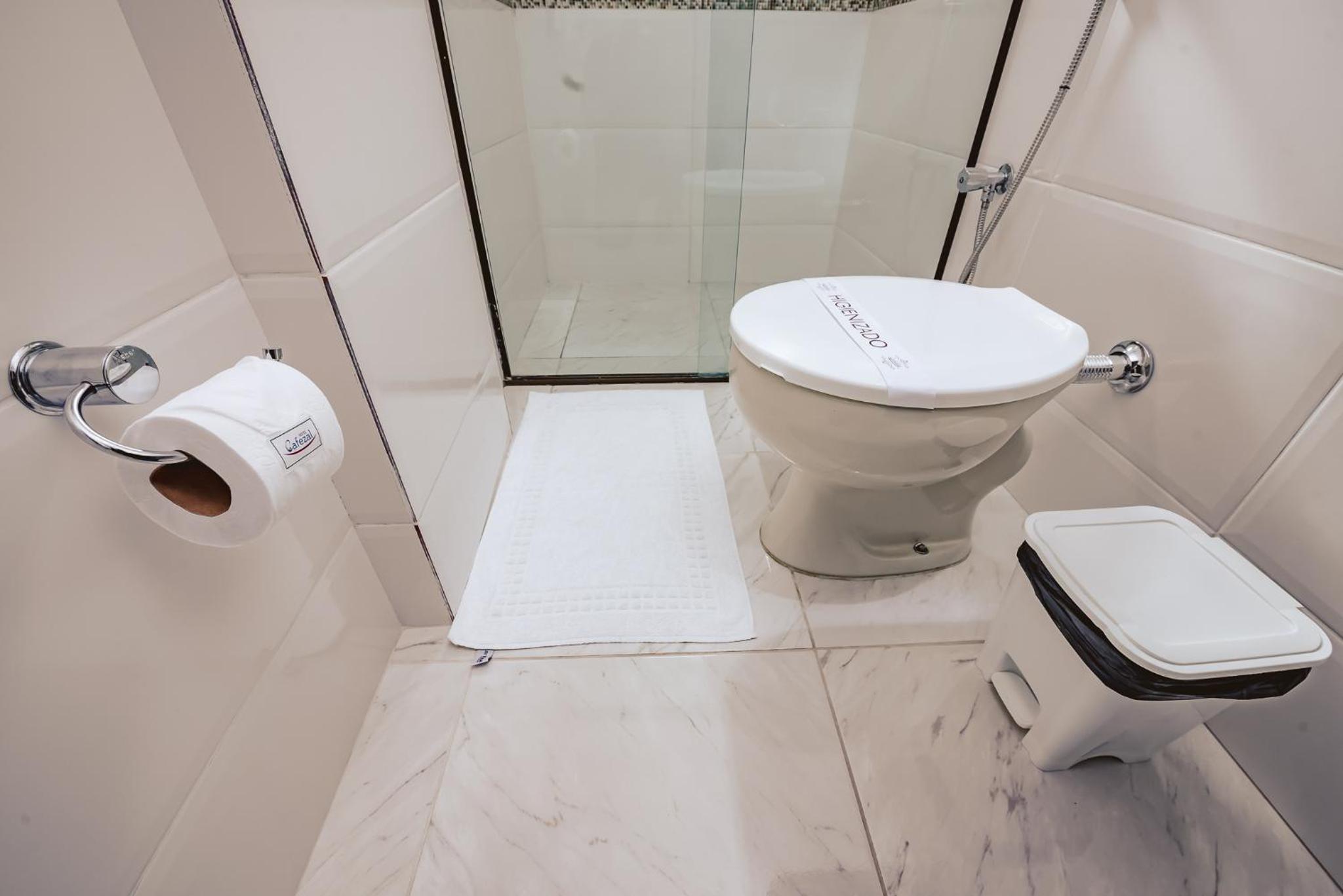 O banheiro tem alguns problemas. Por algum motivo é muito difícil equilibrar a temperatura da água no chuveiro. Além disso, o caimento do piso foi feito errado, então a água do box inunda um pouco o banheiro.