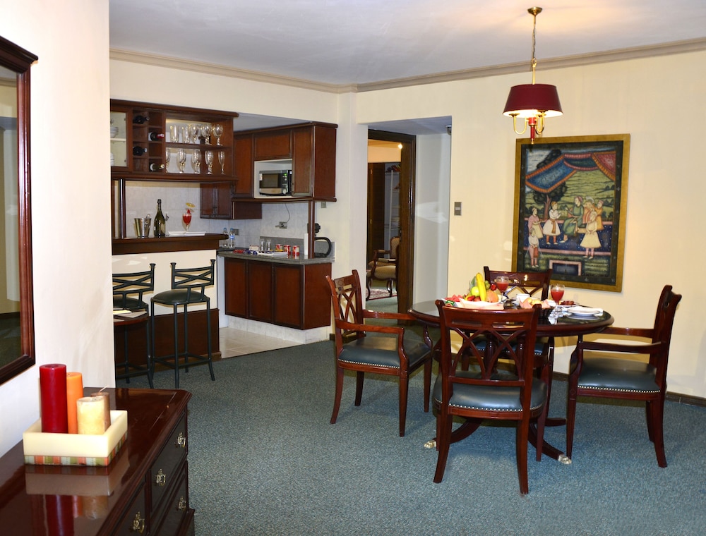 Bolivia was a land of mystery, and what better place to do that than in this beautiful majestic hotel. The staff is so kind and considerate - my Spanish is not that great, but most of the staff speaks English, and the ones that don't are patient, understanding and helpful no matter the language. The concierge gives great recommendations for food or for fun; the porters are amazingly helpful and kind, always just trying to help. Even the rooms, which I will get into more detail about, are kept impeccably clean by the housekeeping staff. Once we got checked in, by the helpful and friendly staff, we got a chance to see the hotel in all it's glory. From the ground floor you get to see the palm trees and the pools and the beautiful grounds, but only from the spacious and thoughtfully decorated rooms do you get to see the actual breathtaking view of the hotel. We stayed for over a week, and the view did not get old ever. The last night there we still found the lights and palm trees and the waterfalls to be just as stunning as that first walk in to the room. The room itself was huge! Even small touches like lights above the closet were thoughtful. The kitchen was just perfect for what we needed, and the bed could have fit a soccer team! The pillows were wonderfully fluffy and comfy, and the bathtub was big enough to soak an elephant. If I had one complaint, and this isn't a complaint, this is mere preference, I found the bed to be a bit hard for my tastes, and the blanket on the bed to be a bit thin. Certainly not a concern at all, my sleep was perfect, just a preference. We had breakfast more than not the entire week we were there, and the omelets were delicious! The cereal was perfect, and the tea was perfect every single cuppa. I think my favorite part was the juices that changed every day -- today orange, tomorrow watermelon, the next day papaya. We were lucky enough to be there over New Year's Eve, and the meal they had for the party was worth the price; they had such amazing decorations for the new year!! Everything was delicious and really fair priced.I travel a lot, and really this place was so perfect. I cannot express how wonderful this place was, so perfectly placed in the city as well with walking distance to everything we needed. I look forward to see how Santa Cruz grows and we certainly will be making a return trip.