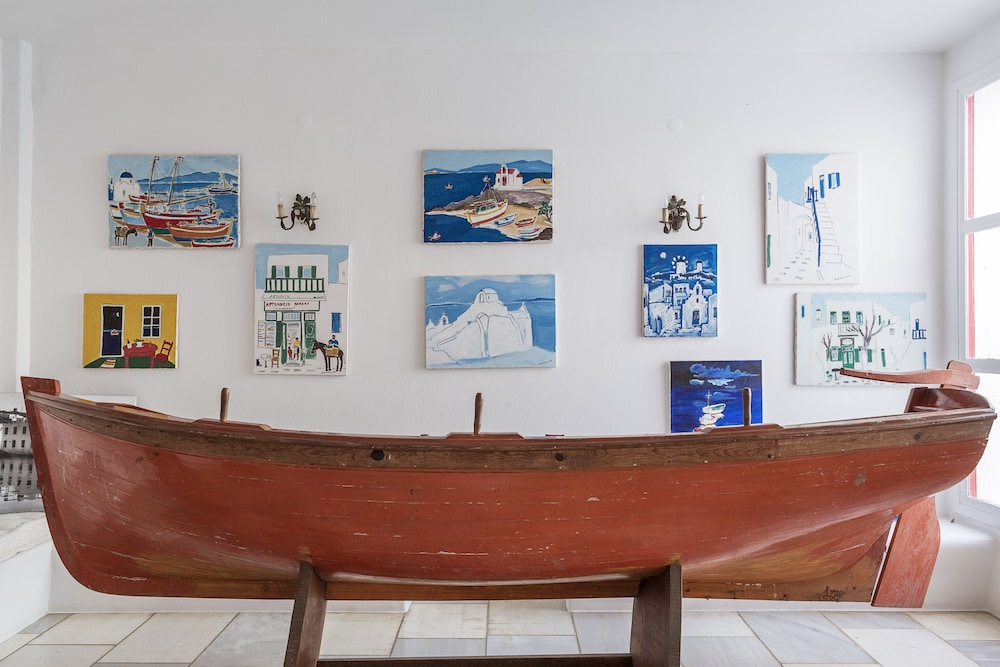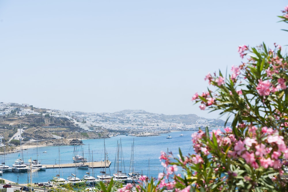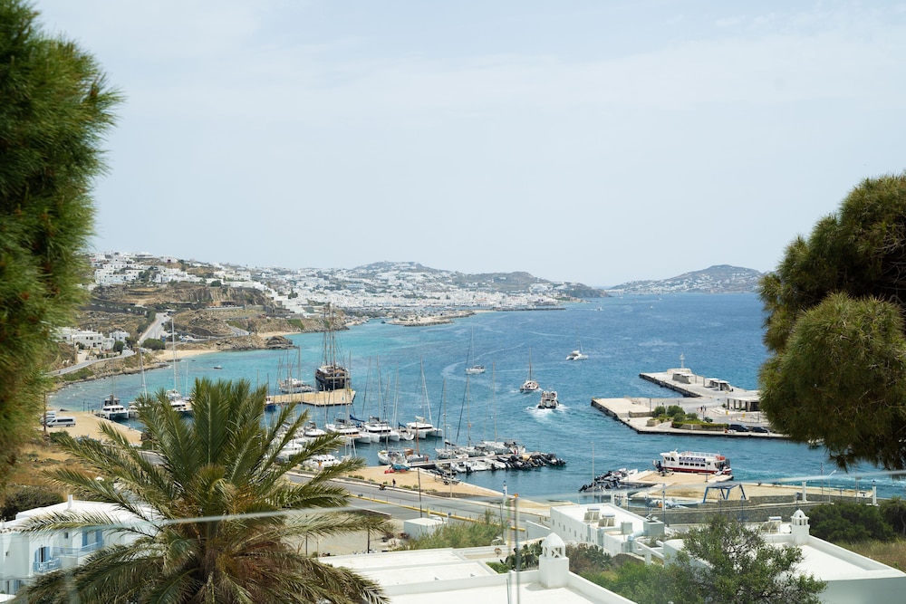 This is a beautiful hidden gem. A small and friendly hotel with stunning views lovely genuine owners who are so friendly and helpful. Perfect location away from the hustle and bustle of town which can get busy when the cruise ships come in, but with such easy access over to Mykonos on the sea buses, only €2 each way and go every half an hour up until 6pm then on the hour until 11 pm at night, we loved these and went on them daily either in the day to wander around the amazing streets, stopping at cafes, Little Venice is gorgeous as are the Windmills,or later in the evening to eat they only take about 20 minute, it was a special part to the holiday .It is a 5 minutes walk down a steep hill from the hotel to the harbour and port where you will also find some great restaurants and a couple of small supermarkets. You can also walk left up a hill and down to a beautiful beach, you can rent thick padded sun beds with an umbrella and table for €20 a day.