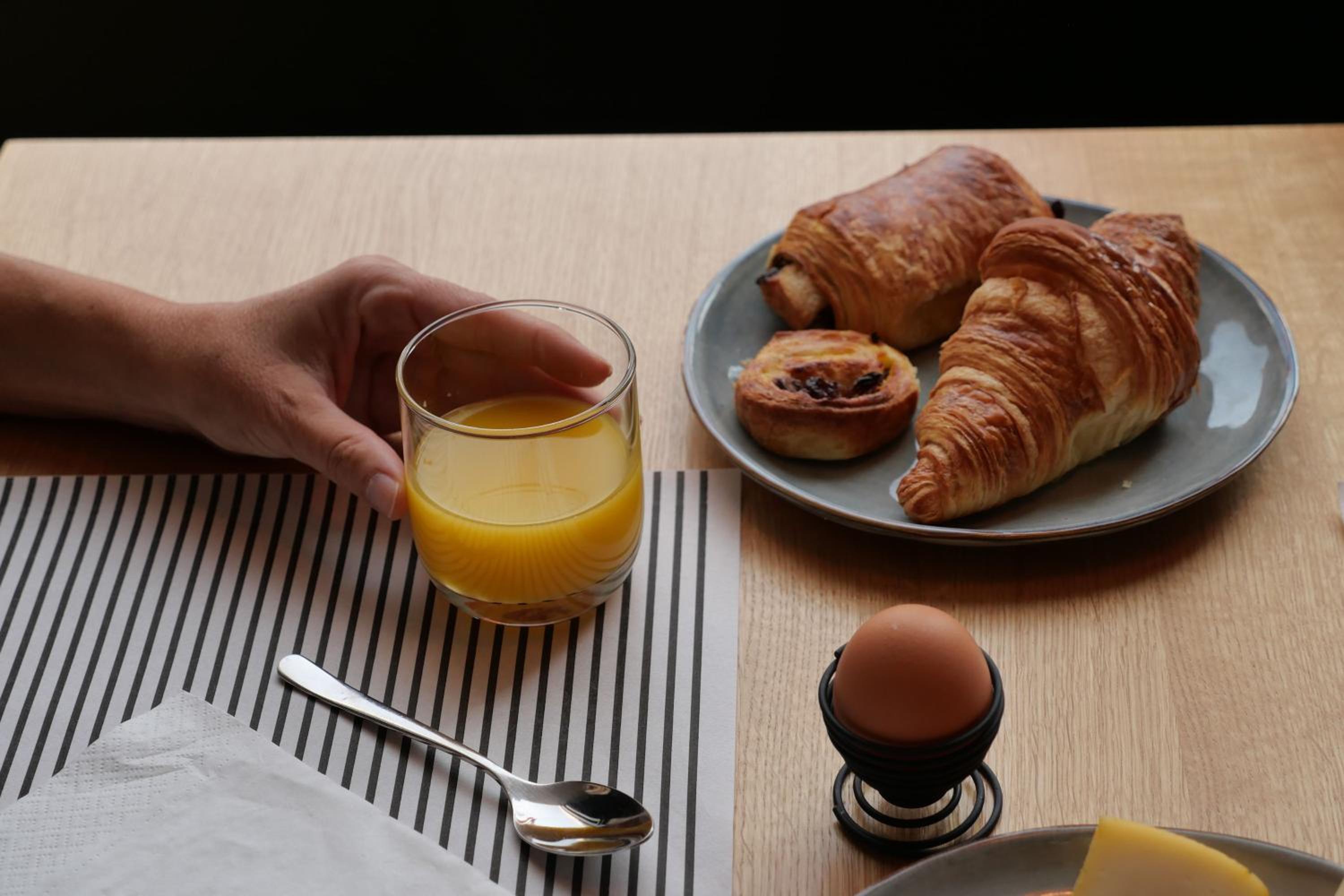 Petit dej avec produits frais et bien complet.