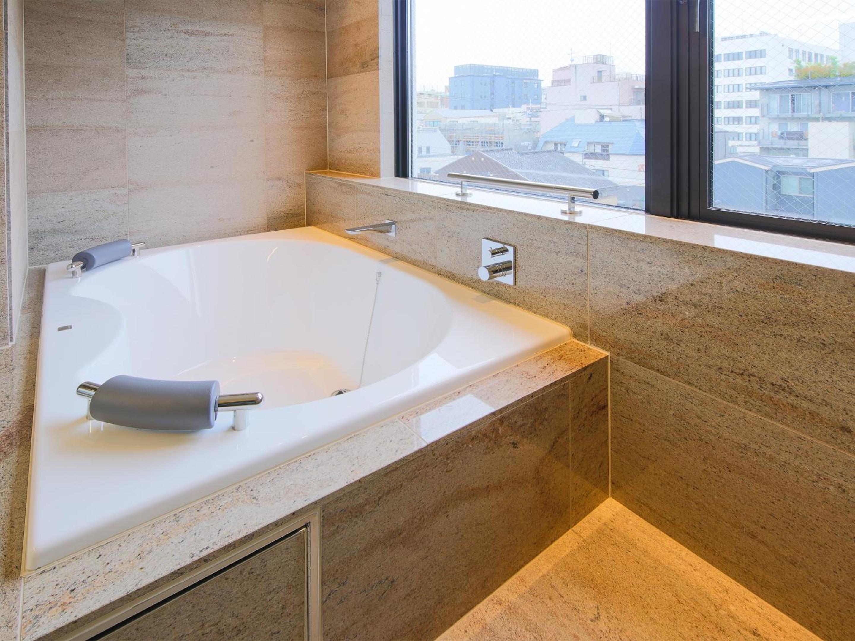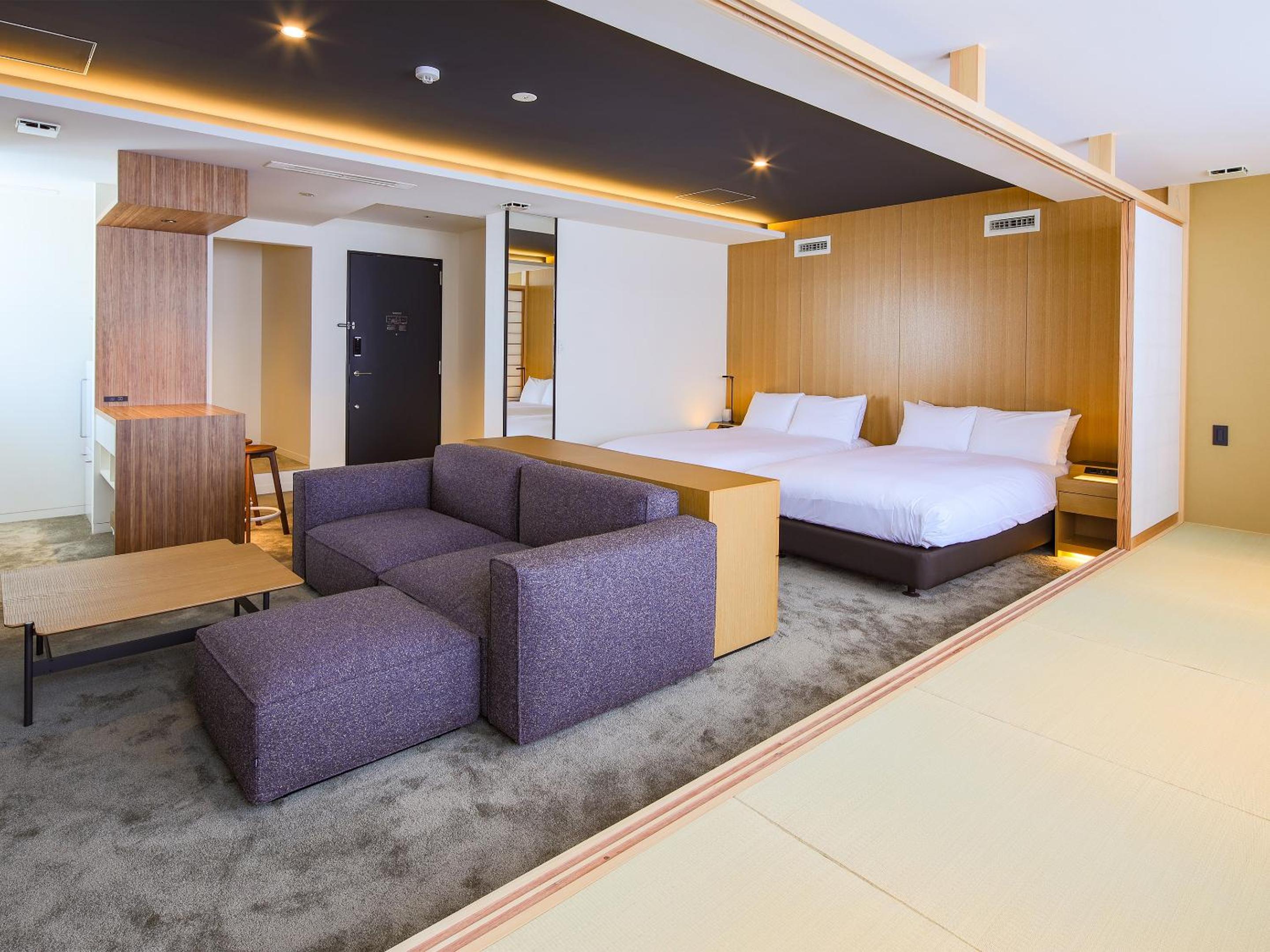 The staff were so friendly and accommodating and provided great recommendations. The family suite for the 5 of us was very spacious with a nice sitting area and a small kitchen with a fridge and microwave. They not only provided bottled water that was provided daily, bottled green tea, fruity bubbly water, beer, sake, were also provided which we really enjoyed. The family suite had a single bathroom but it still worked well for our family since there were two sinks and the toilet was separate from the shower/sink. There was also a hot tub next to the shower which we took turns relaxing in a couple at a time.Notable was the great quality of shampoo and conditioner they provided. They also provided an assortment of toiletries. We loved having this family suite so we could hang out and chat, play card games, and eat together. Every morning light breakfast was provided which was a pastrami sandwich on one day, hotdog the next, and red bean sandwich the third morning with choice of coffee, cafe latte, matcha, matcha latte, orange juice, or apple juice, delivered at a scheduled time to our room in the morning. We would love to stay again the next time we are in Kyoto.