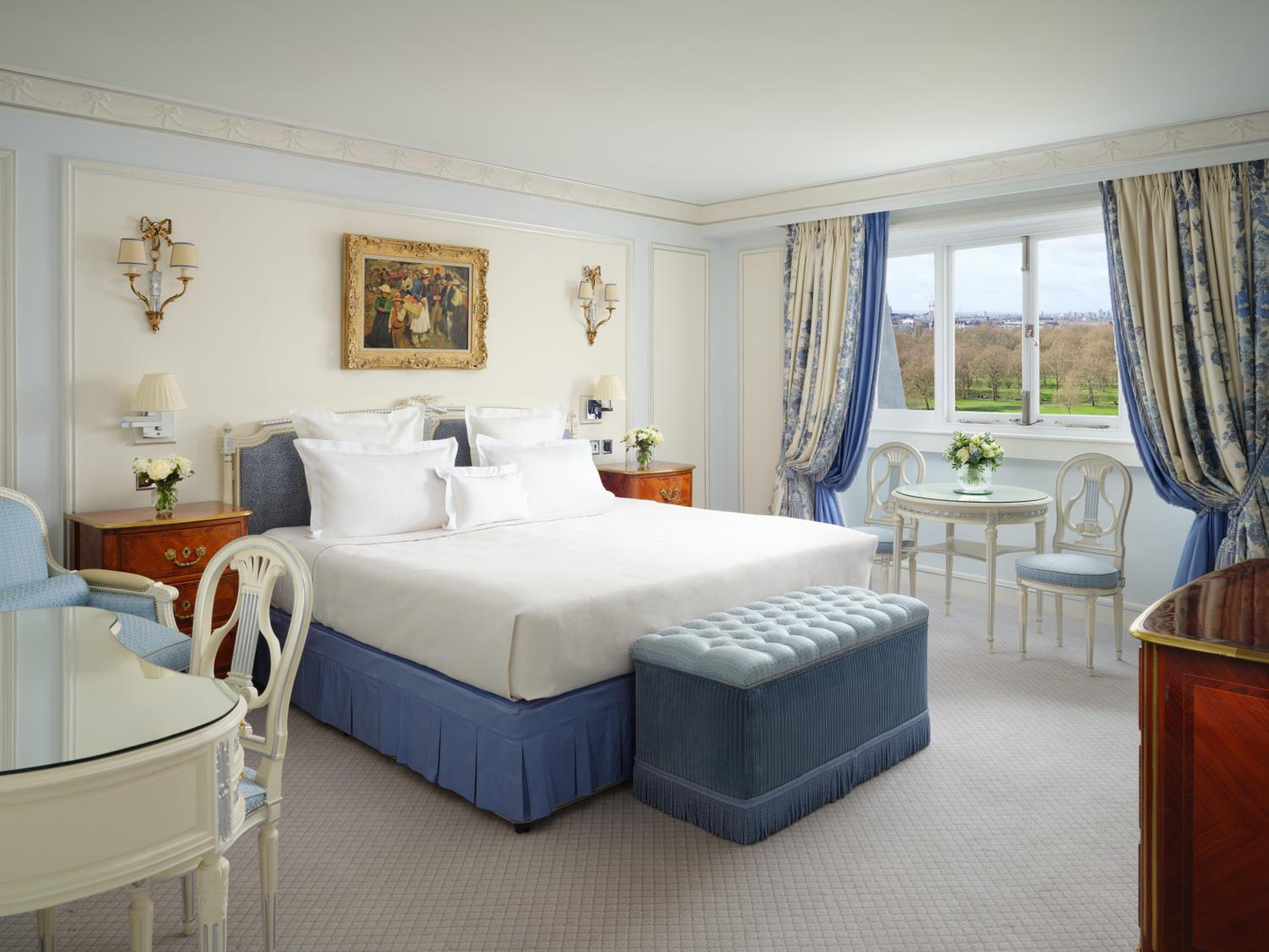 Experience opulence at its finest at The Ritz London with luxurious bedrooms adorned with antique furnishings, high ceilings, and elegant bathrooms featuring designer toiletries.