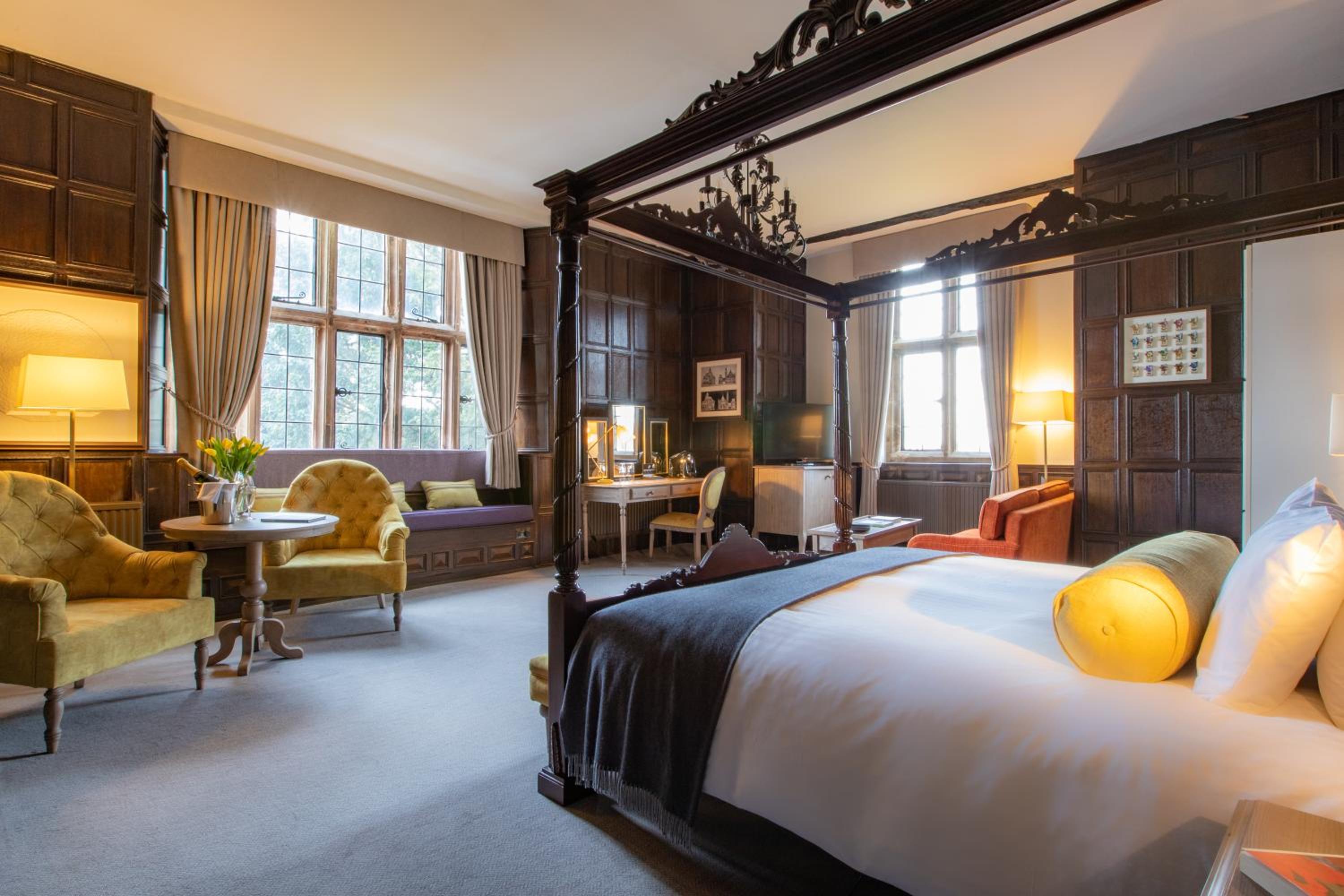 Experience a blend of traditional charm and modern luxury in our bedrooms located in the manor house or cedar barns. Indulge in fine dining at the Stuart Restaurant and Great Hall, boasting oak panelling and original fireplaces for a truly regal experience.