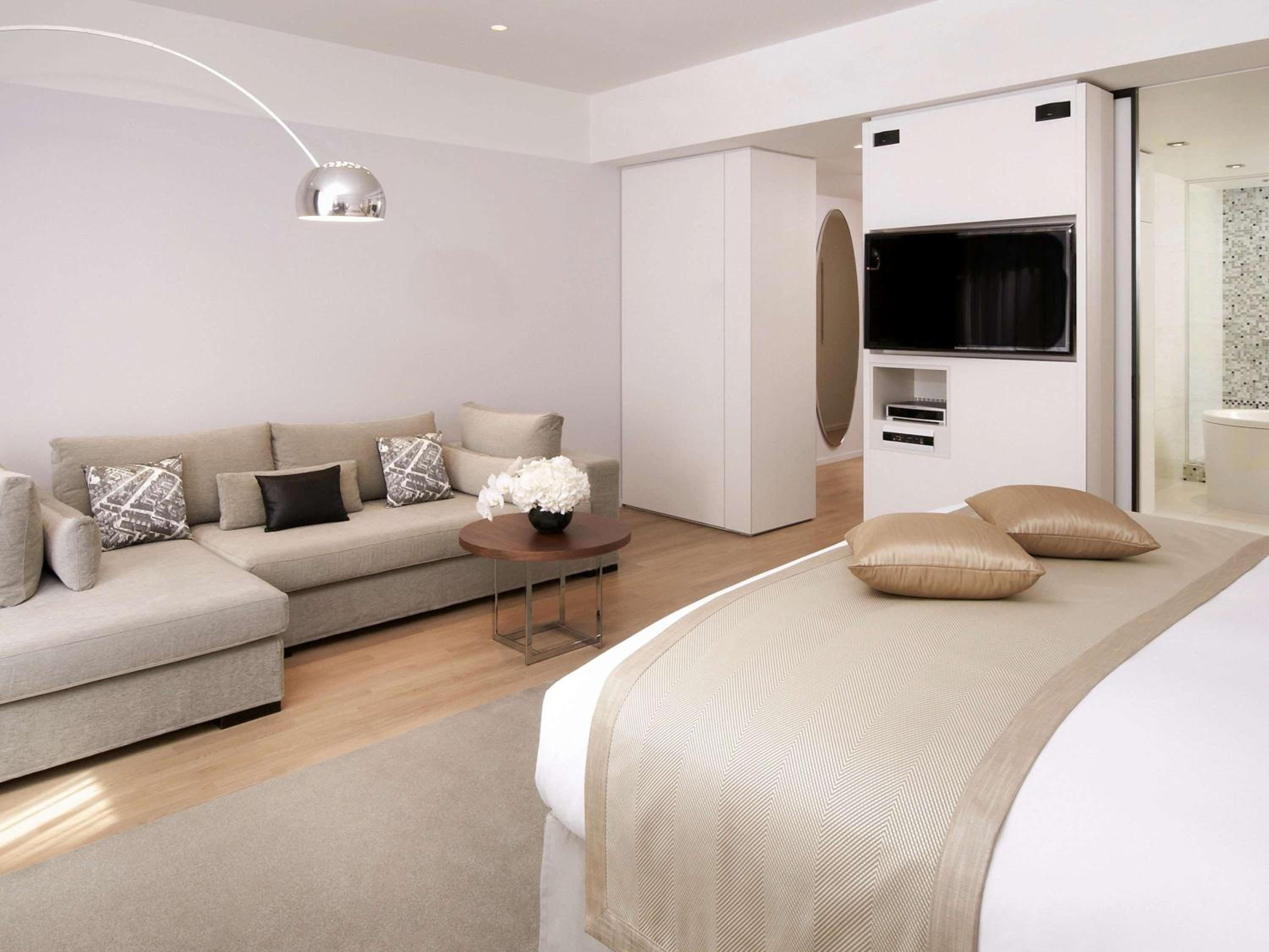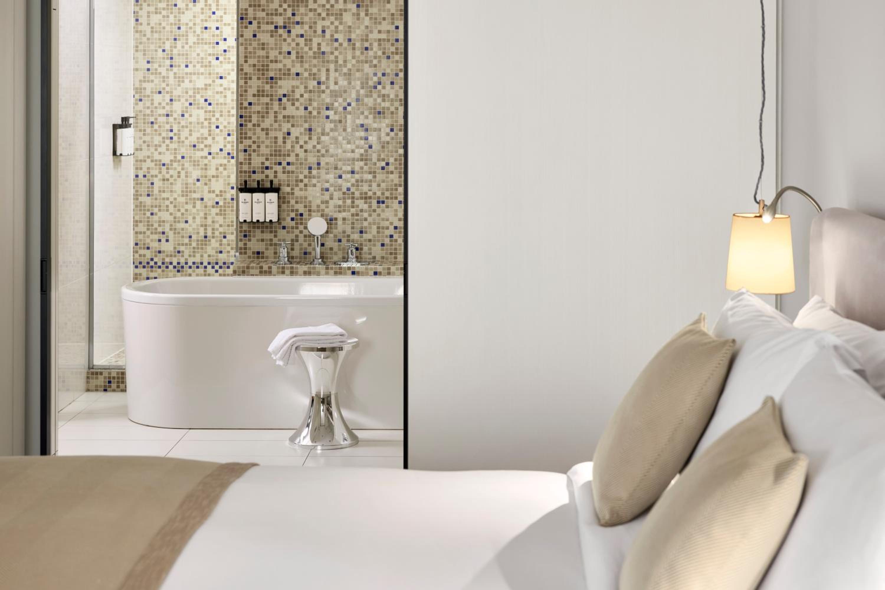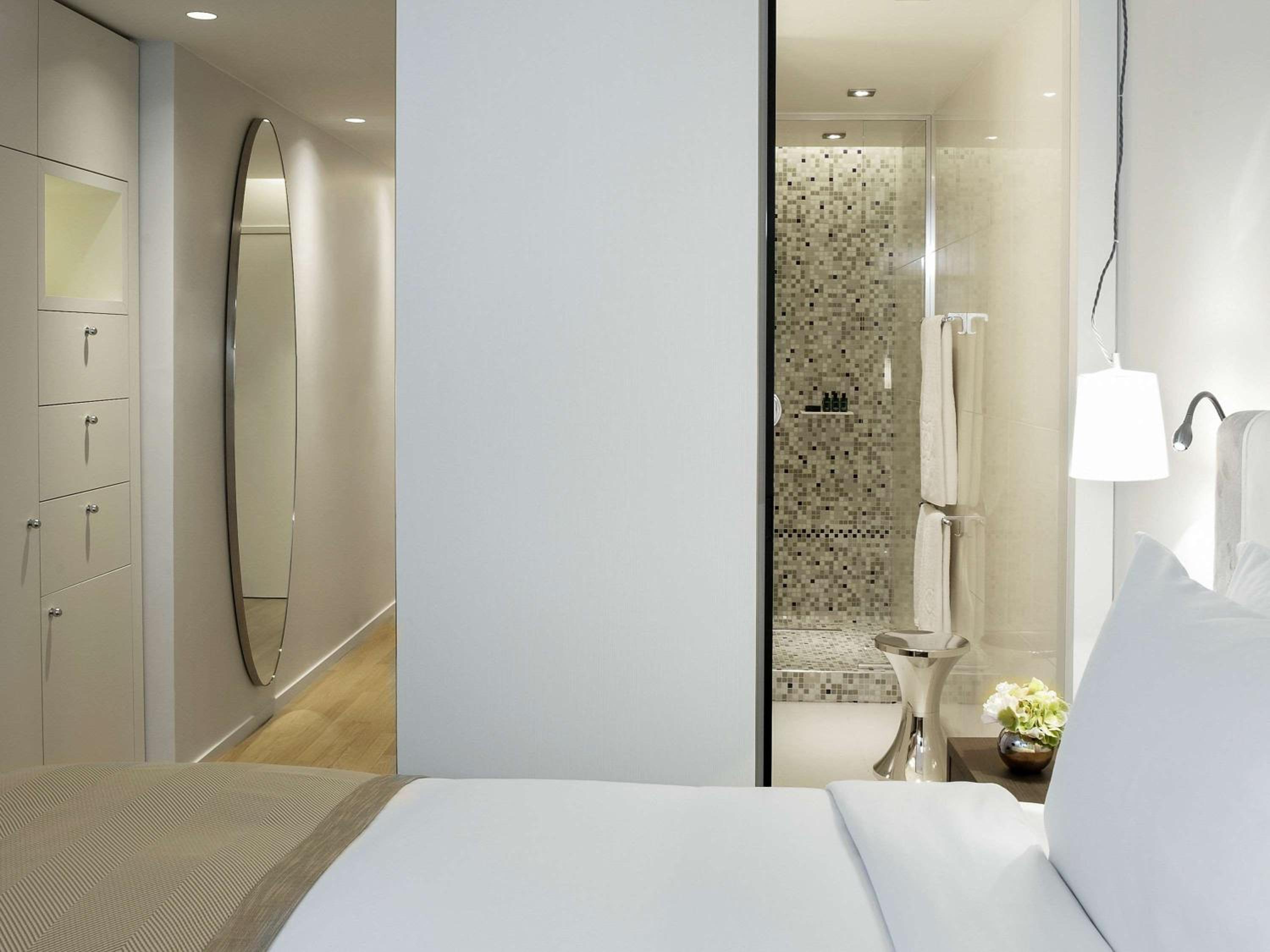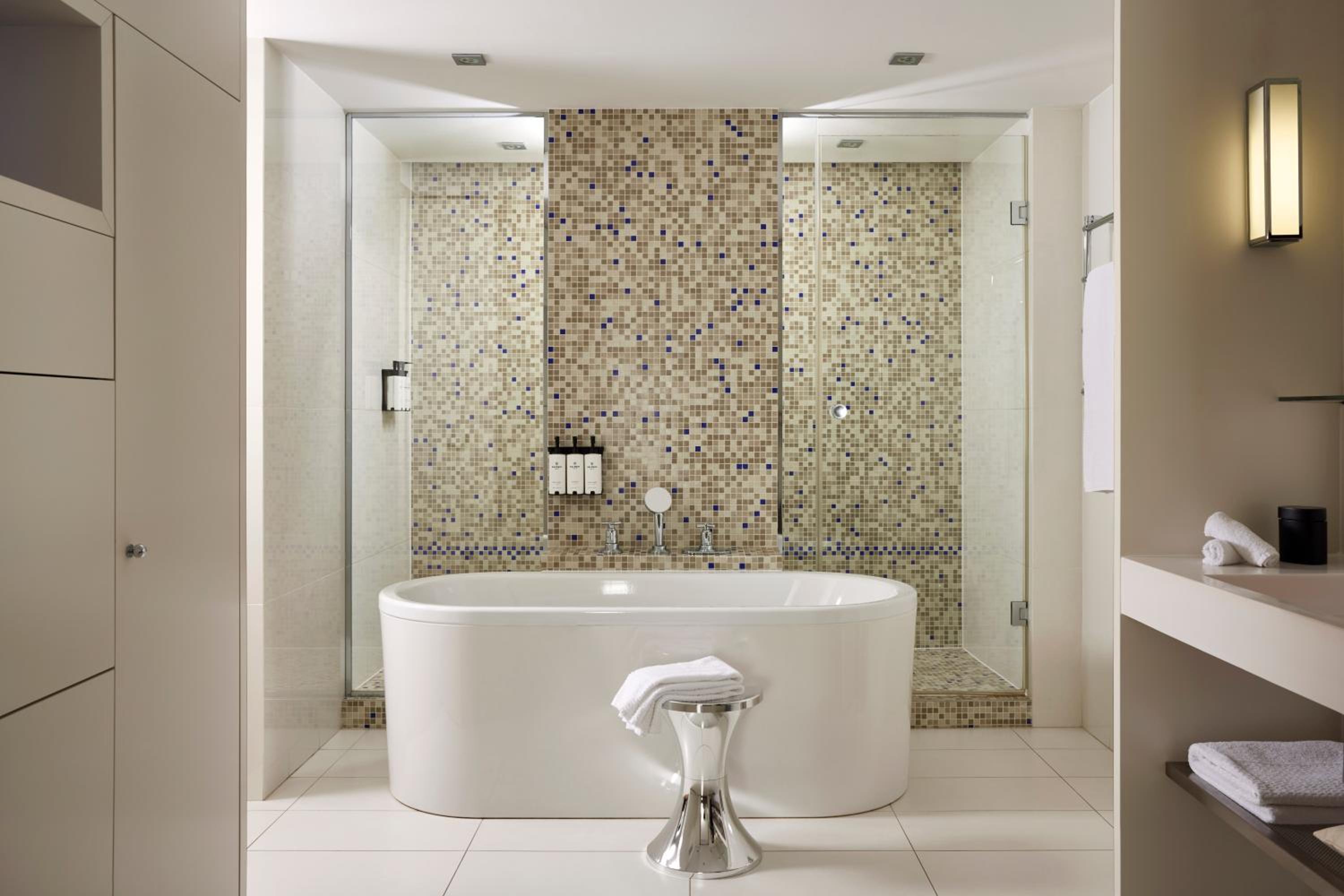 Experience contemporary design and luxury at Sofitel Paris Arc De Triomphe, located steps away from iconic landmarks. Indulge in Bose audio speakers, Nespresso machines, and Balmain toiletries in each room. The suites boast flat-screen TVs and elegant bathrooms with mosaic tiles, offering both a walk-in shower and a freestanding bath.