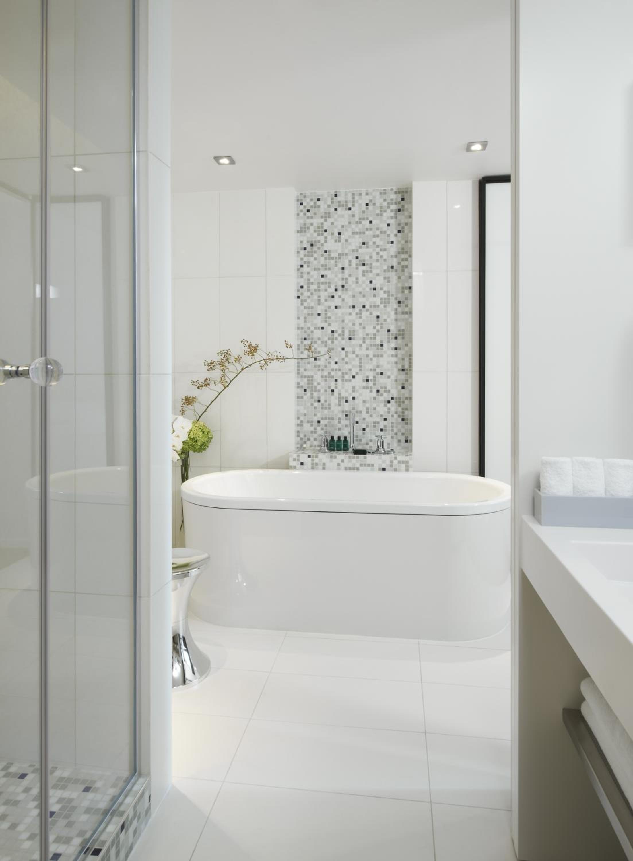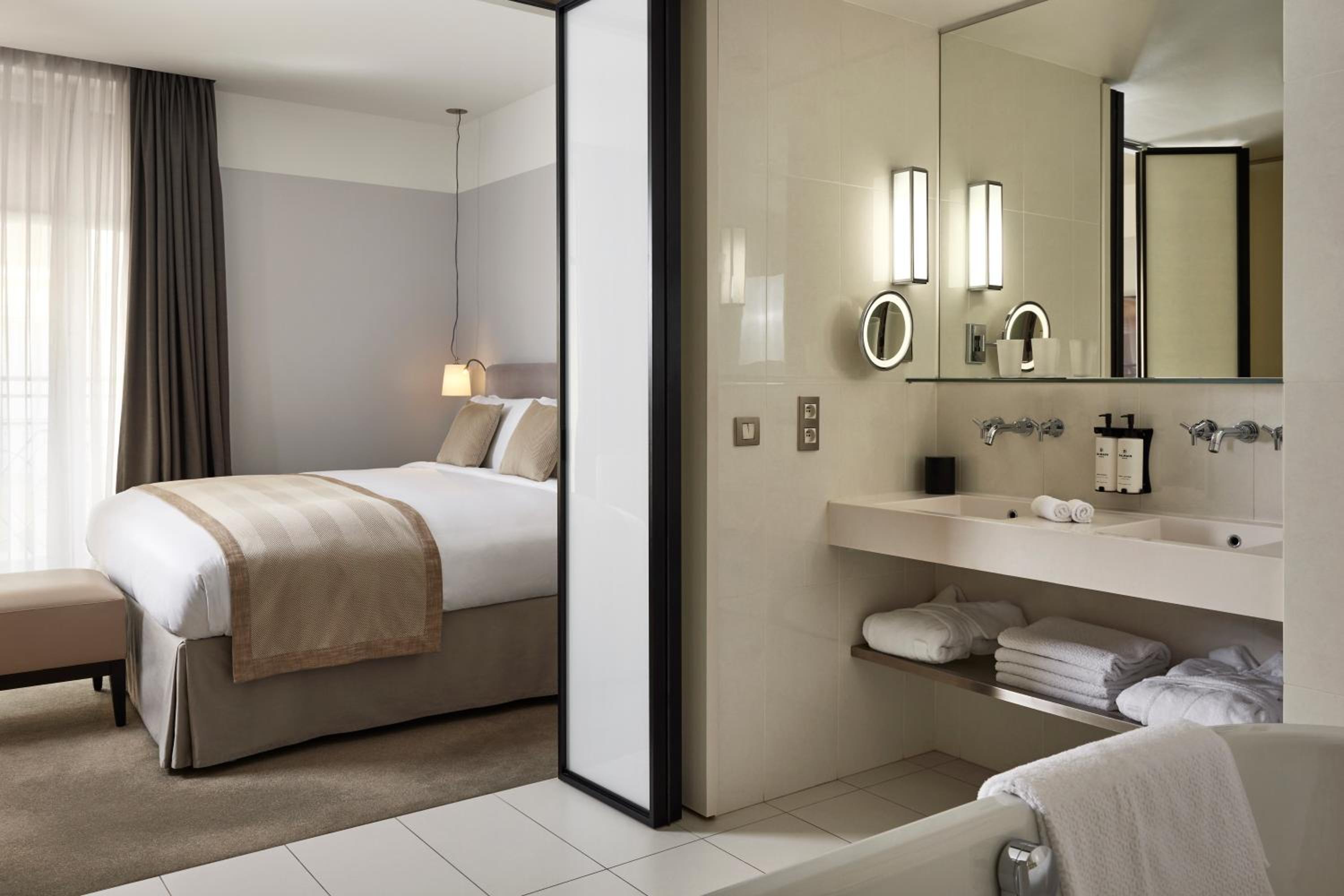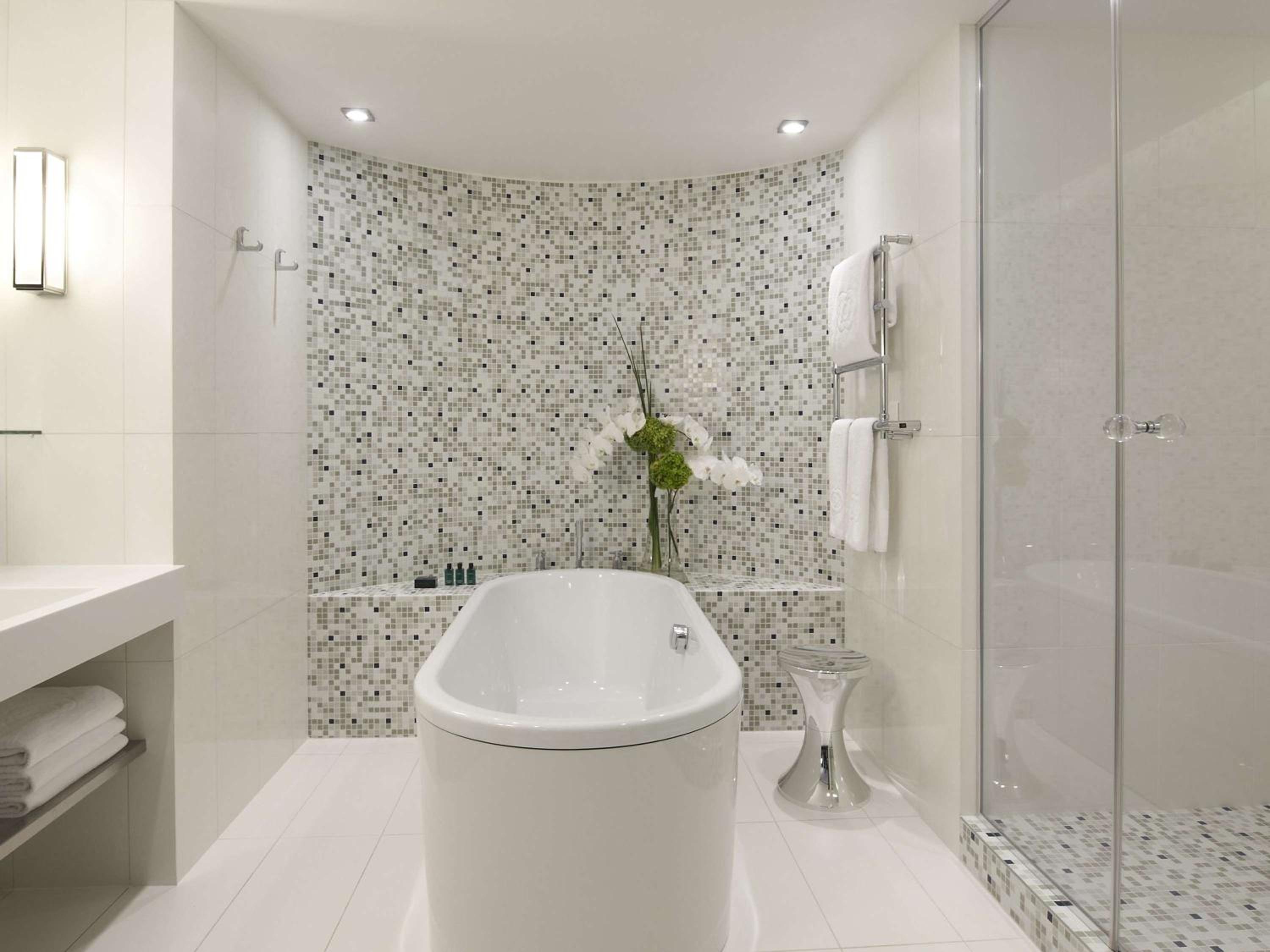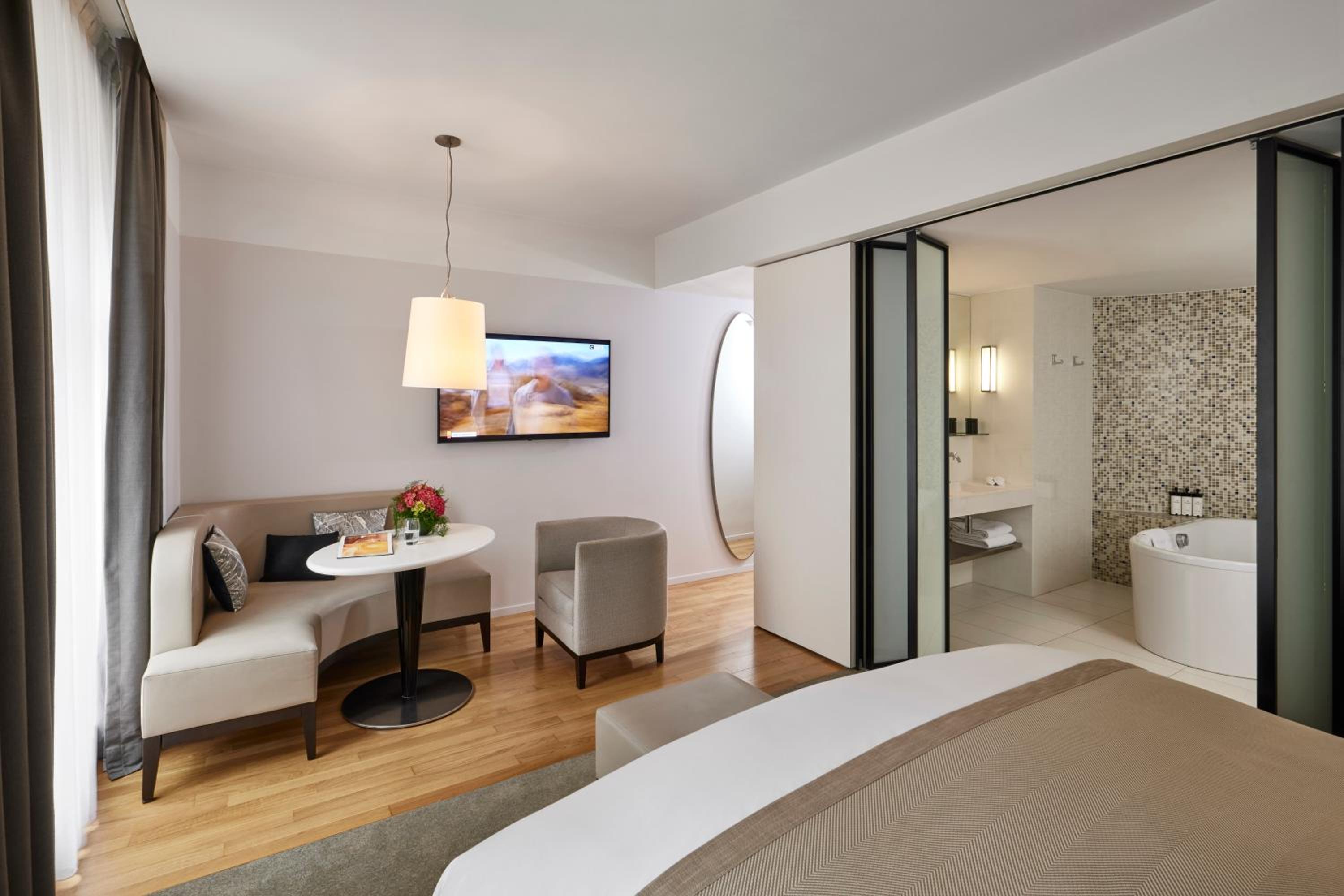 Experience contemporary design and luxury at Sofitel Paris Arc De Triomphe, located steps away from iconic landmarks. Indulge in Bose audio speakers, Nespresso machines, and Balmain toiletries in each room. The suites boast flat-screen TVs and elegant bathrooms with mosaic tiles, offering both a walk-in shower and a freestanding bath.