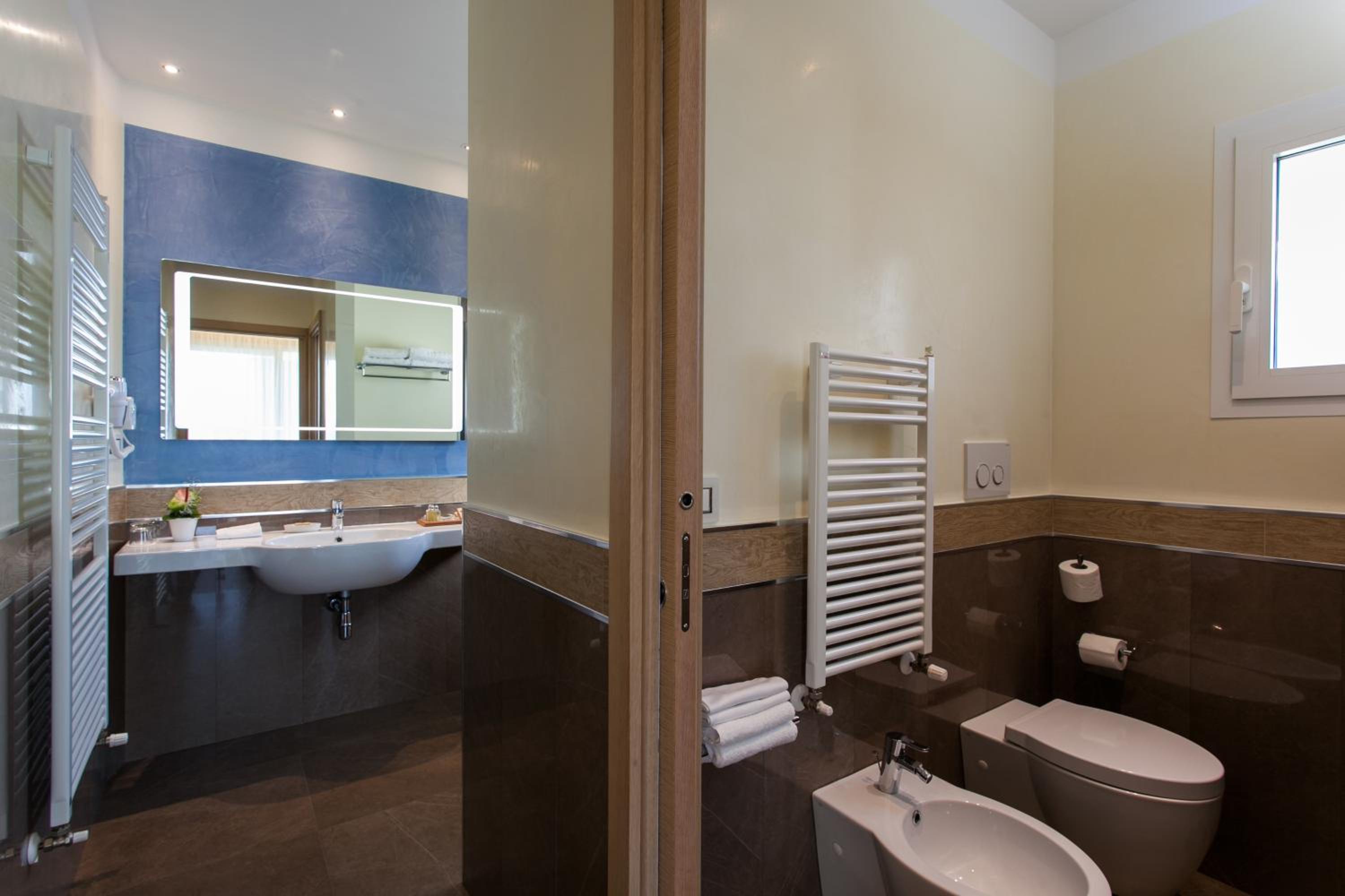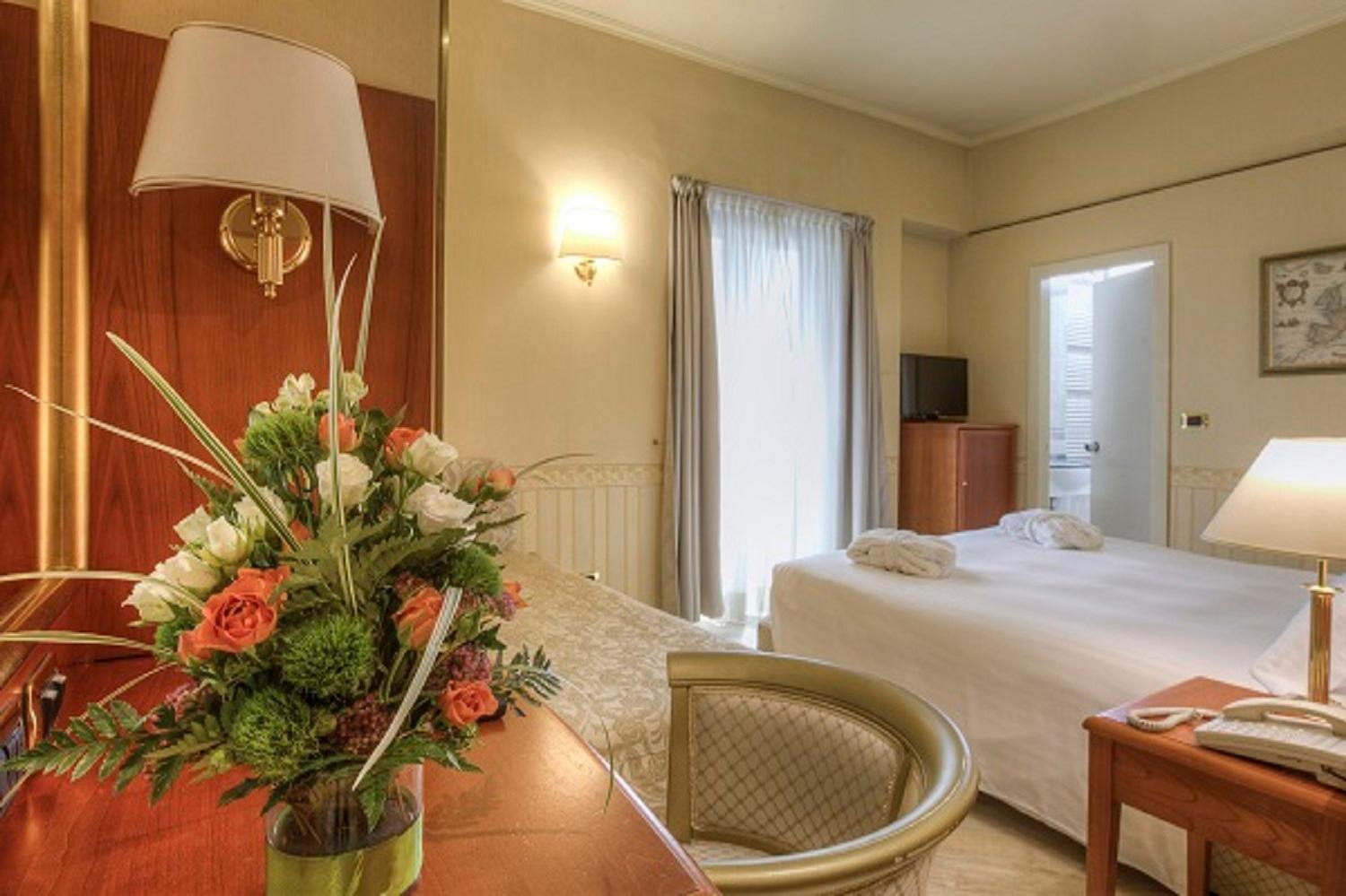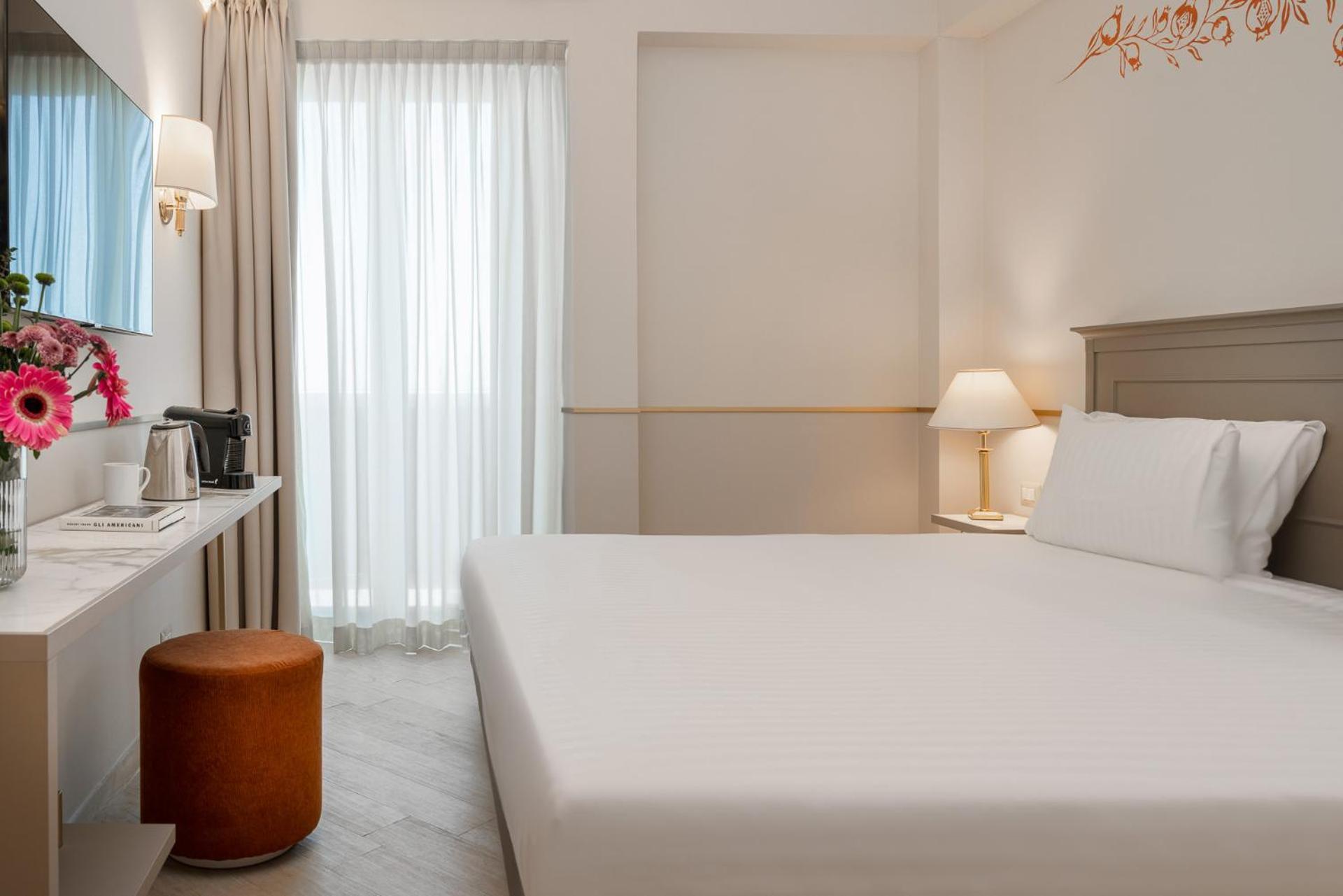 Camere Deluxe rinnovate, accoglienti e ben curate, con bagno ampio, letto matrimoniale molto confortevole con 4 cuscini e bollitore in camera, dettaglio molto apprezzato.
