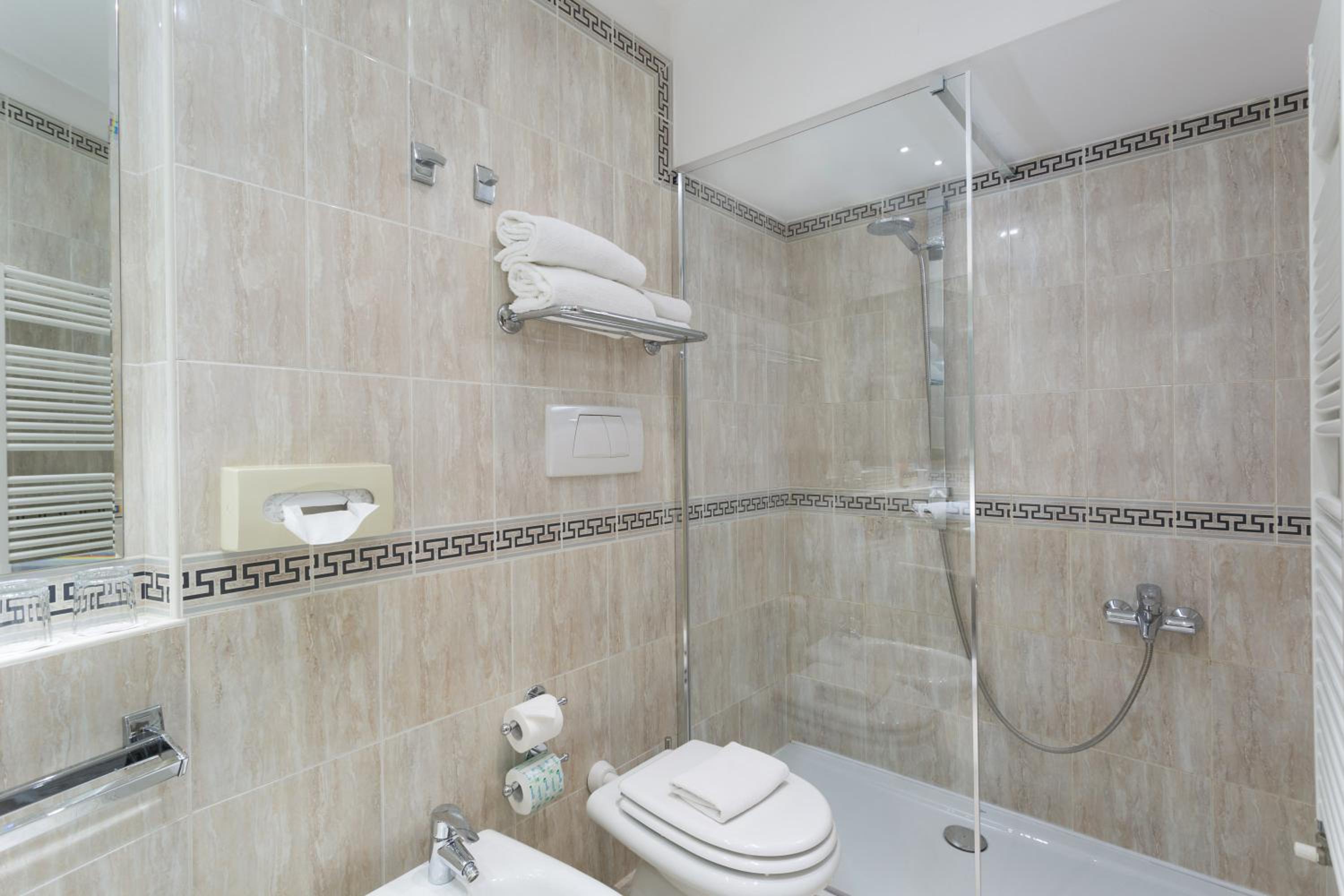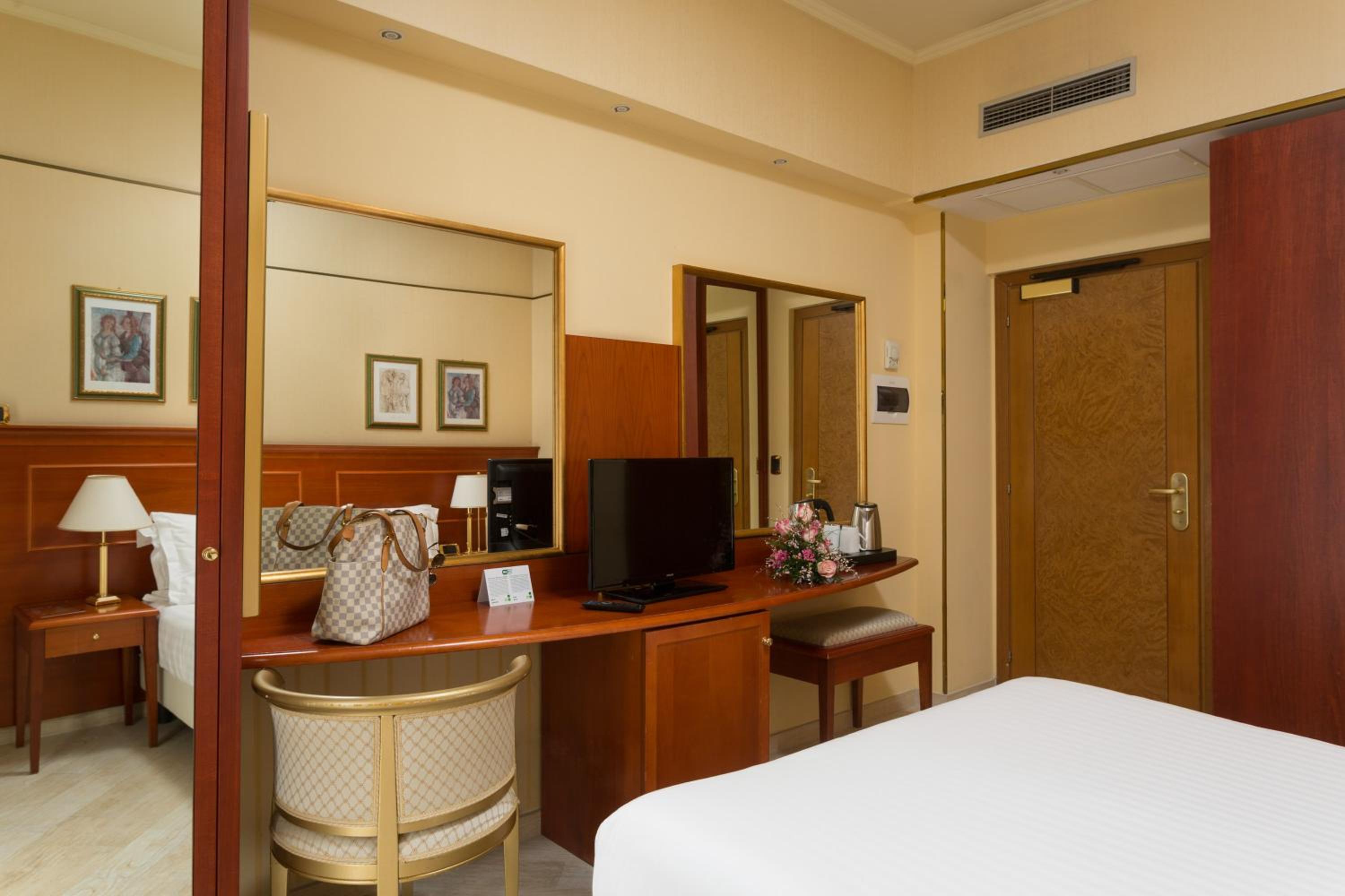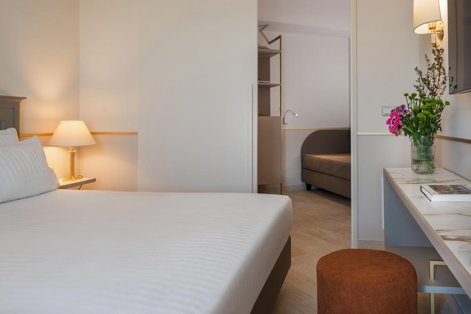 Camere Deluxe rinnovate, accoglienti e ben curate, con bagno ampio, letto matrimoniale molto confortevole con 4 cuscini e bollitore in camera, dettaglio molto apprezzato.