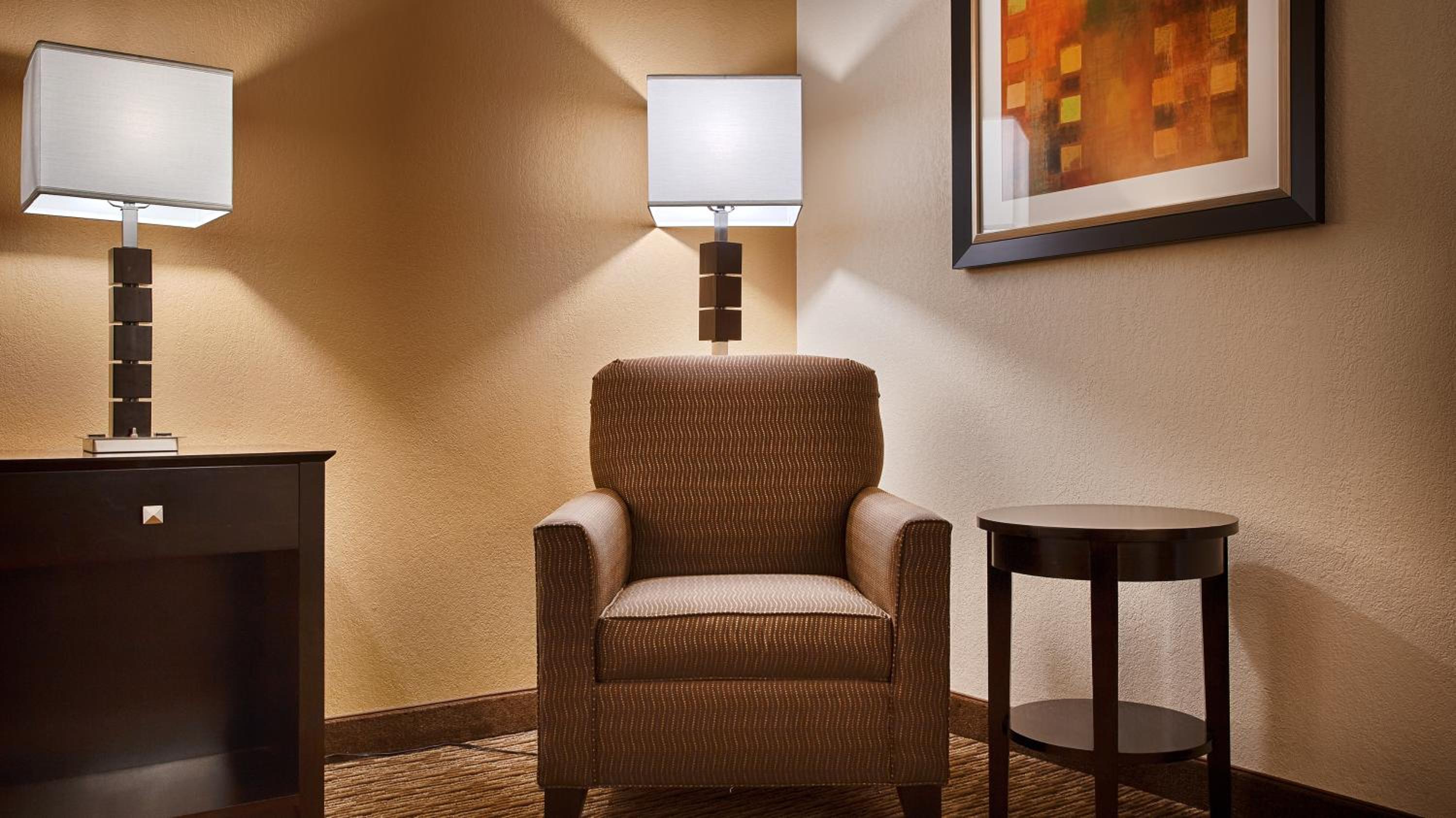 Each room at Best Western Plus Goldsboro features a flat-screen TV with Pay-Per-View, a microwave, refrigerator, and a sleek en suite bathroom for ultimate comfort.