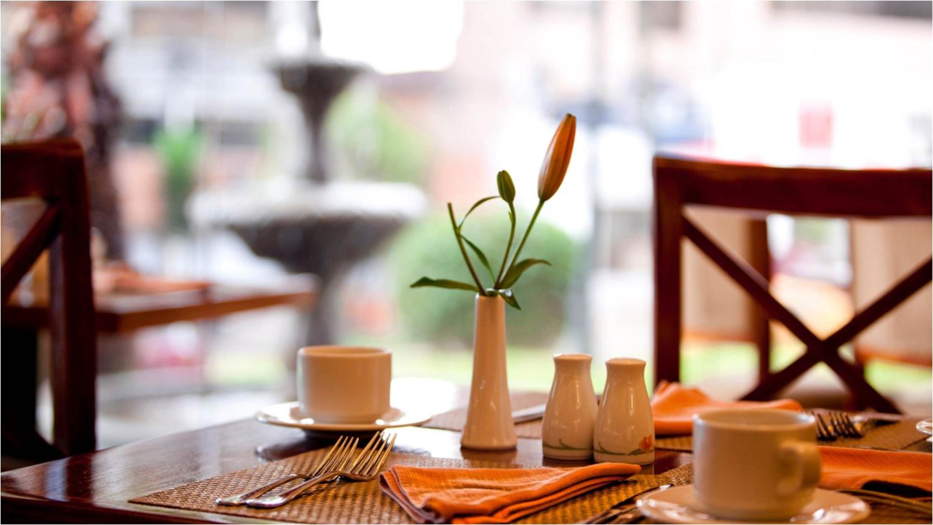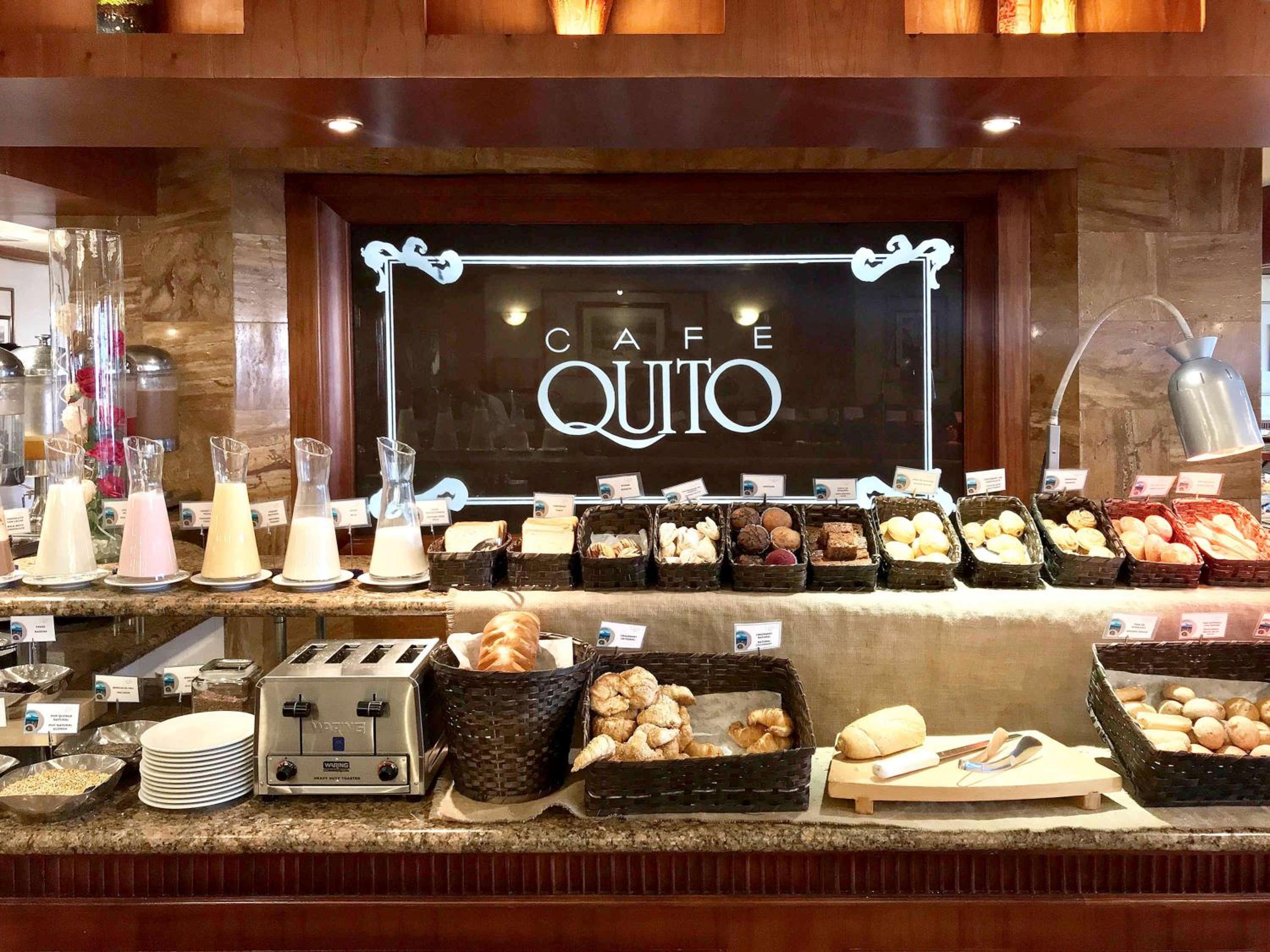 Drinks and “snack dinner” in the bar with an inexpensive red wine, meat and cheese board, and Jamon pizza (which we could only eat half). Breakfast buffet was very well presented with a variety of regular and Ecuadorian foods! The room was nicely kept and we slept well. I disagree with a previous review which said the beds were too hard! Enjoy!!!