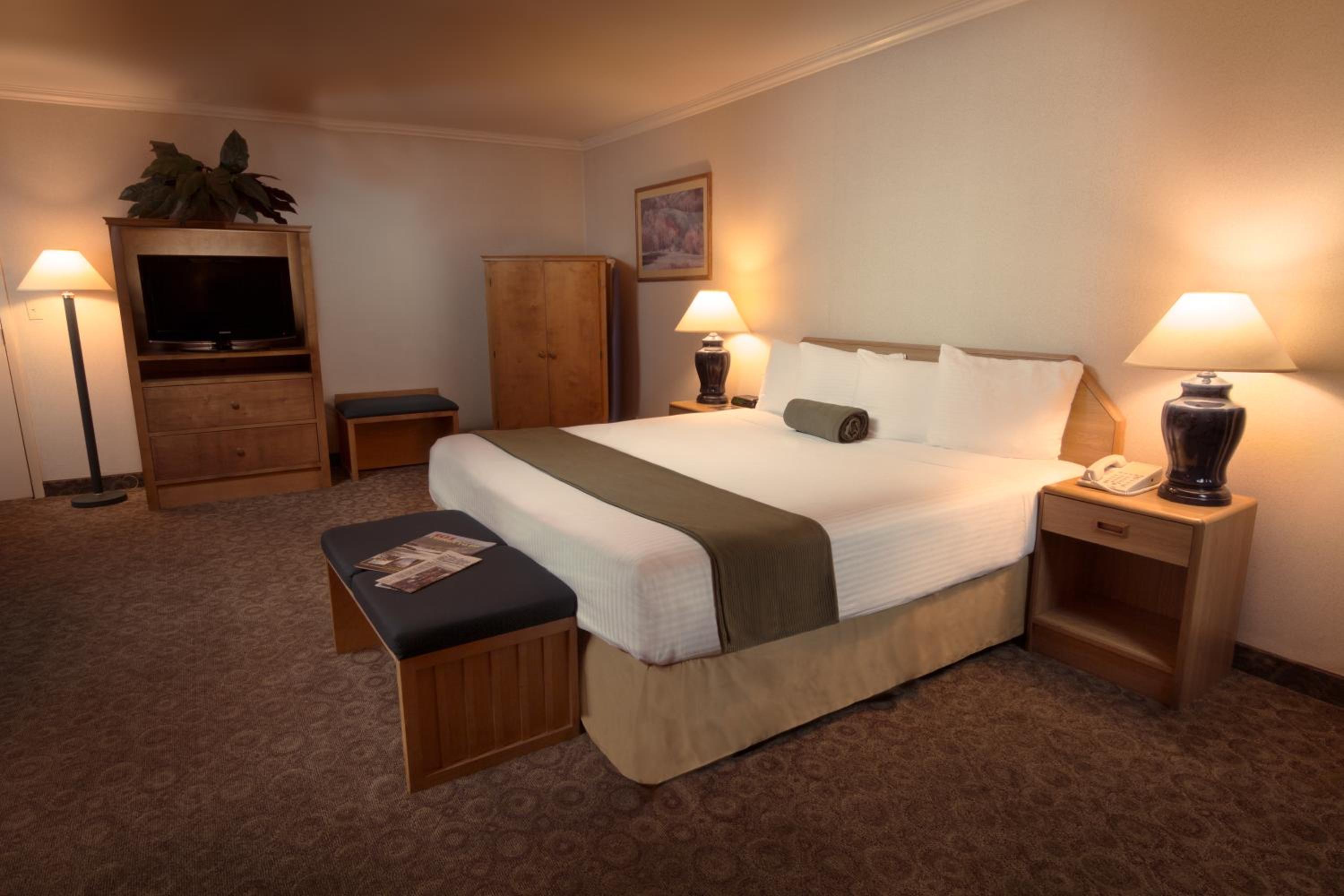 Luxurious Accommodations: The Redwood Fortuna Riverwalk Hotel offers spacious rooms with free WiFi, cable TV, and convenient amenities like a microwave, refrigerator, and coffee maker.