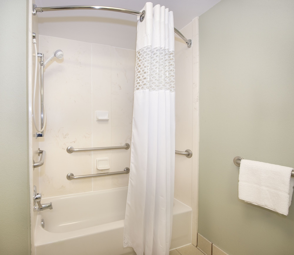 The bathroom was well lit. The shower head probably had the strongest flow rate of any hotel in the last 16 days on the road. I loved it! However, my wife said it was too hard, and there was not a position on the shower head that made it soft enough for her. The lavatory appeared to have a fine crack at the bottom of the sink. Possible maintenance issue.