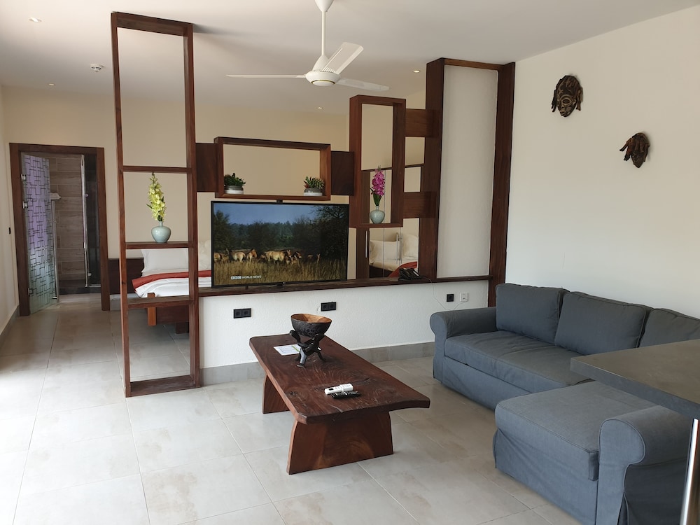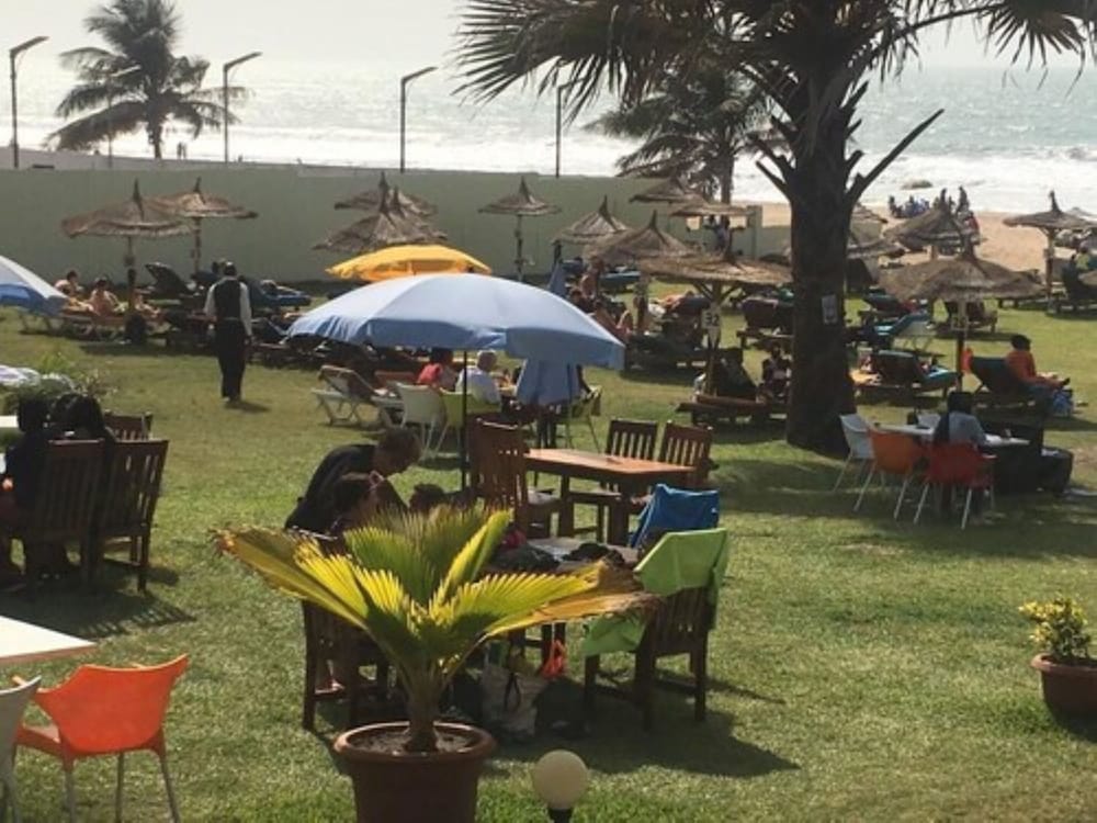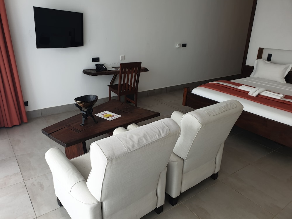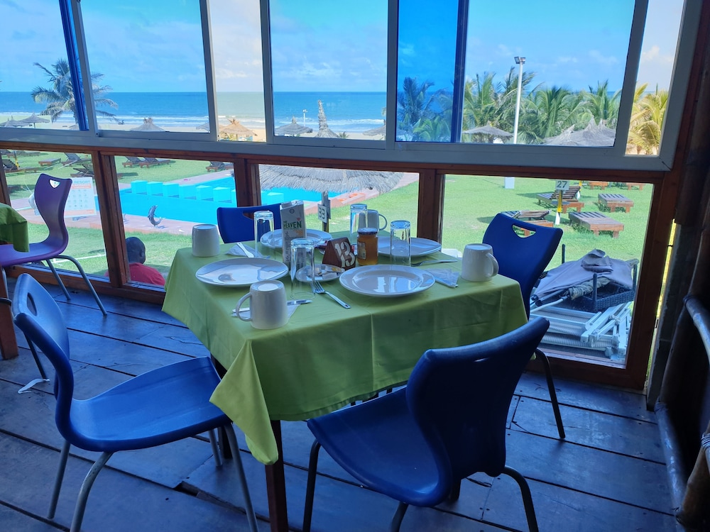 The interior decor of the hotel was very nice and the room and bathroom nicely designed but ants, spiders and cockroaches also lived there. I got food poisoning from room service with 24 hours of immediate vomiting of their benachin dish and 72 hours of diarrhea. Their breakfast was so so but their customer service left a lot to be desired. The beach at the bottom of the steps leading from the hotel had dogs pooping near the water, boys washing sheep in the ocean and cows wandering around. Very unsightly eyesore.. Yuck.