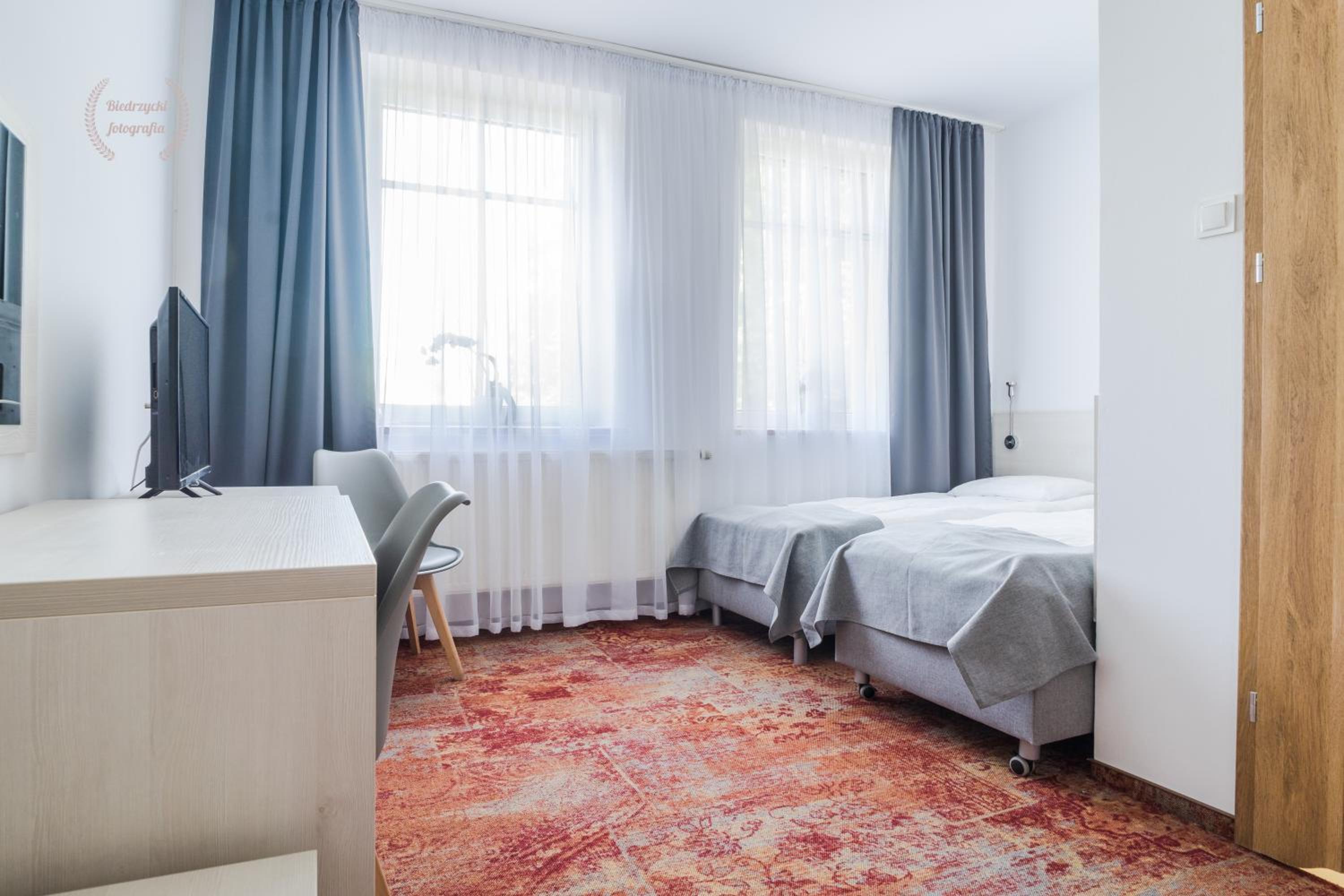 Each room at Hotel Warmia Spa is equipped with modern amenities such as a flat-screen TV, private bathroom with bathrobes, and some rooms even feature a balcony or terrace exit. The cozy and well-appointed rooms ensure a comfortable stay for all guests.