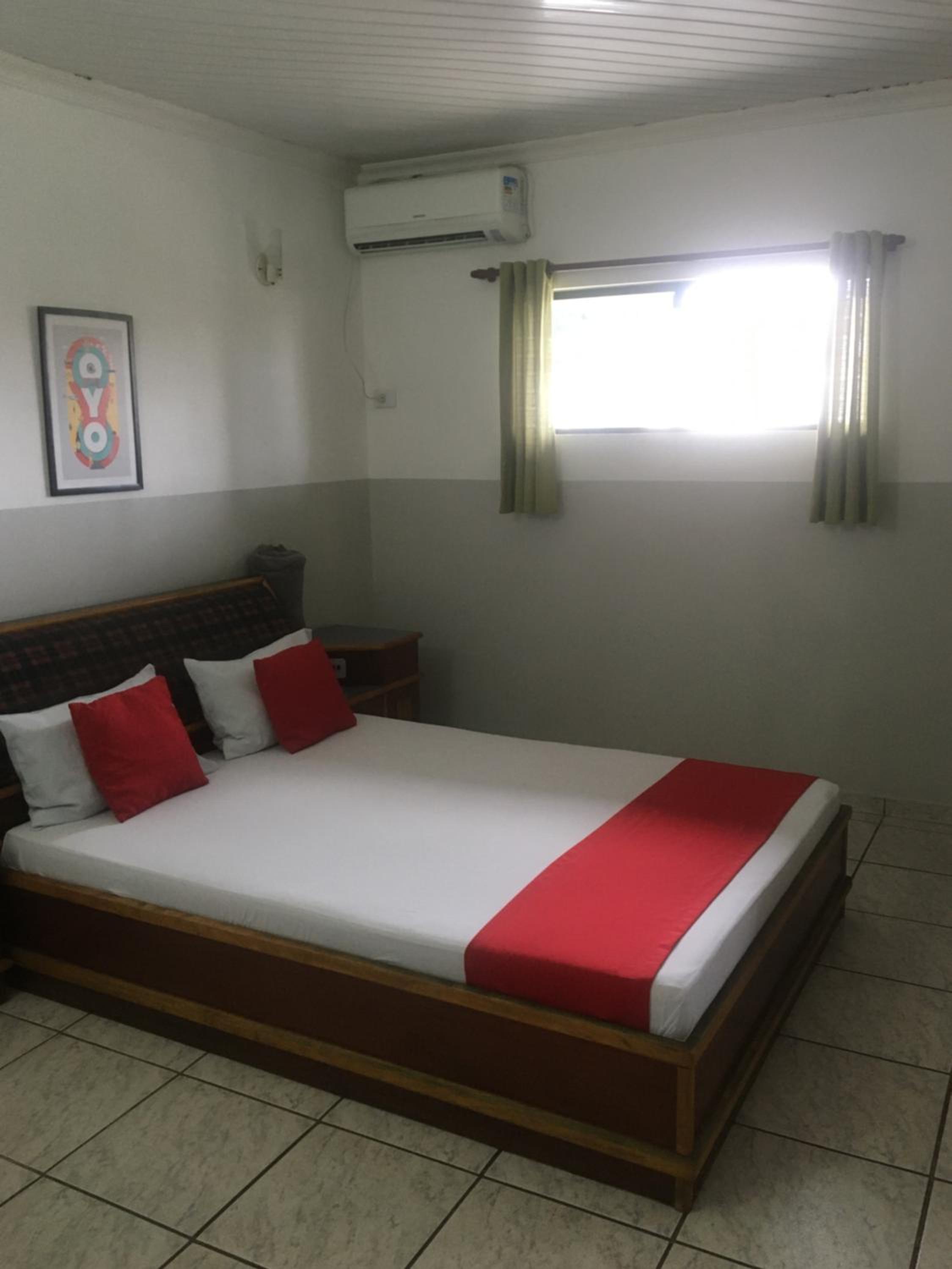 Lugar simples com ar condicionado e tv com vários canais.