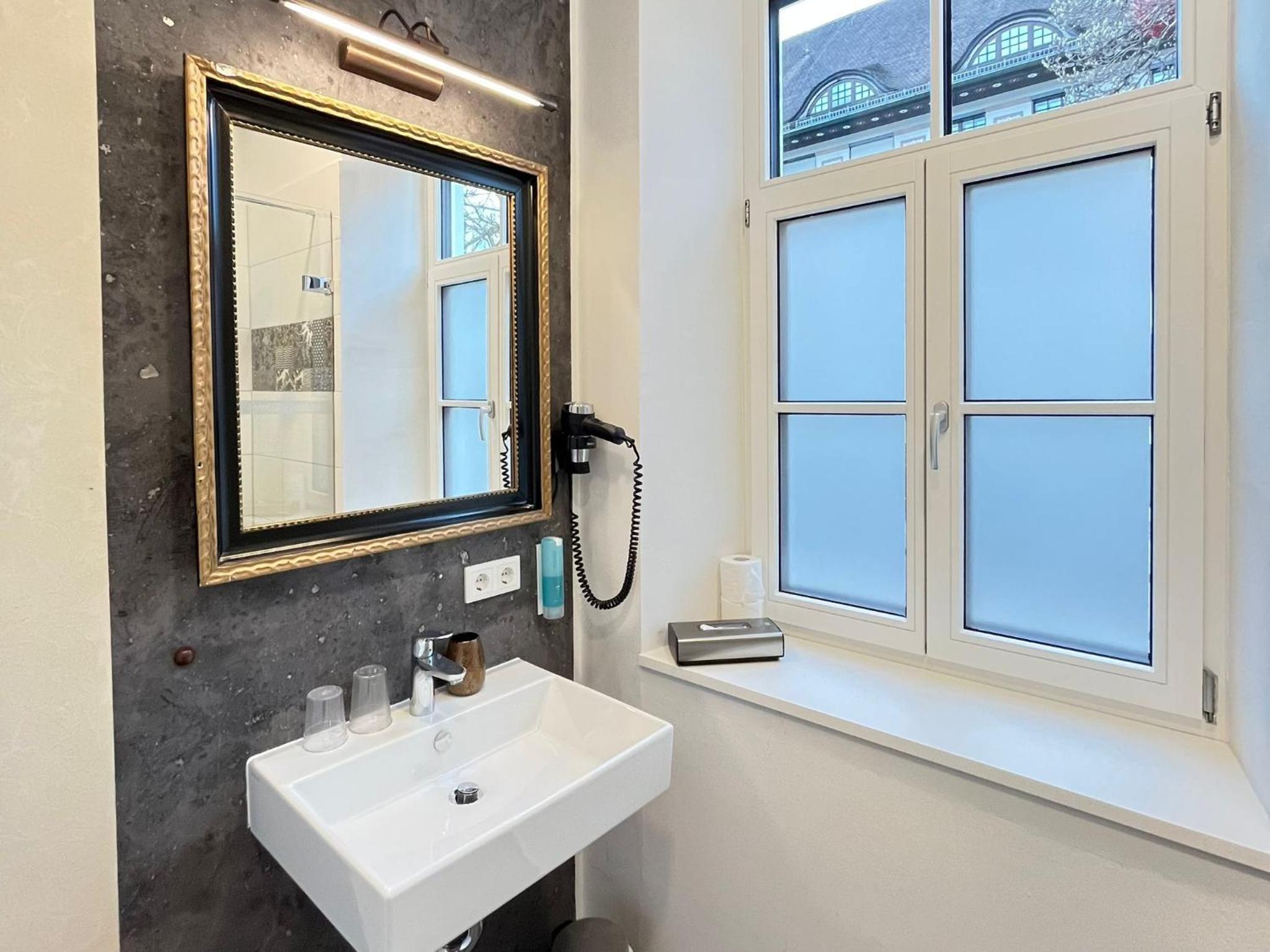 Lage ist gut, Parkplätze vorhanden. Super schönes geräumiges Bad!