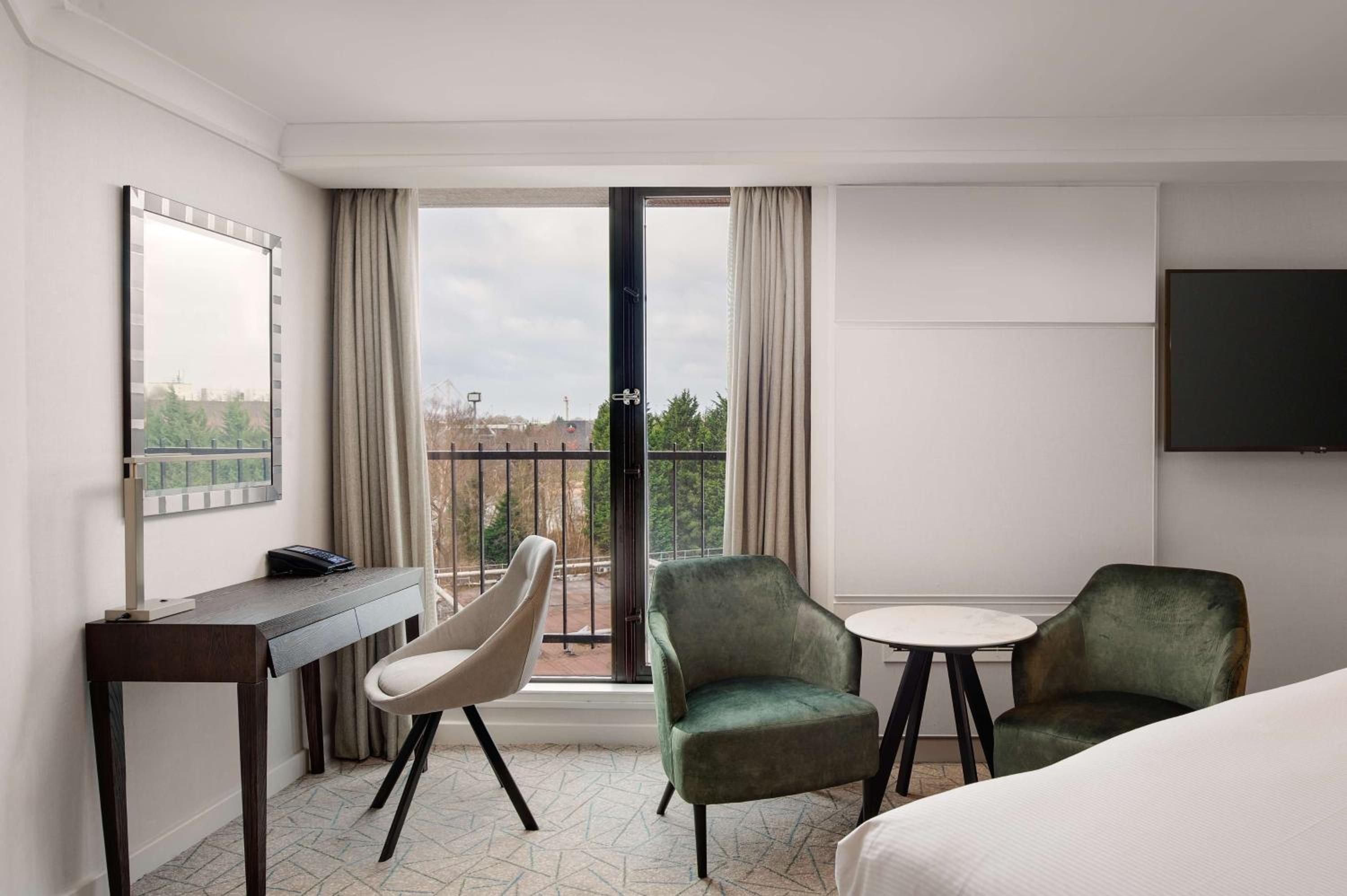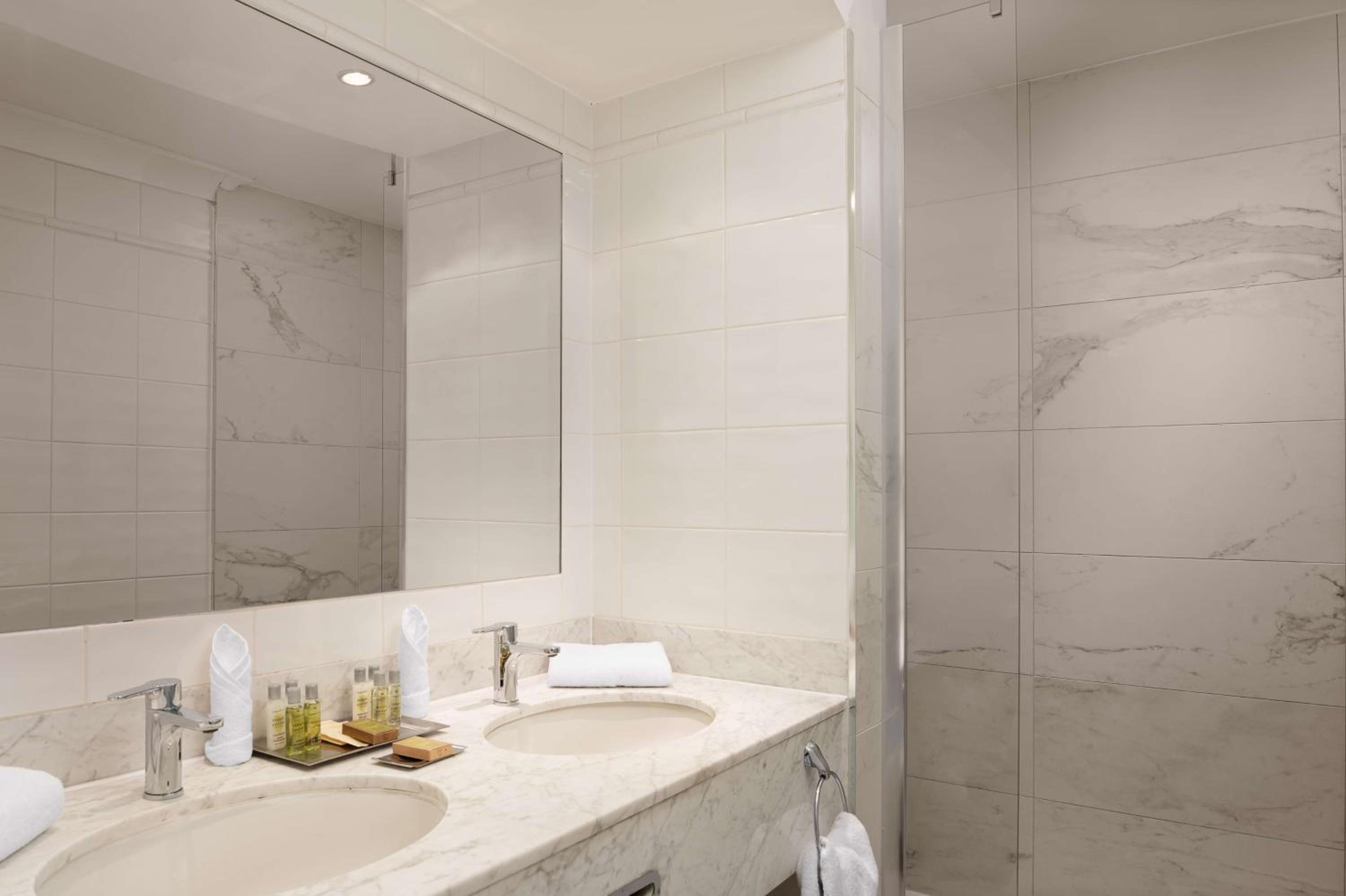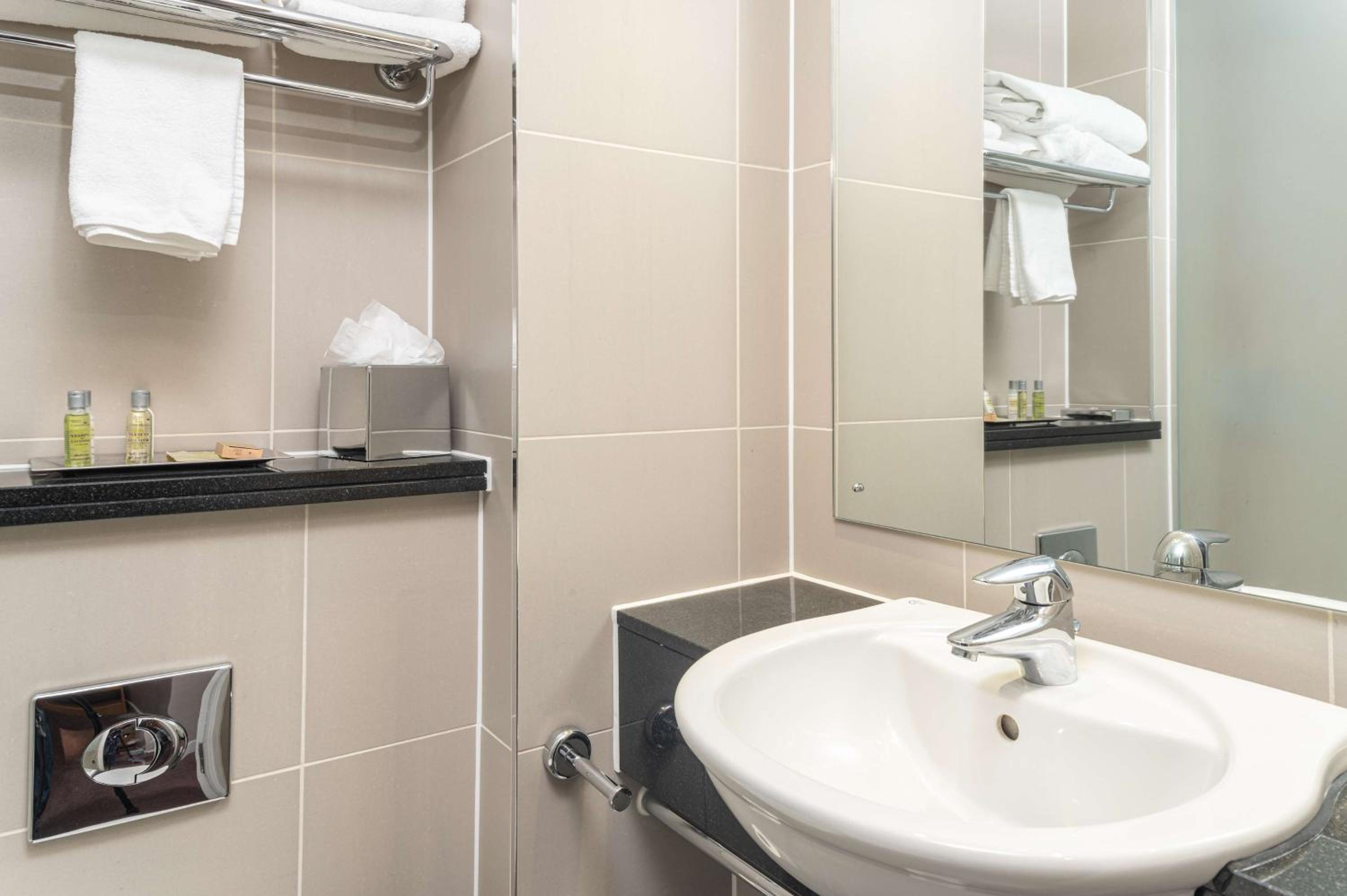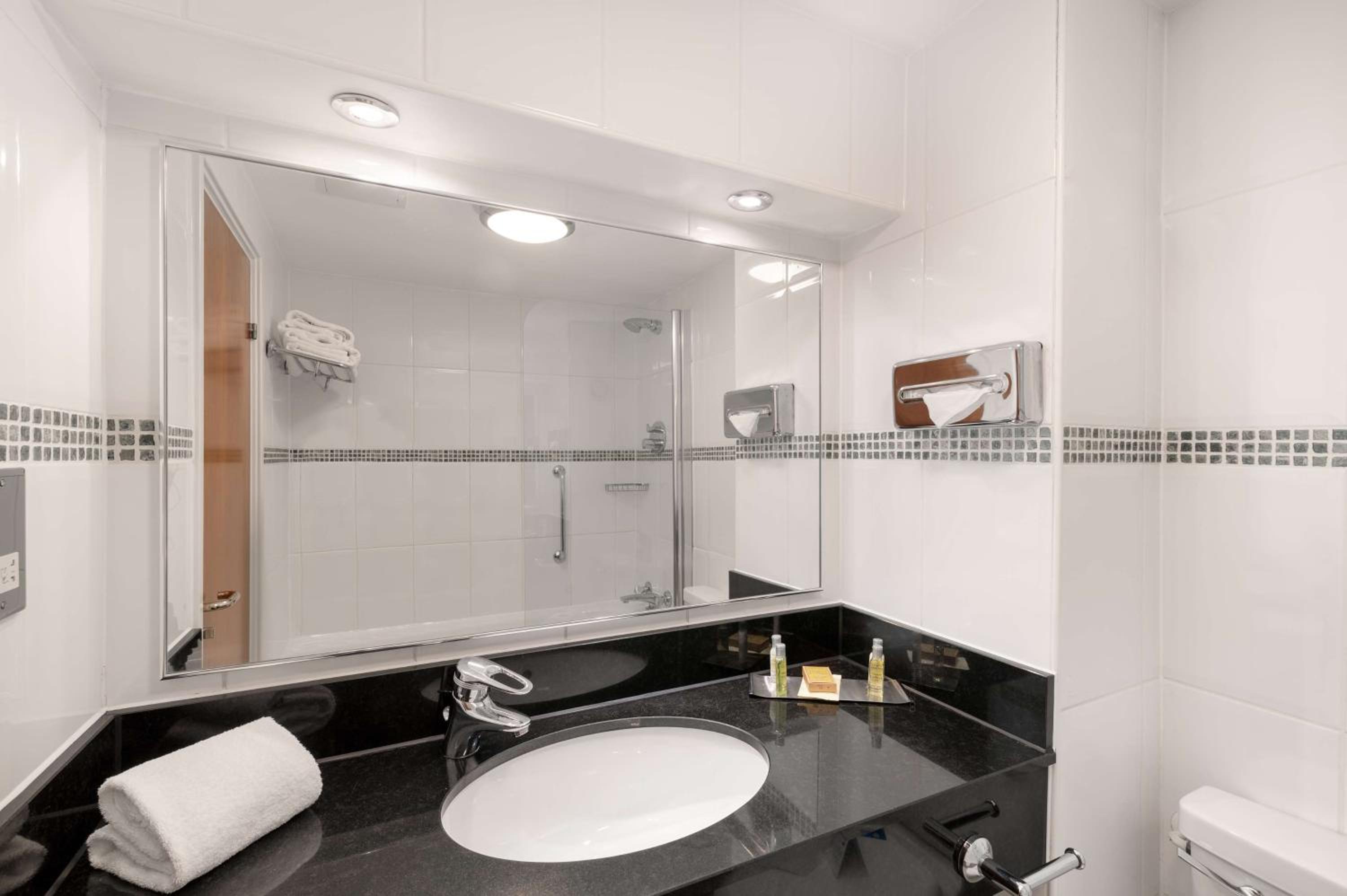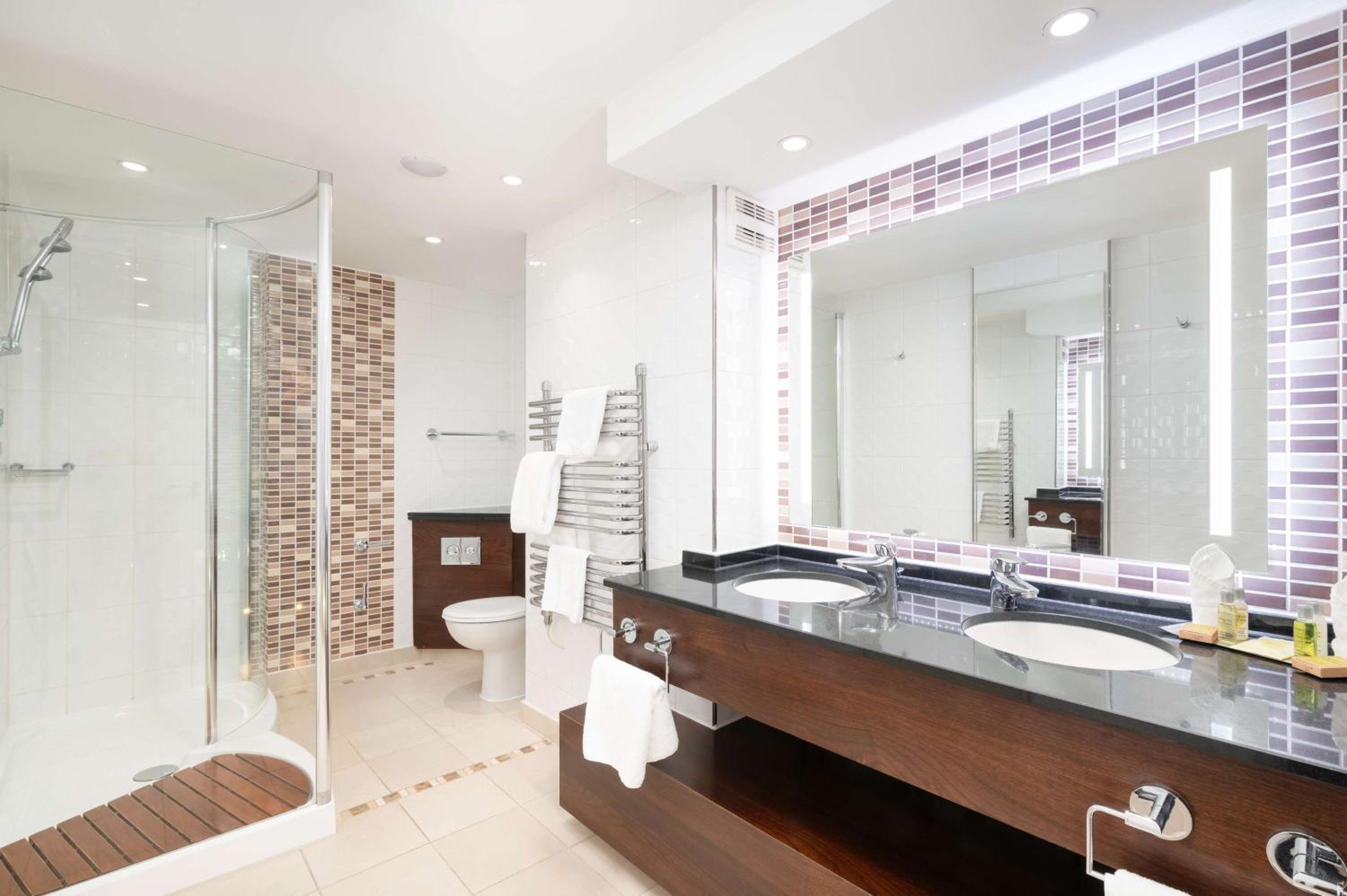 Indulge in modern comfort at the Hilton Birmingham Metropole with stylish rooms featuring floor-to-ceiling windows and elegant decor. Relax in the bathrooms equipped with baths and showers for a rejuvenating experience.
