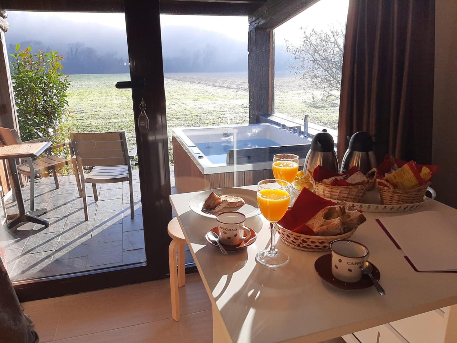 El jacuzzi enorme con la luz que aporta el cristal lateral,la habitación,el desayuno,el zumo de naranja recién exprimido,una maravilla.